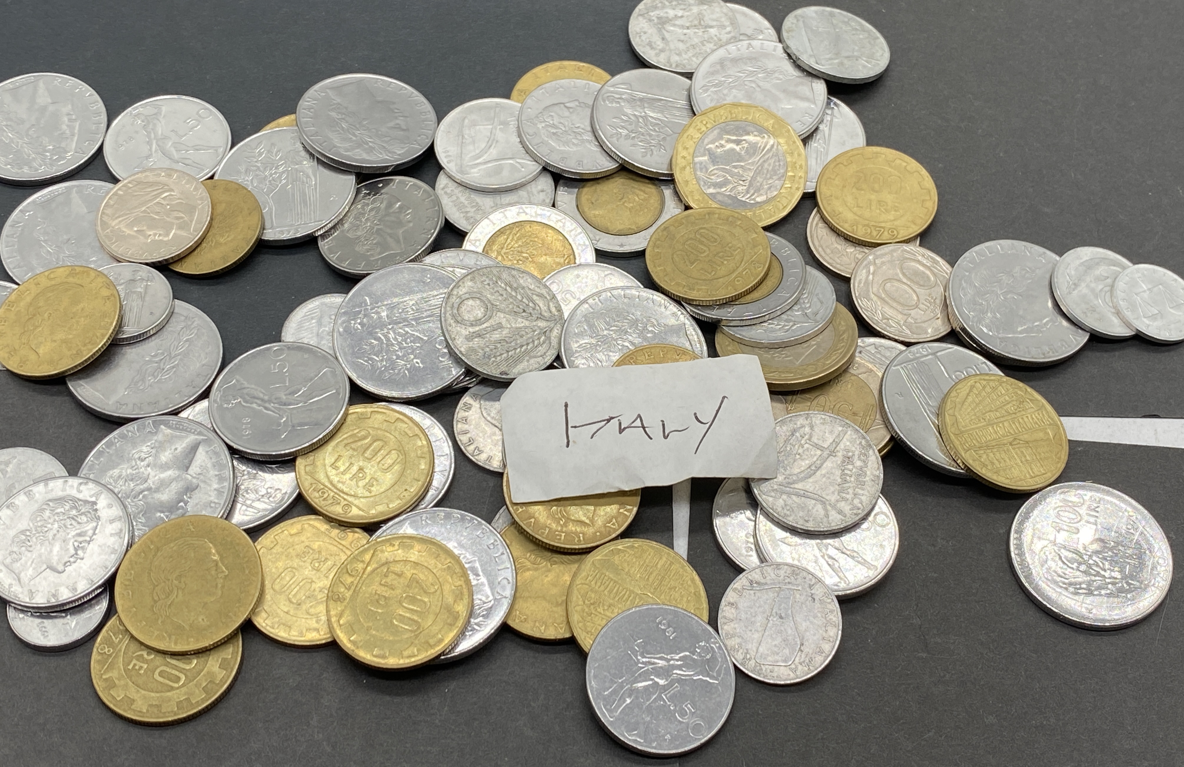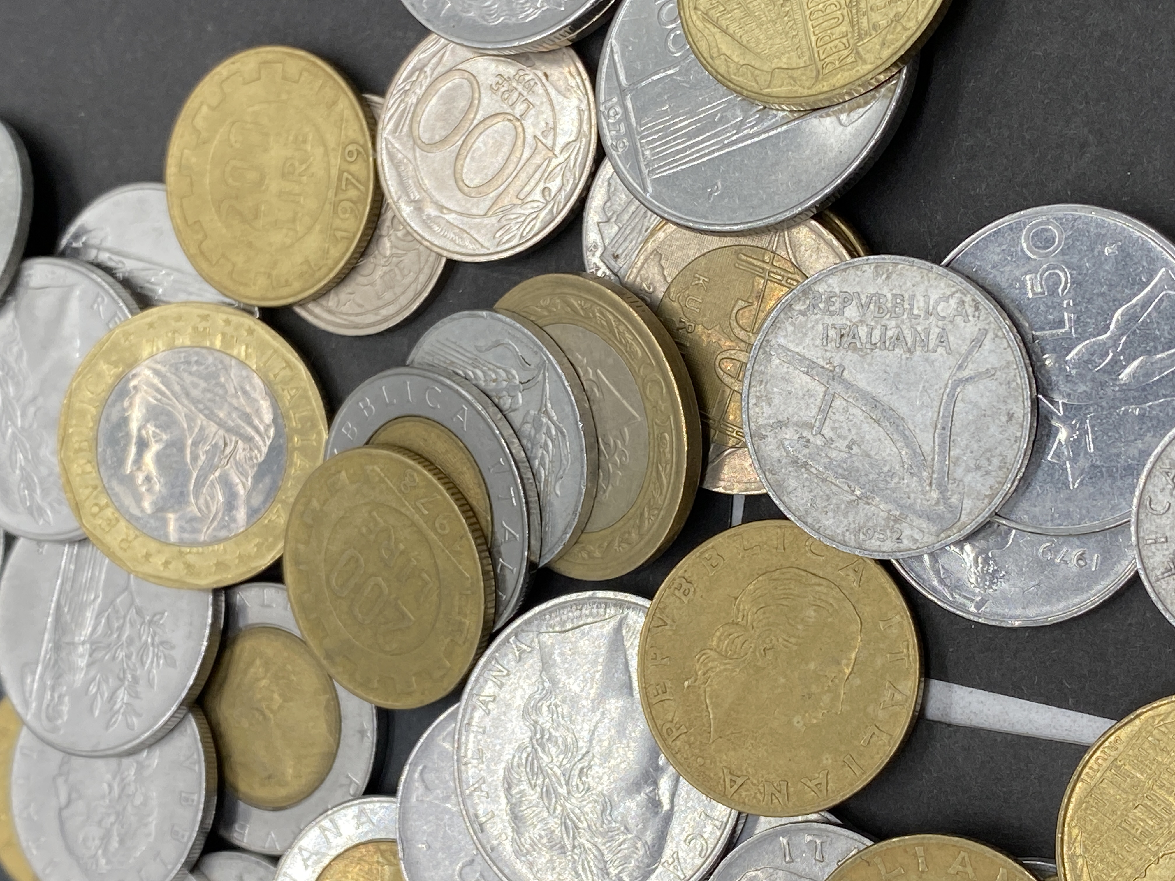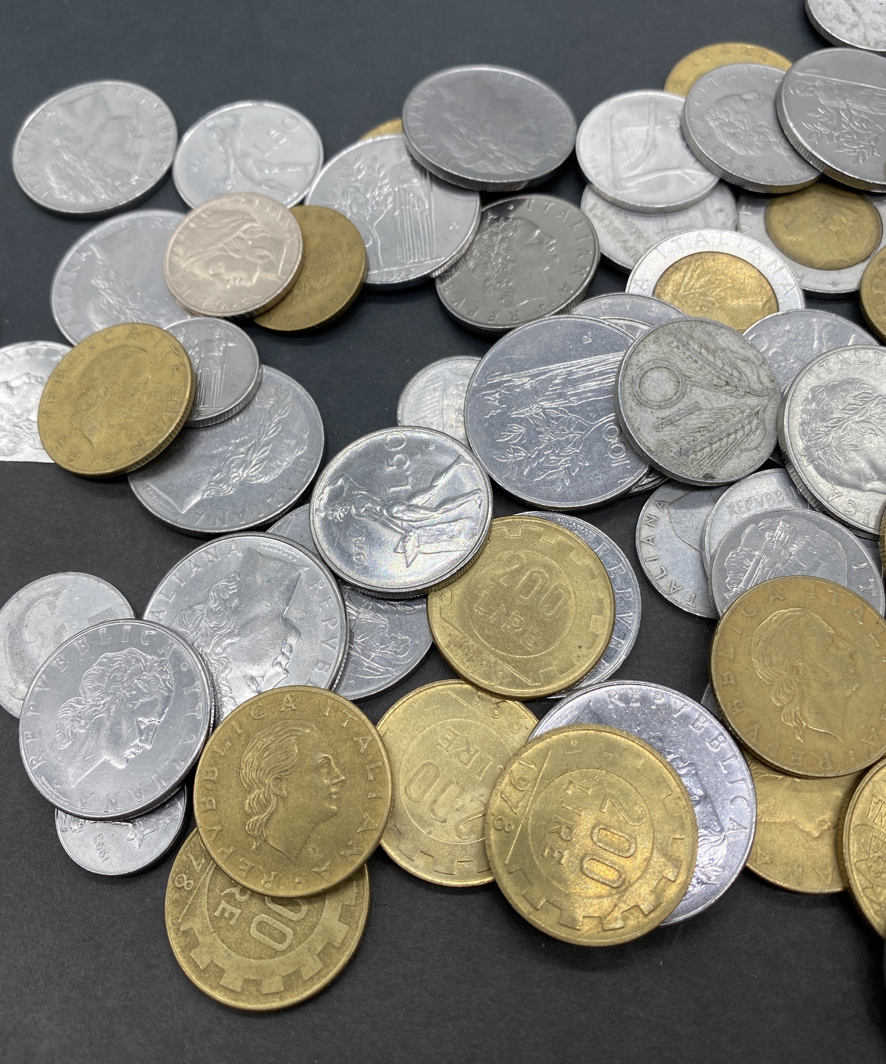 A pile of assorted Italian lira coins in various denominations.