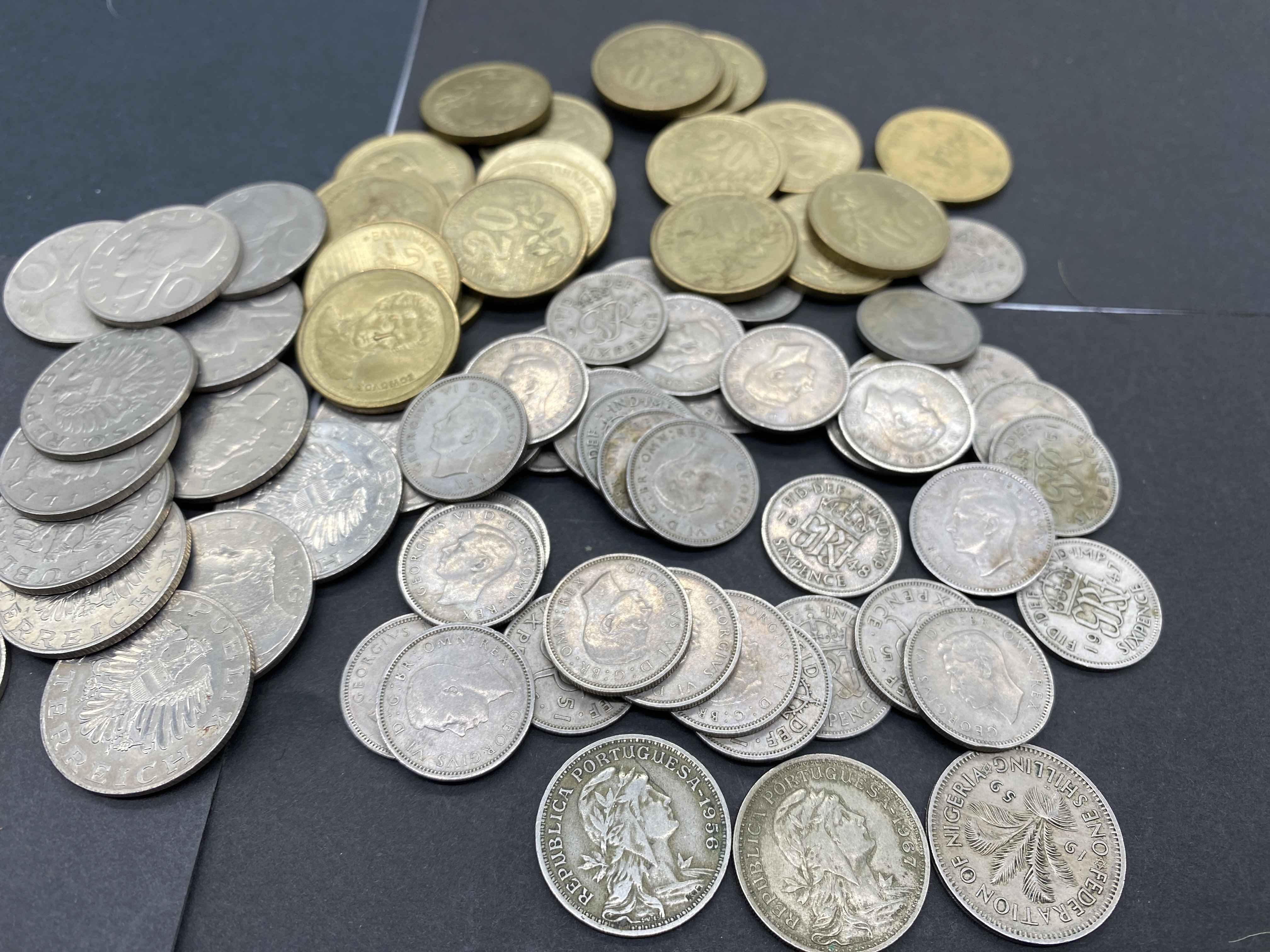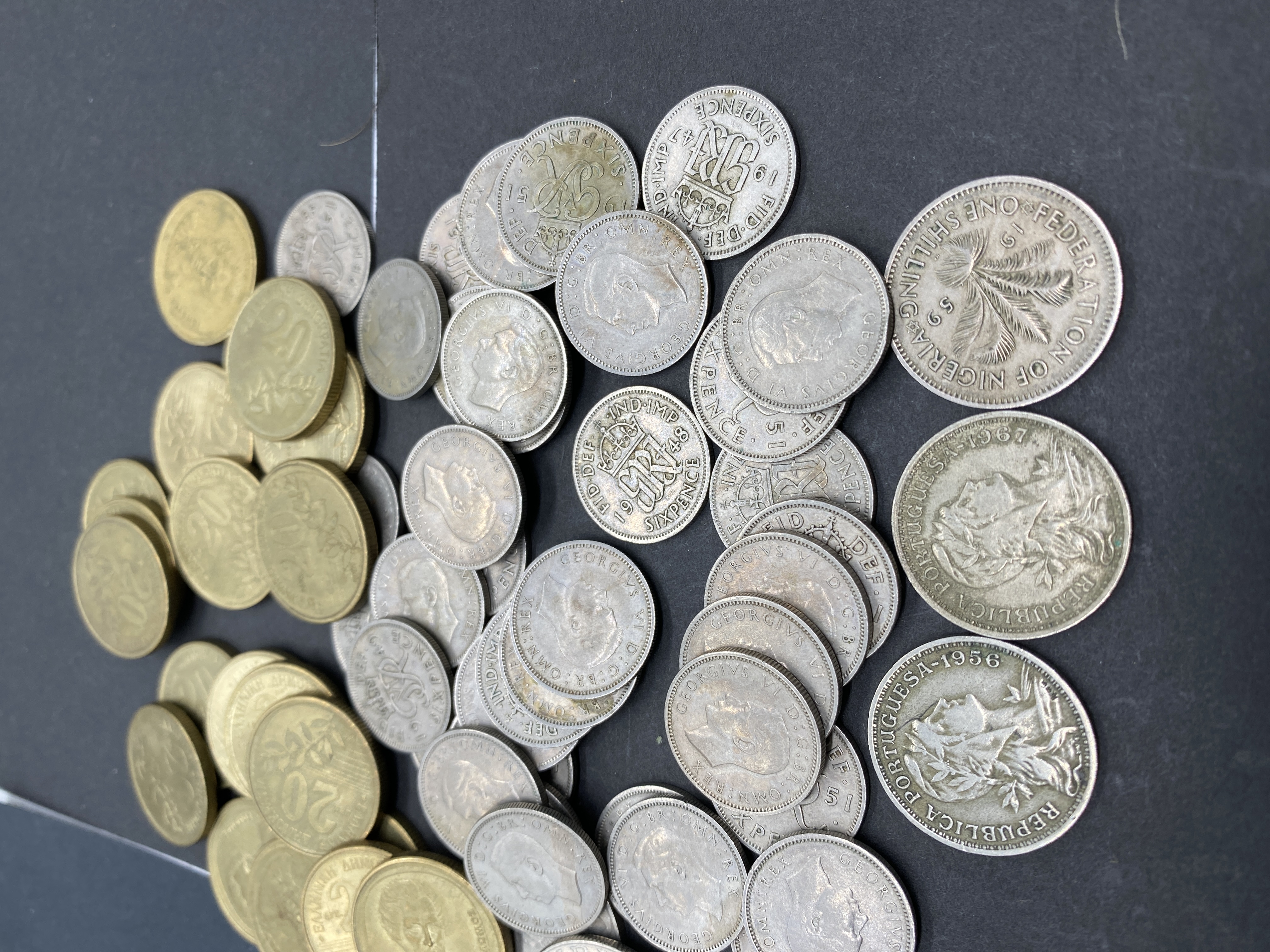 A collection of various silver and gold coins.