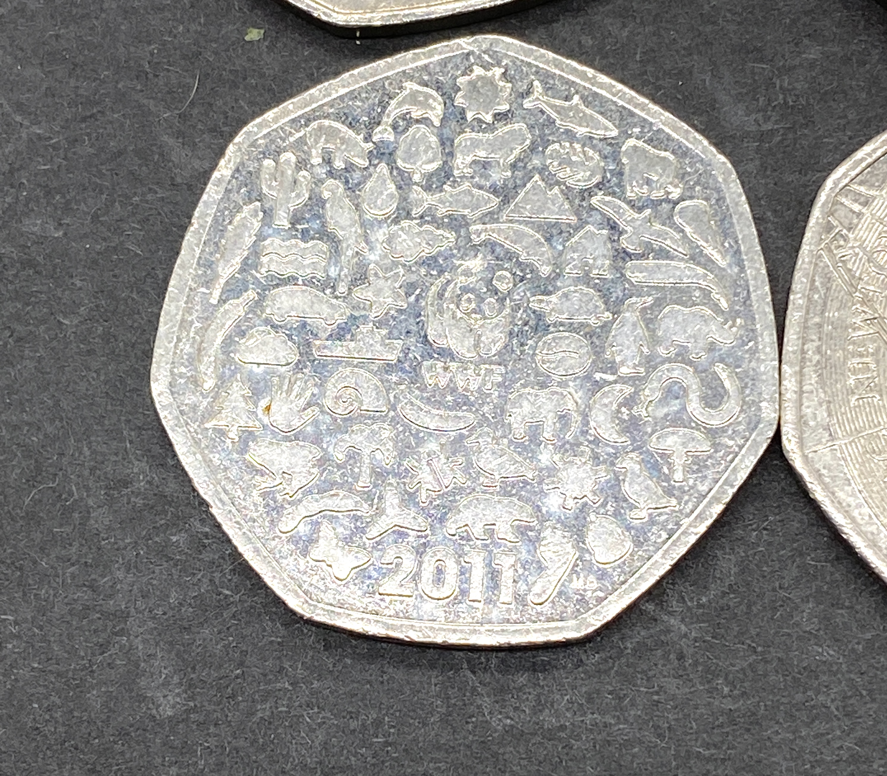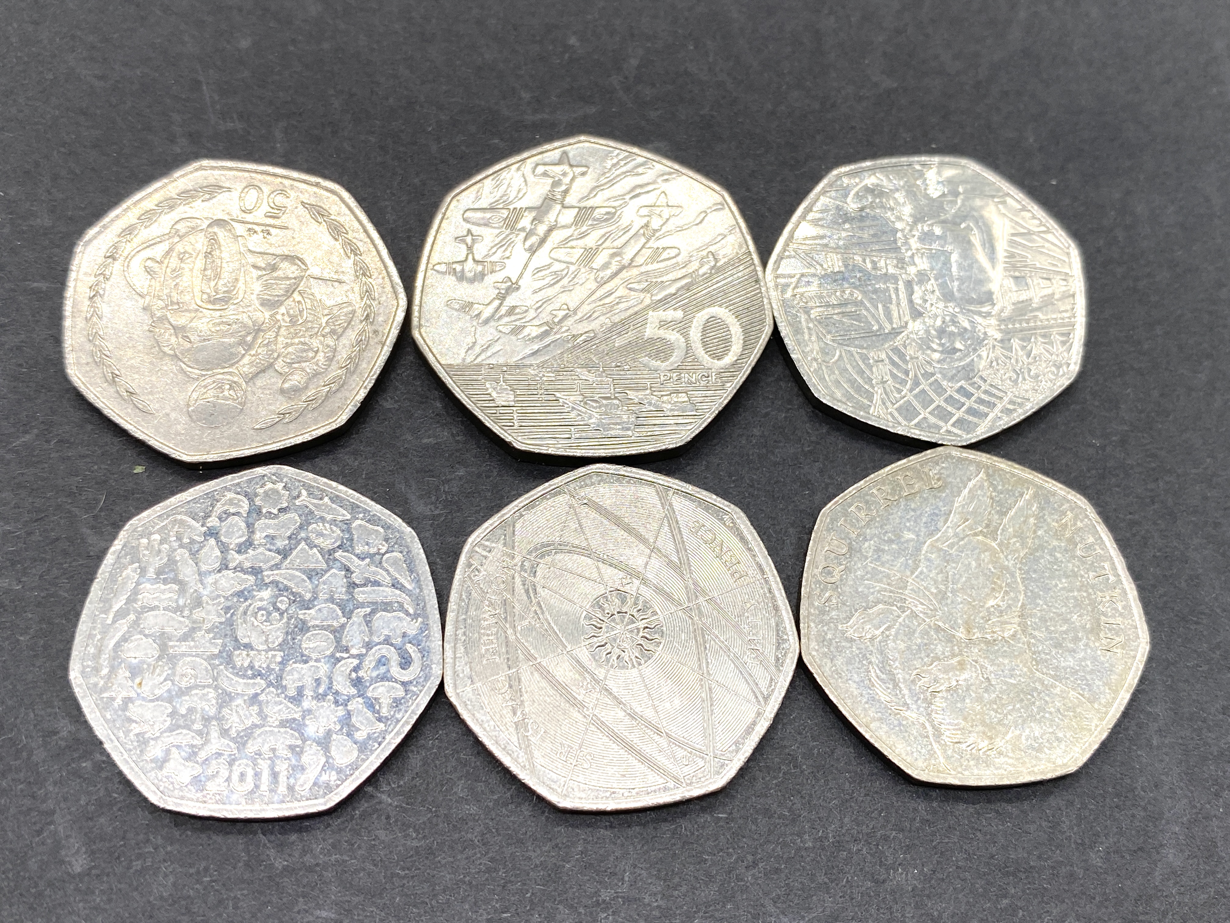 Six silver-colored British 50 pence coins, including a 2017 Sir Isaac Newton 50p coin.