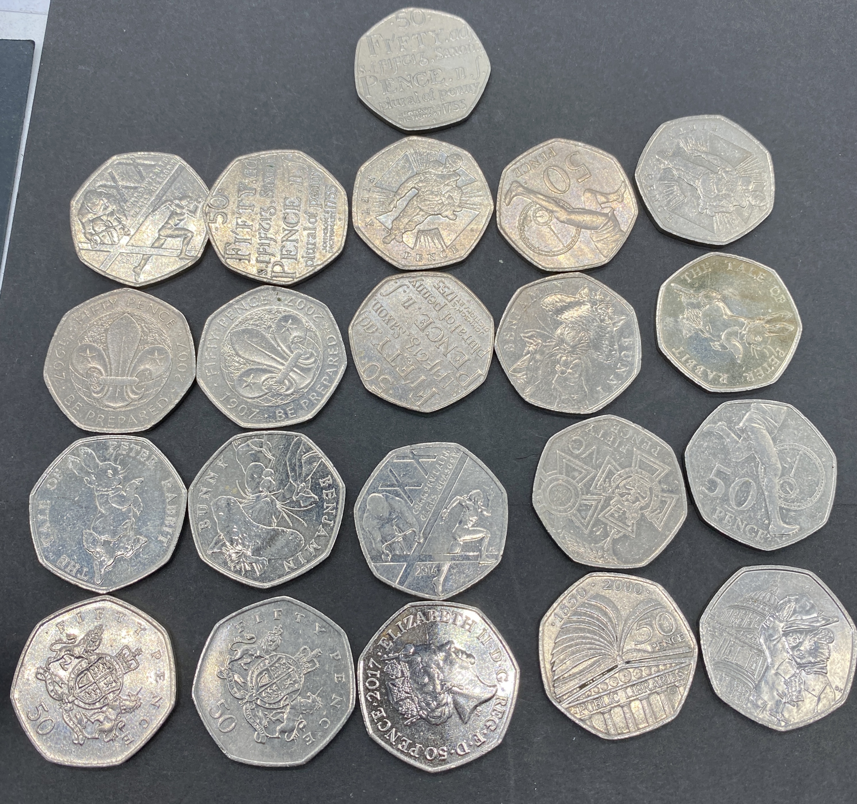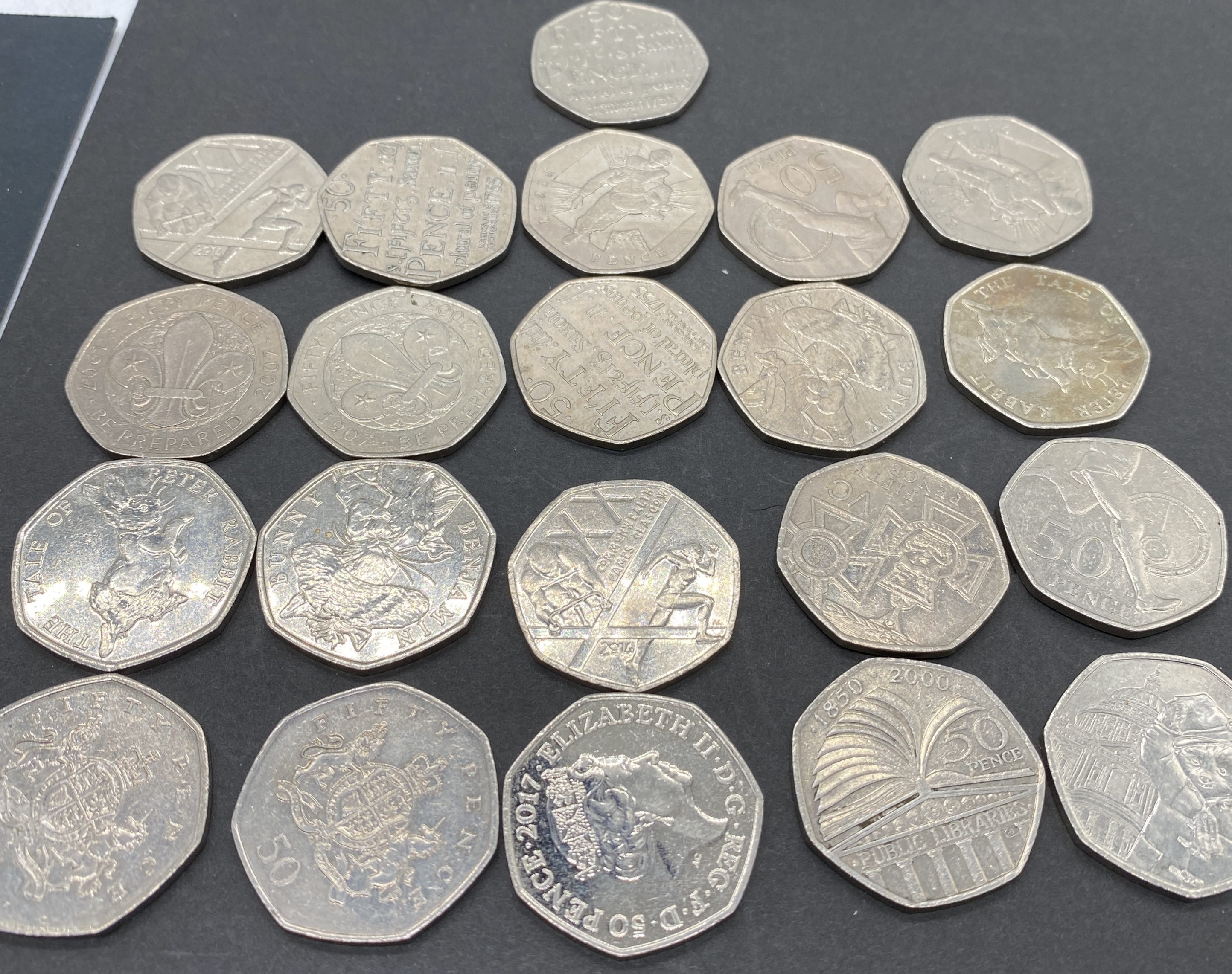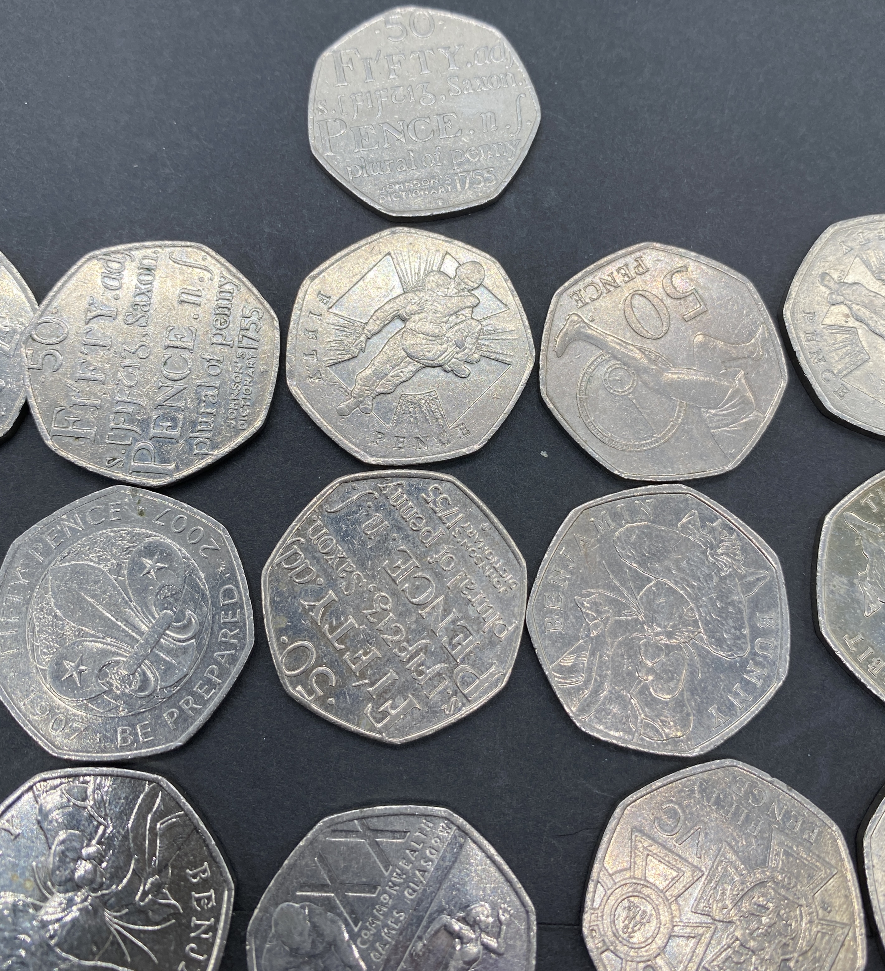 A collection of various commemorative British 50 pence coins.