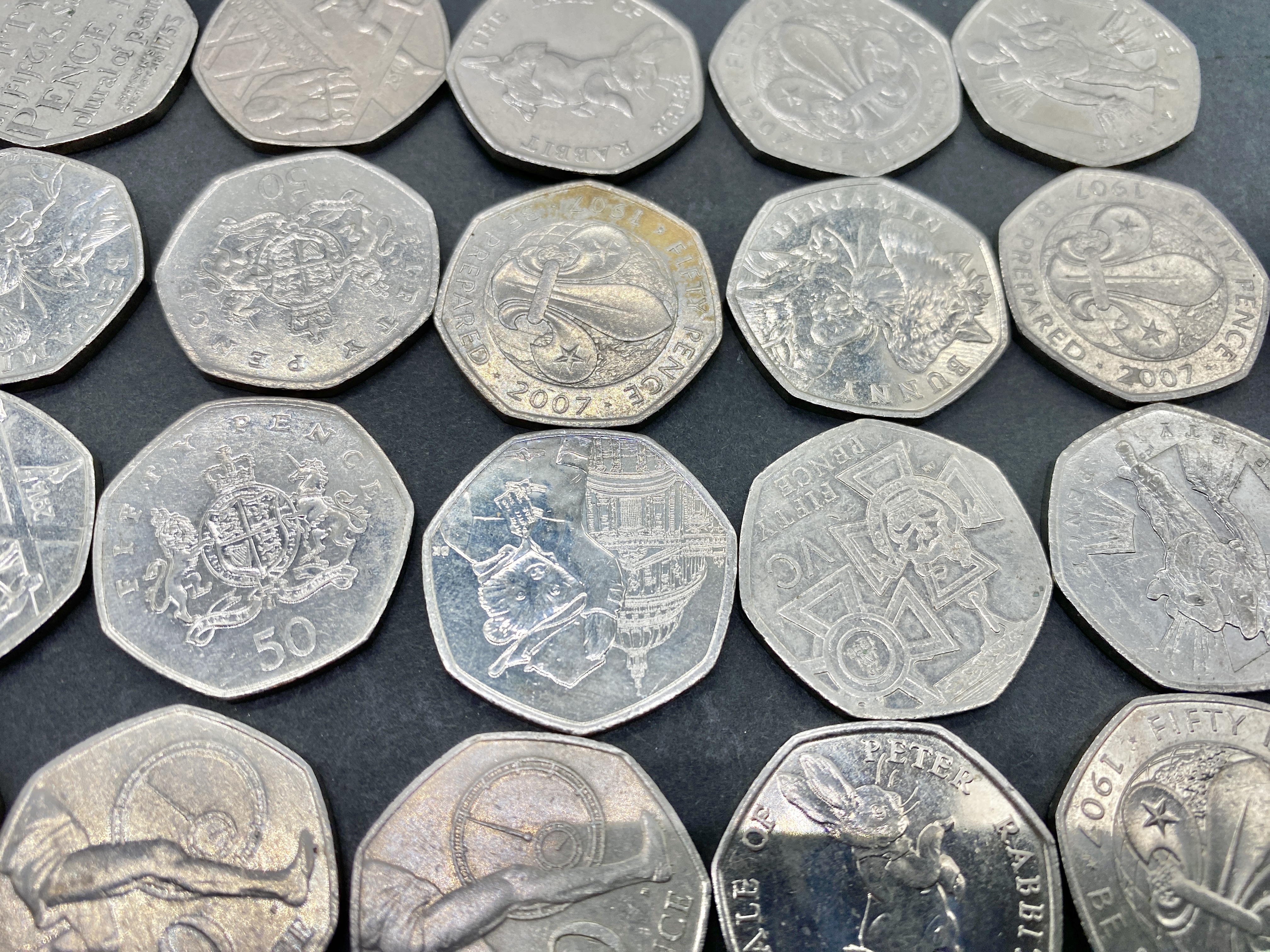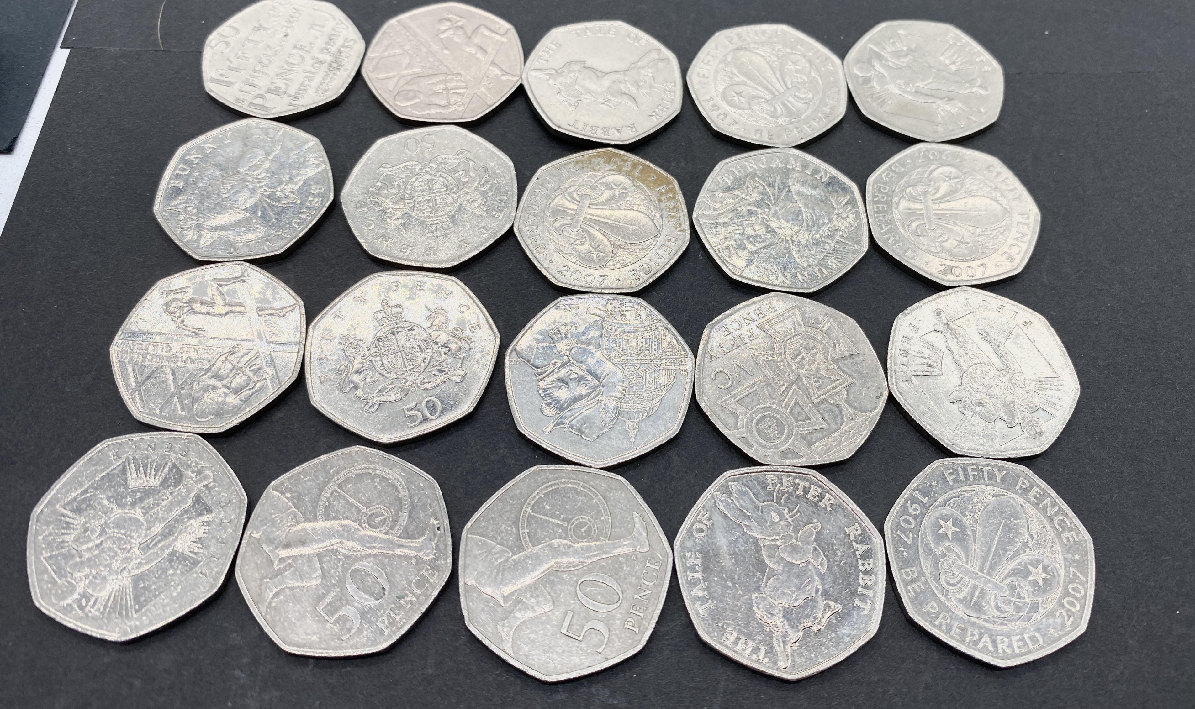 A collection of twenty-two various British 50 pence coins.