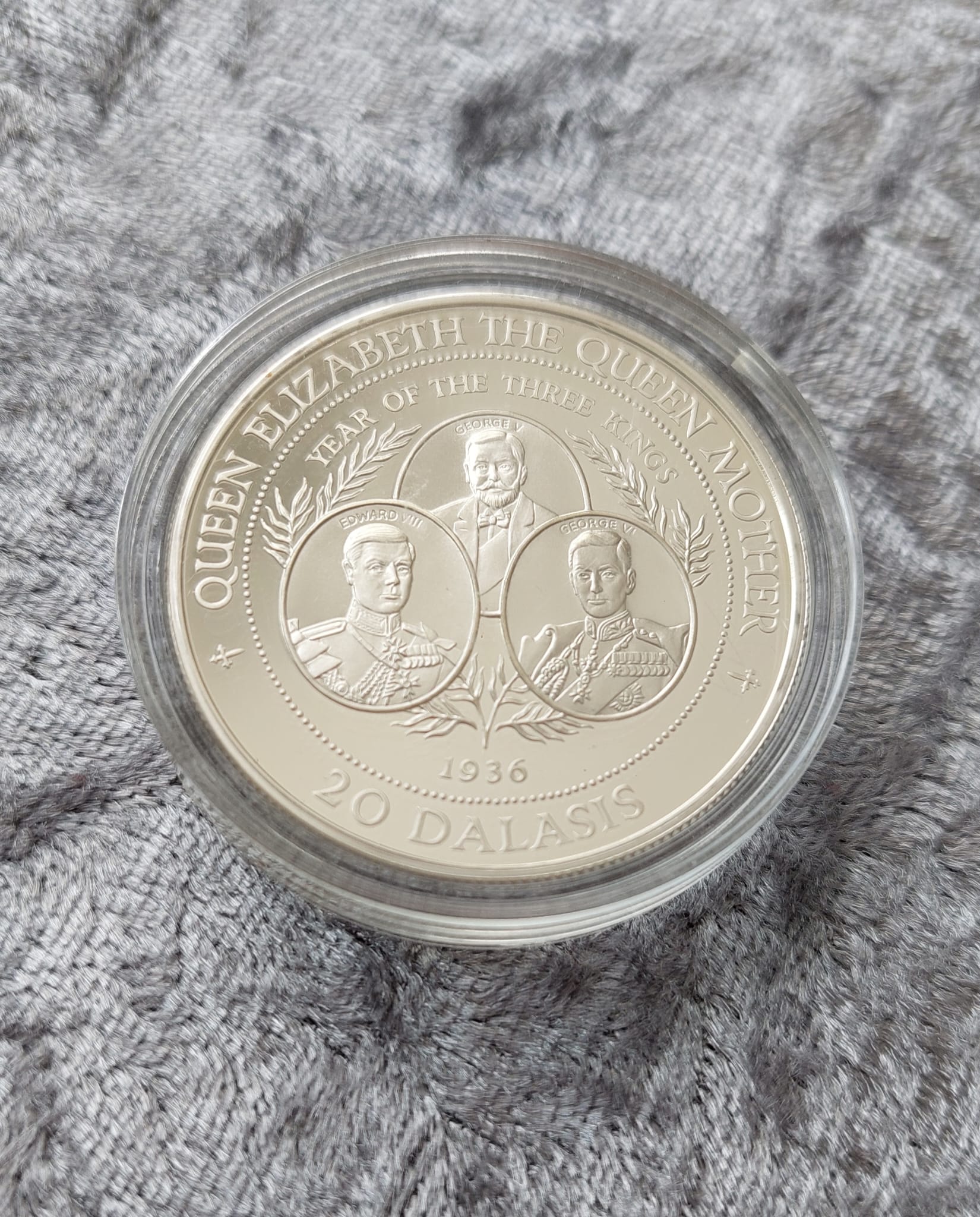 Three Gambian silver proof coins, including a 1994 20 Dalasis, a 1996 10 Dalasis, and a 1996 Dalasis coin.