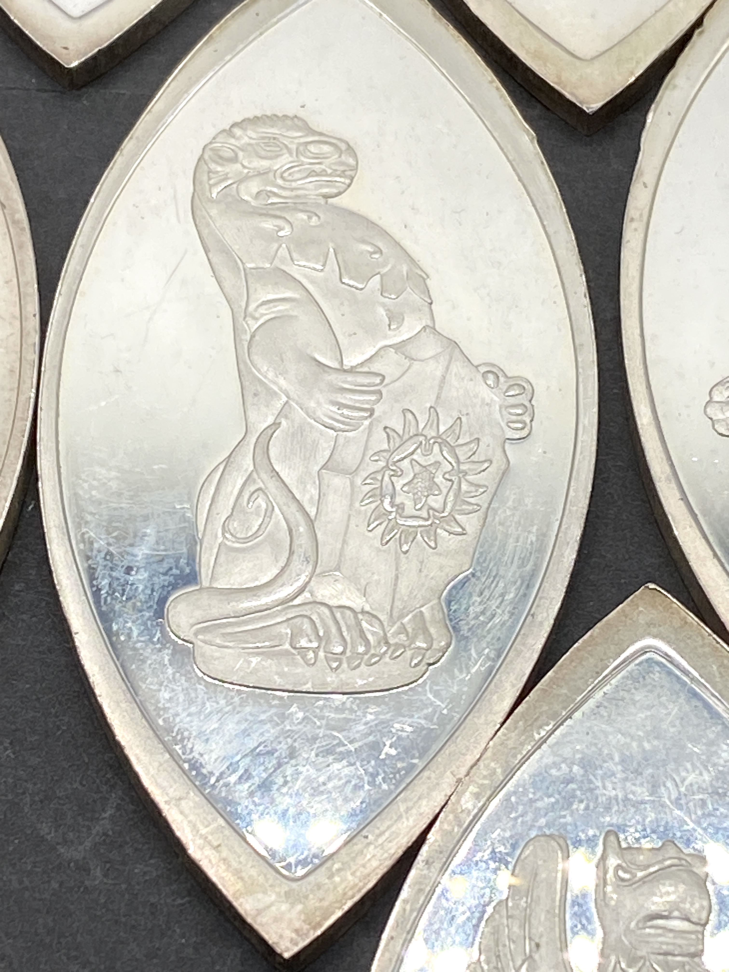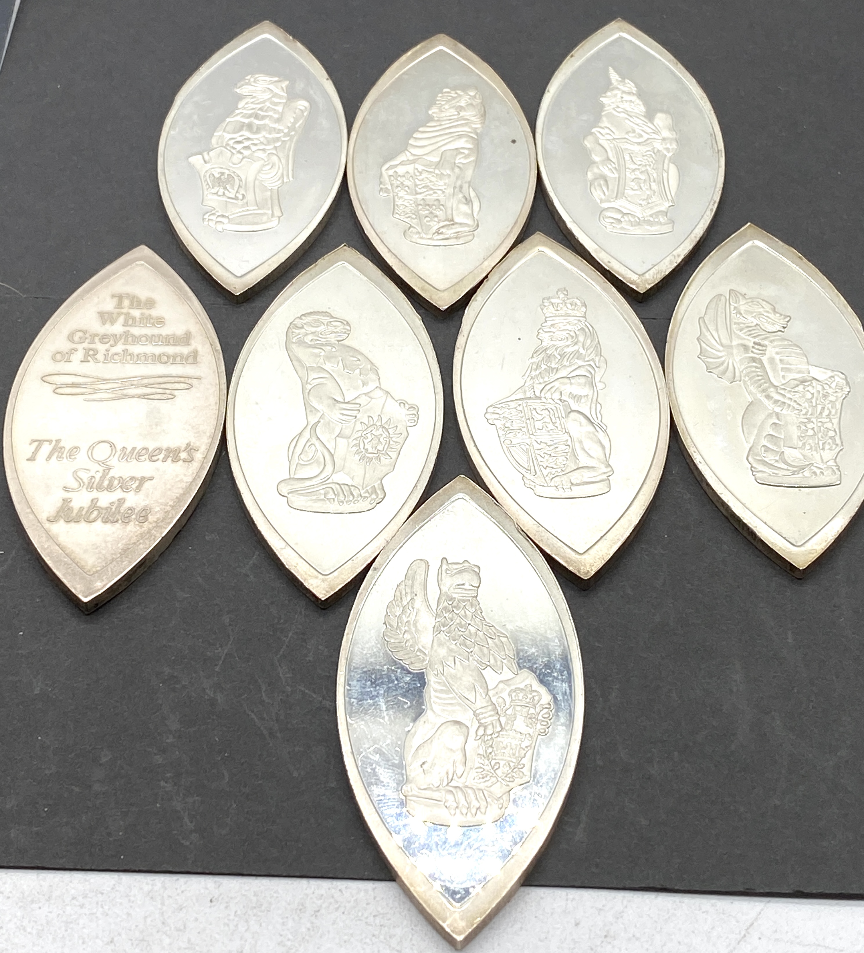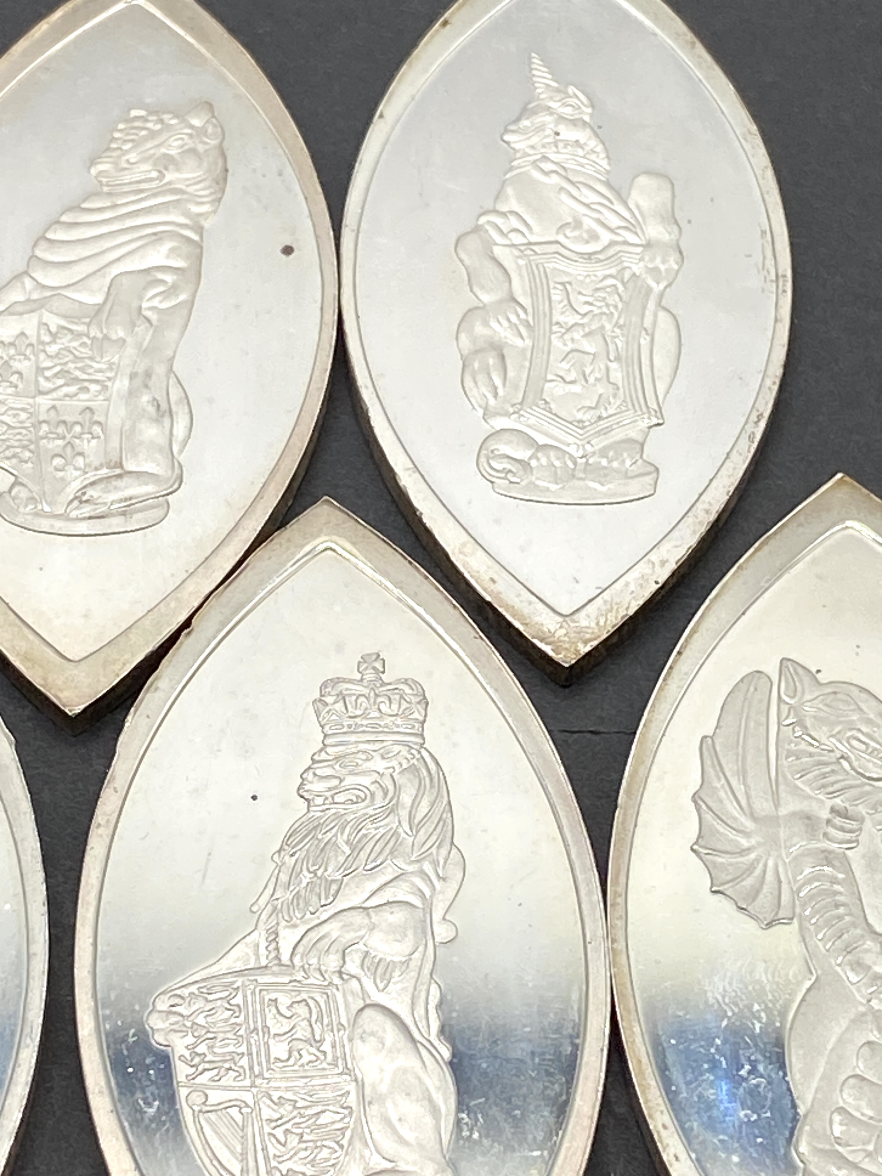 Set of seven silver-toned commemorative medallions depicting heraldic figures.