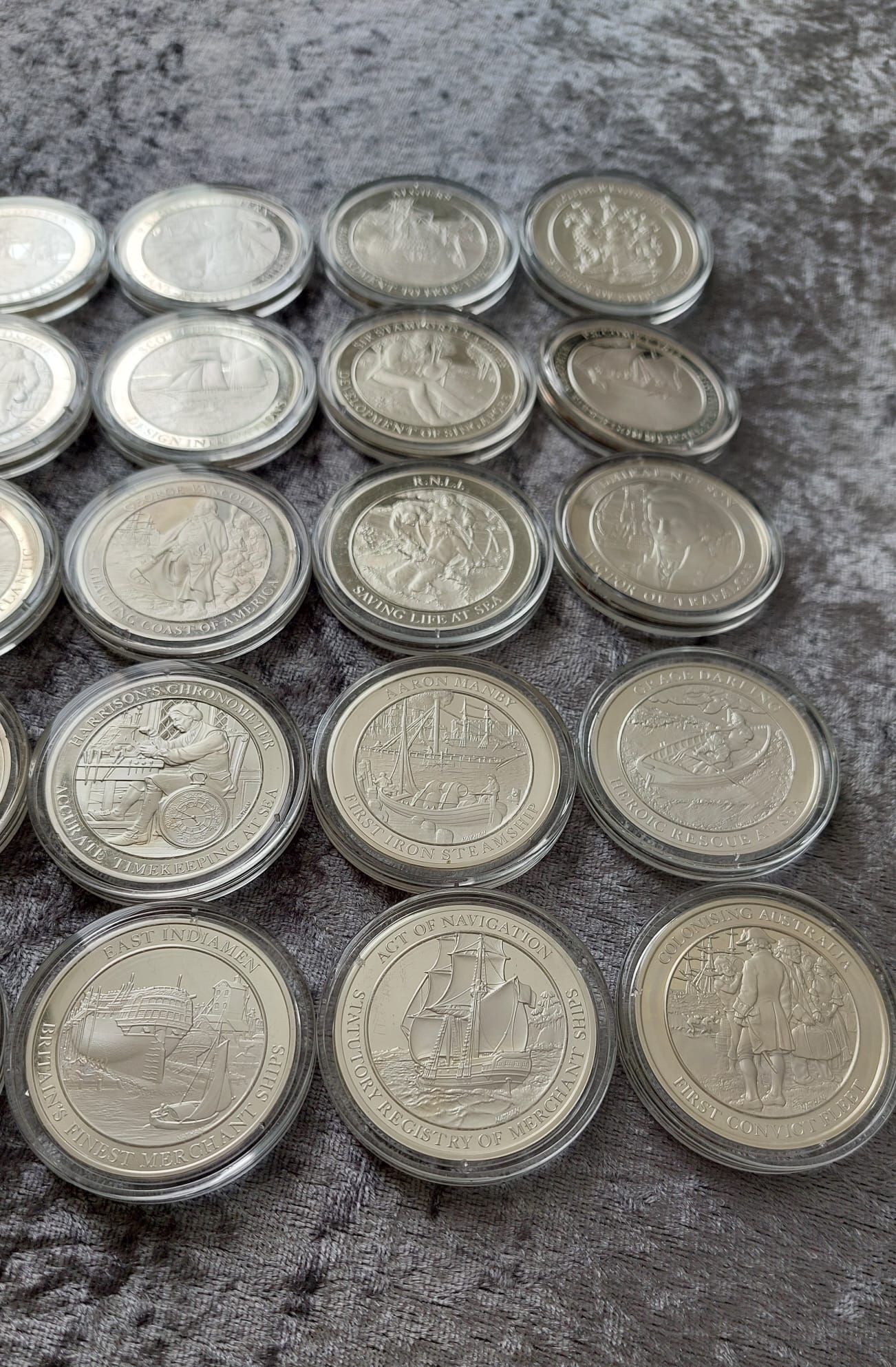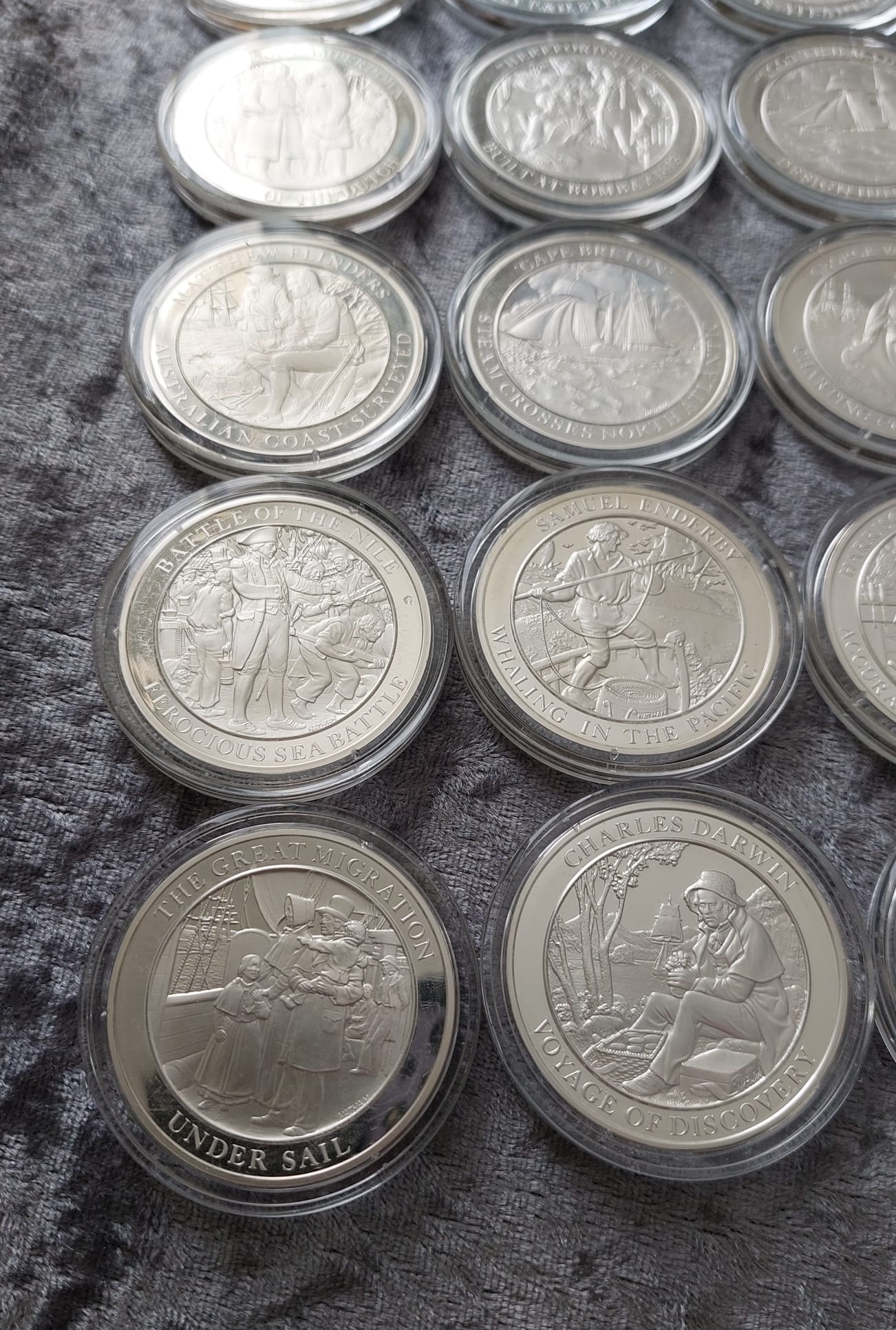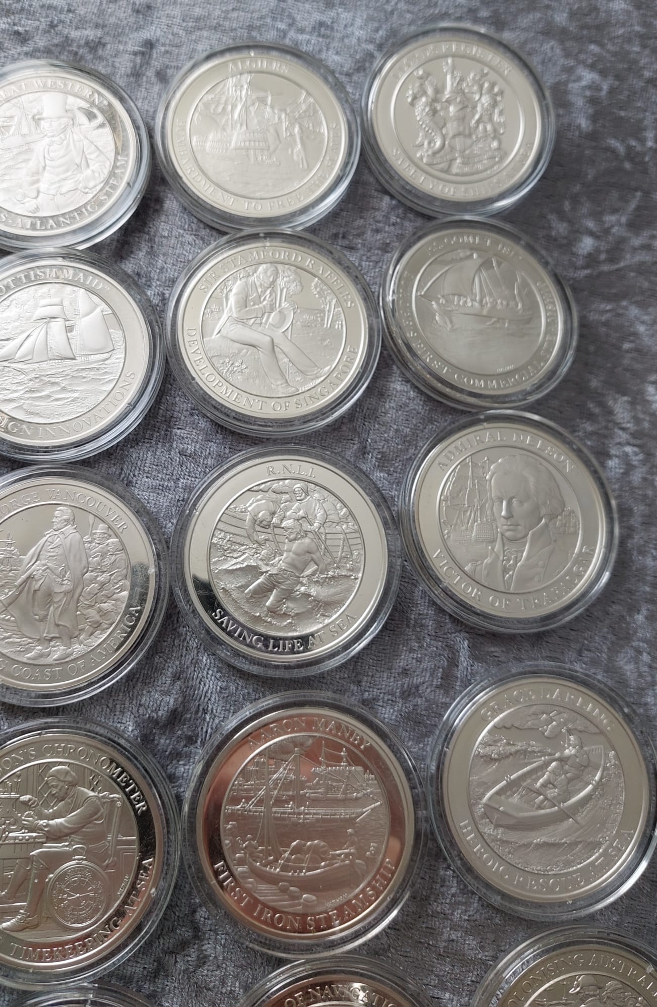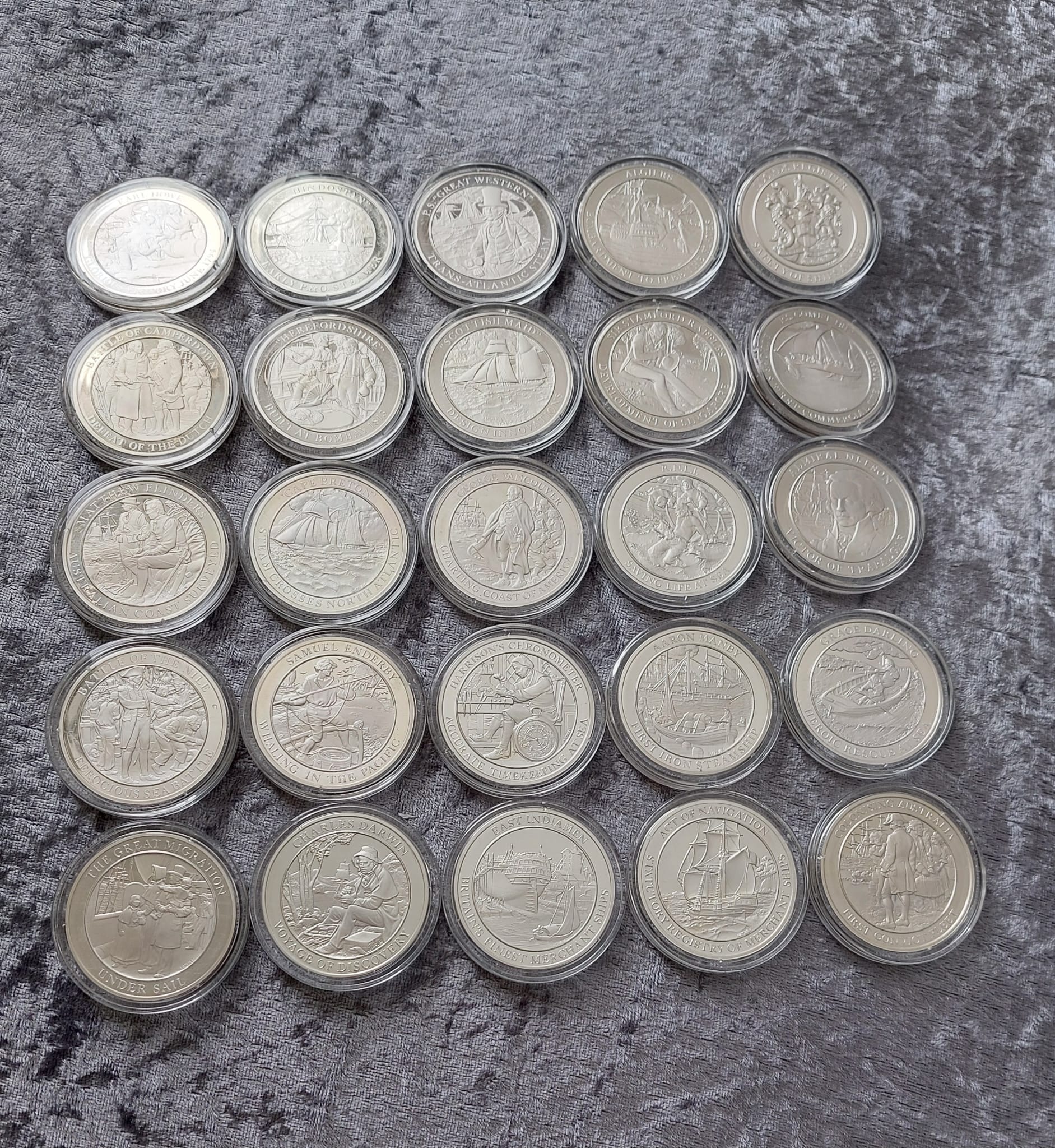 A collection of twenty-seven silver-colored commemorative coins in protective cases depicting various historical maritime events and figures.