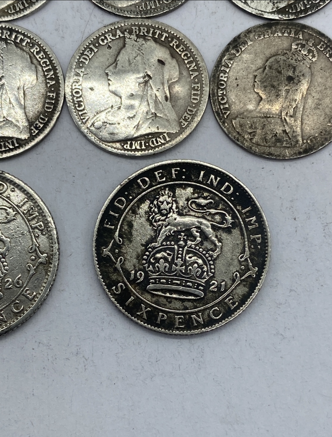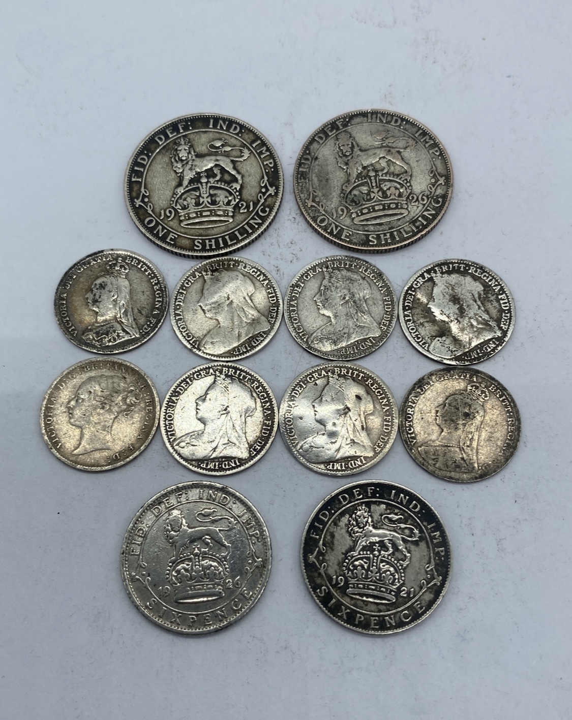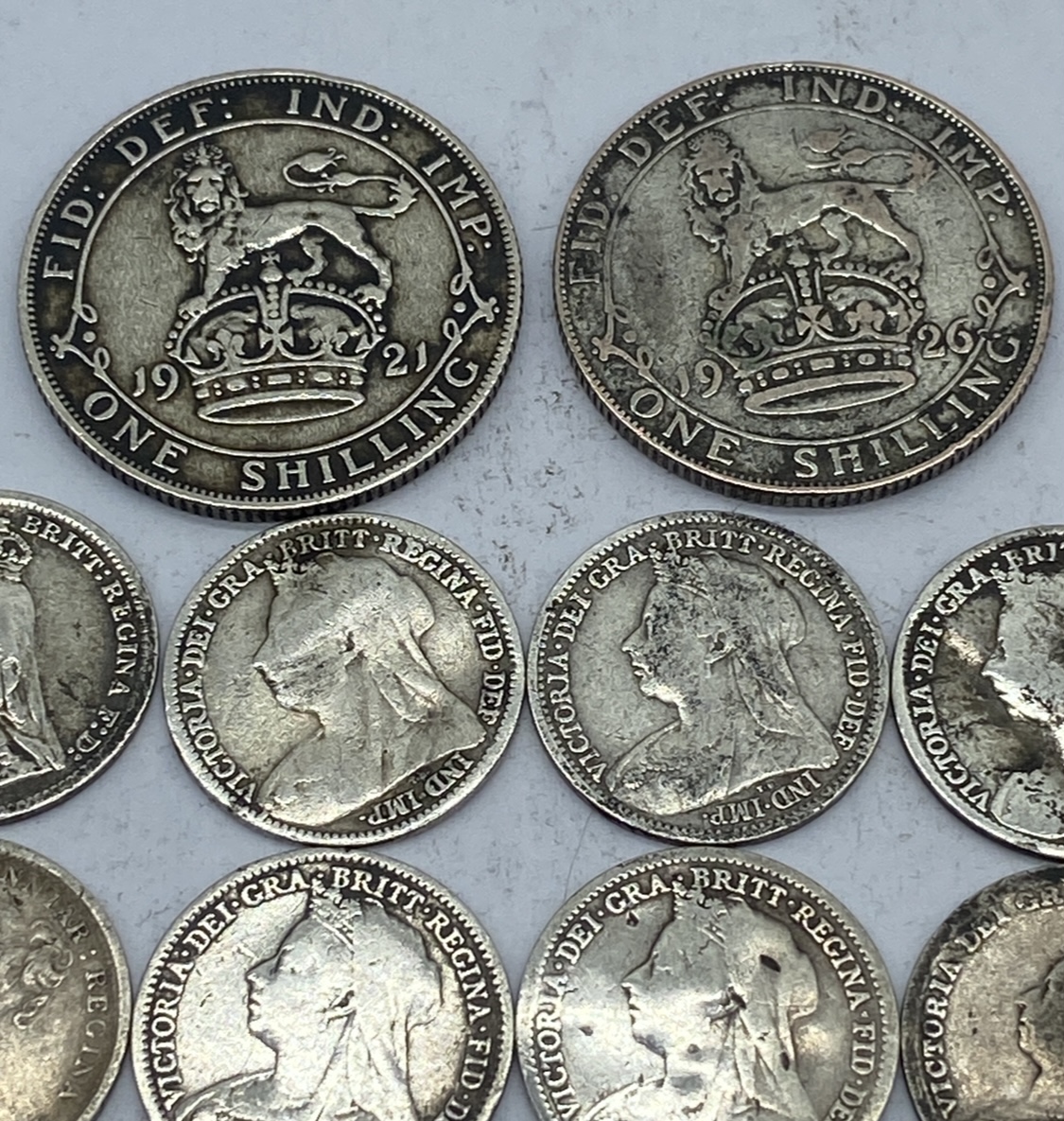 A collection of British silver shillings and sixpences, including two 1921 and 1926 shillings, two 1921 and 1927 sixpences, and eight Victorian sixpences.