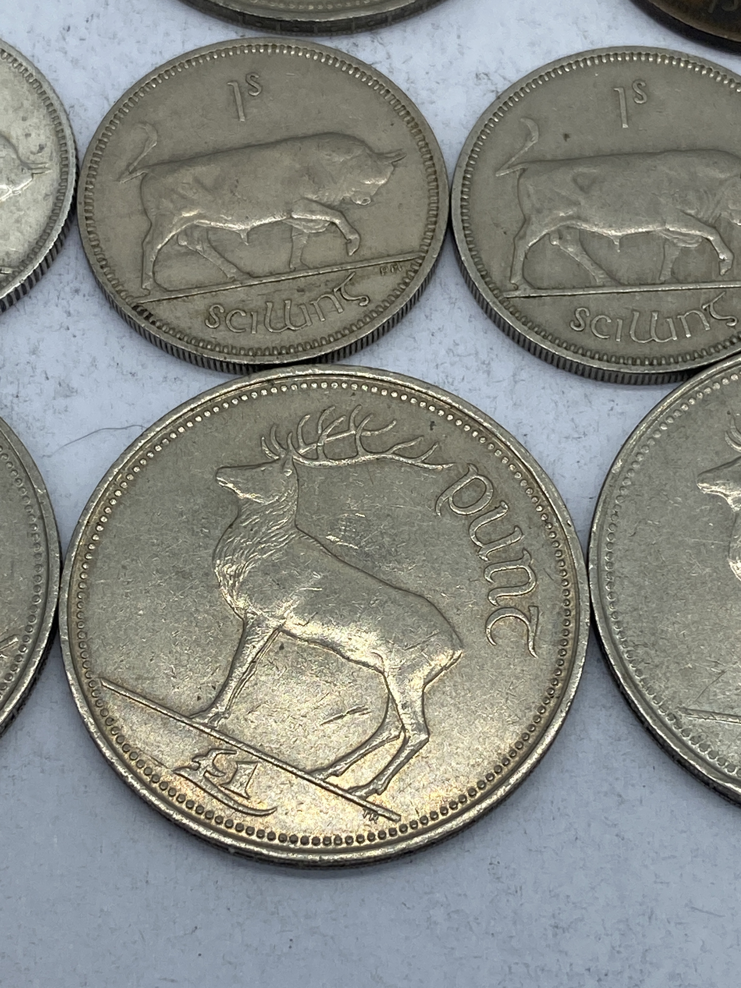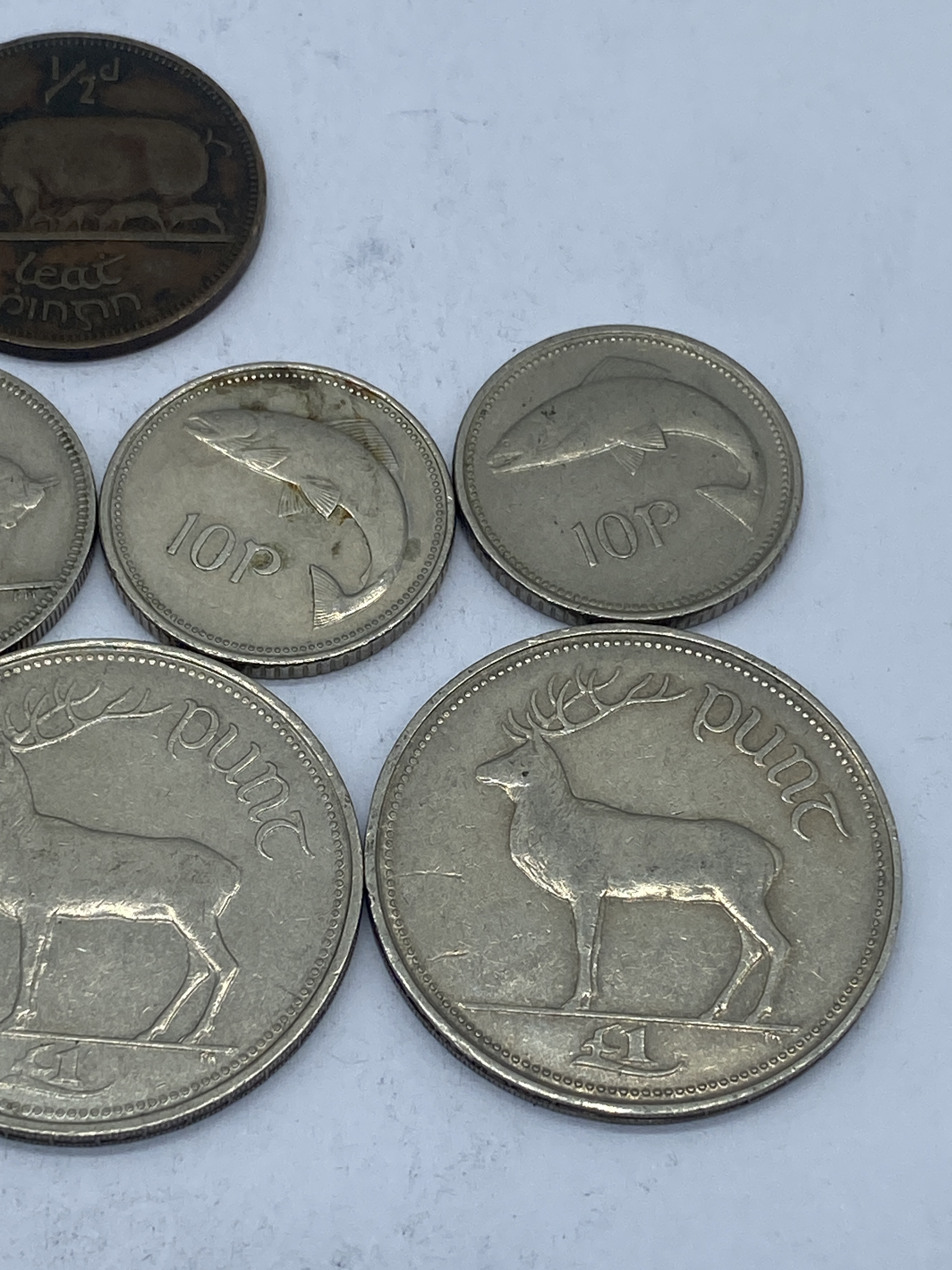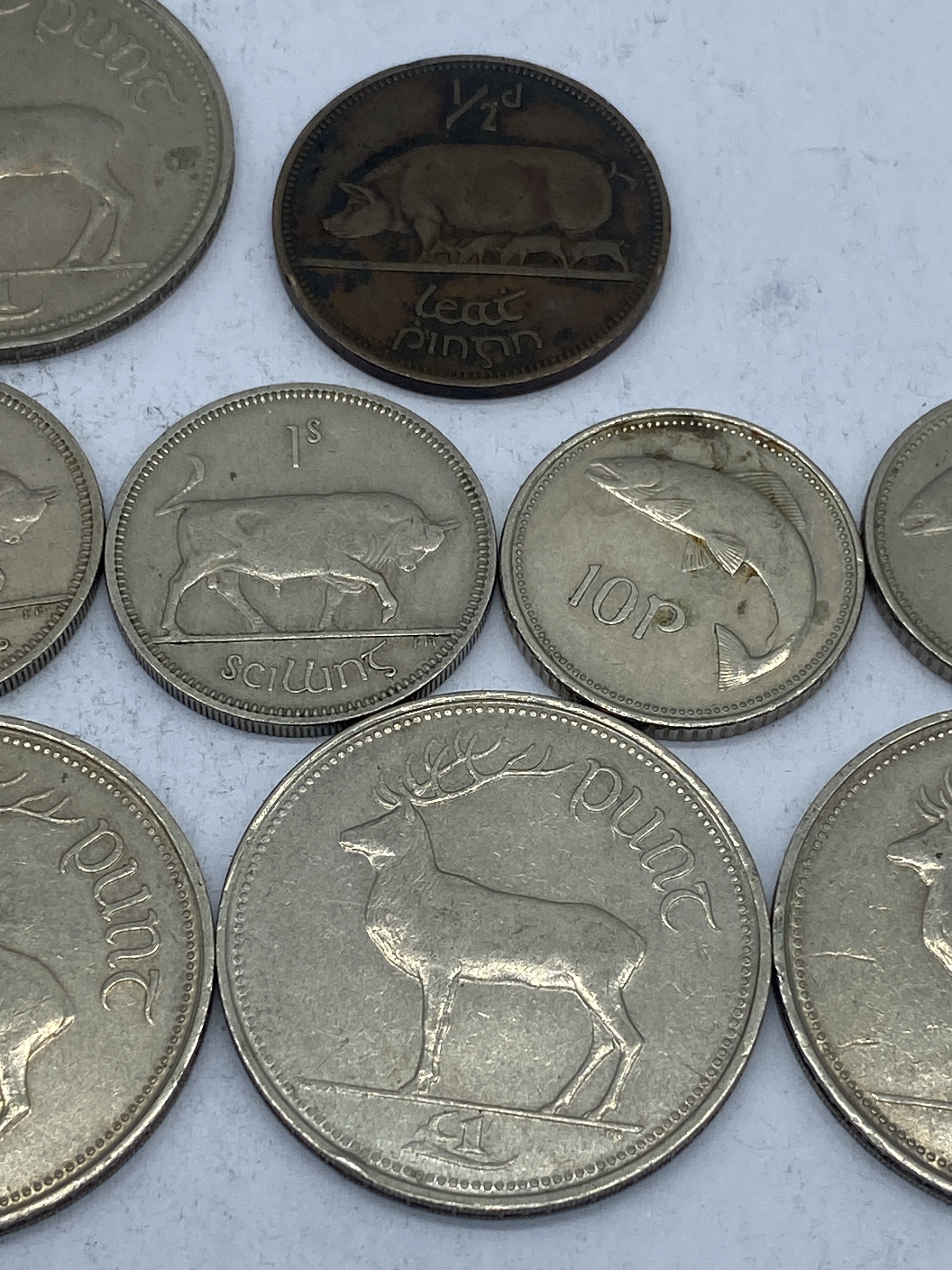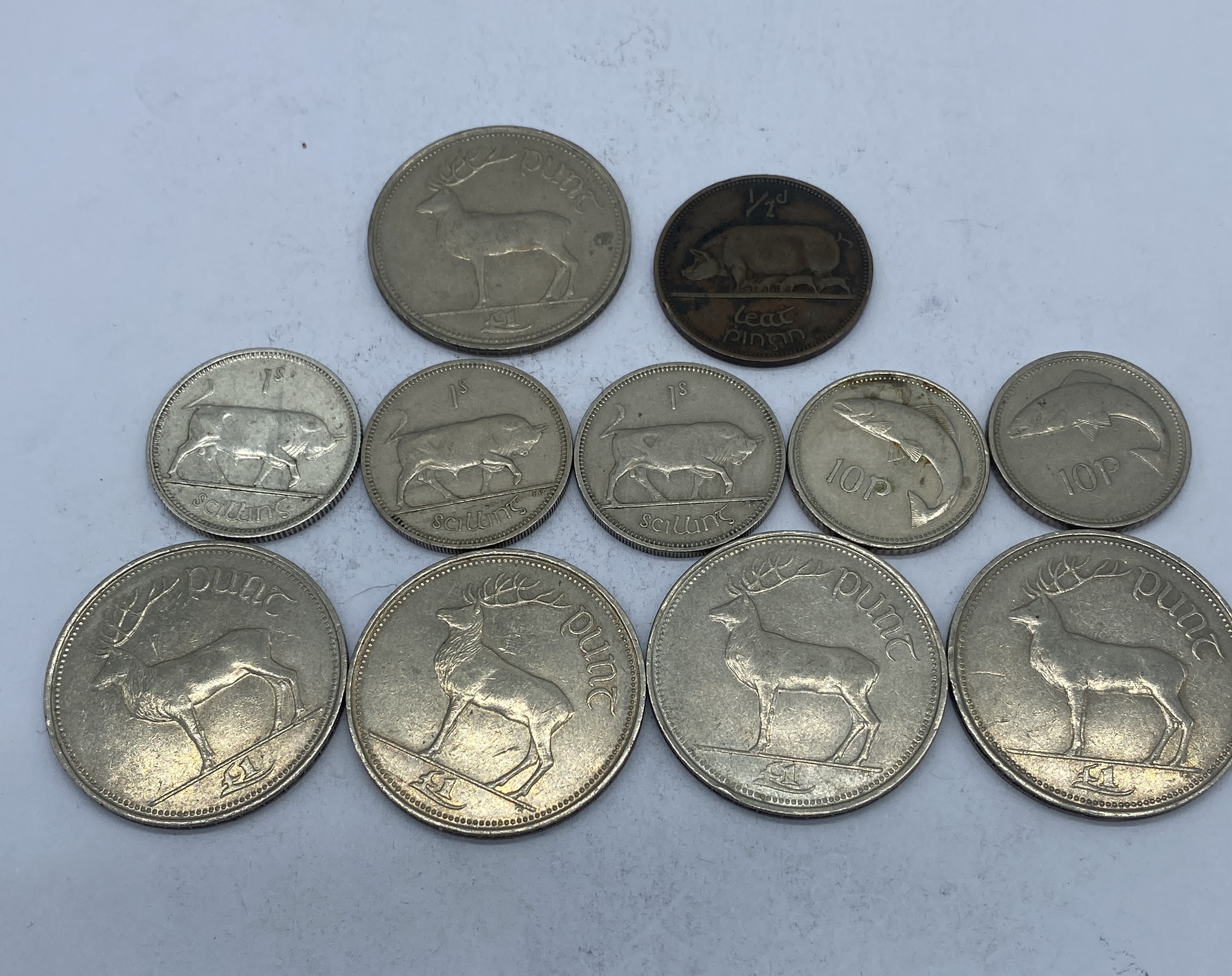 A collection of eleven Irish coins, featuring various denominations and designs.
