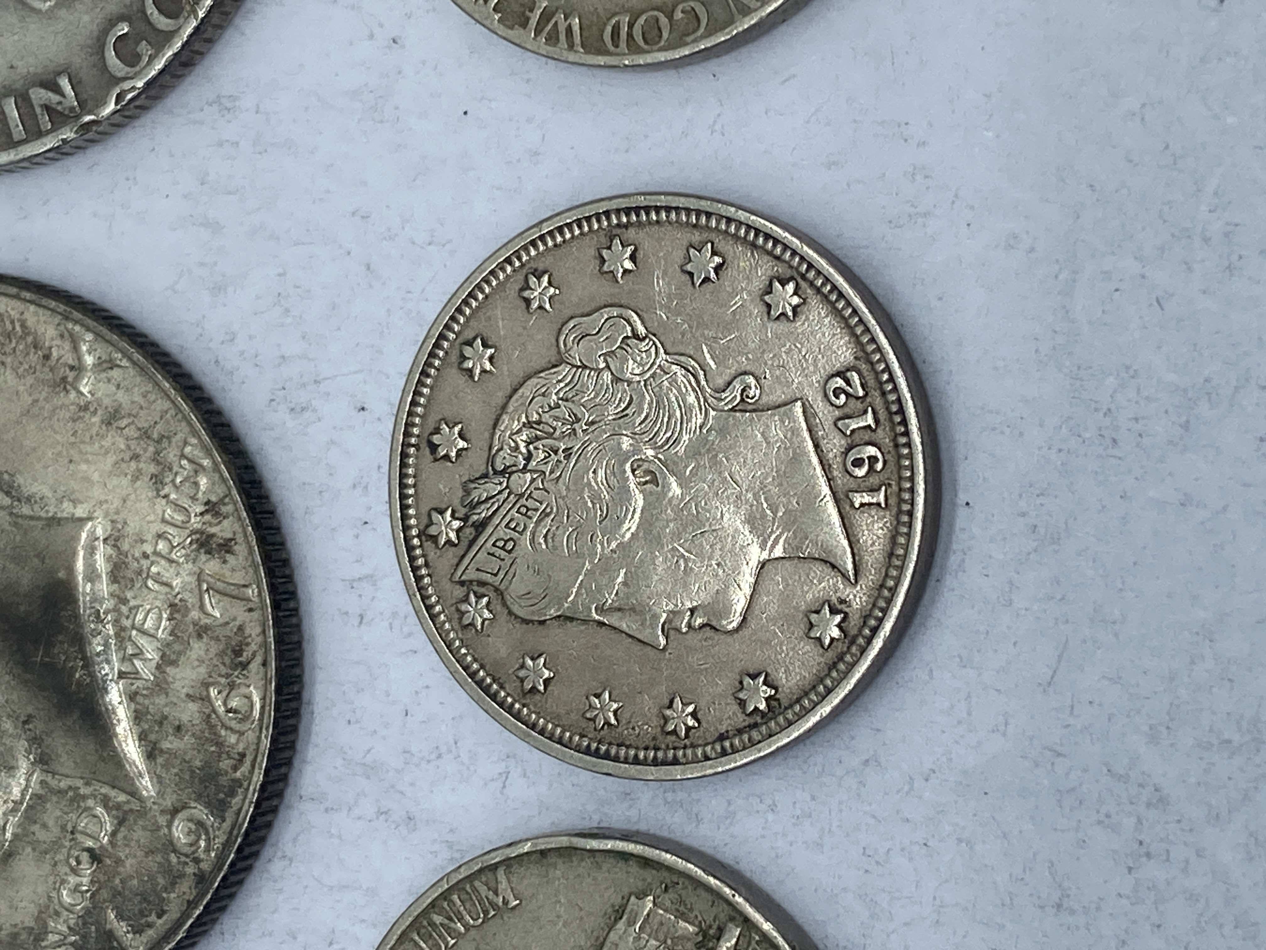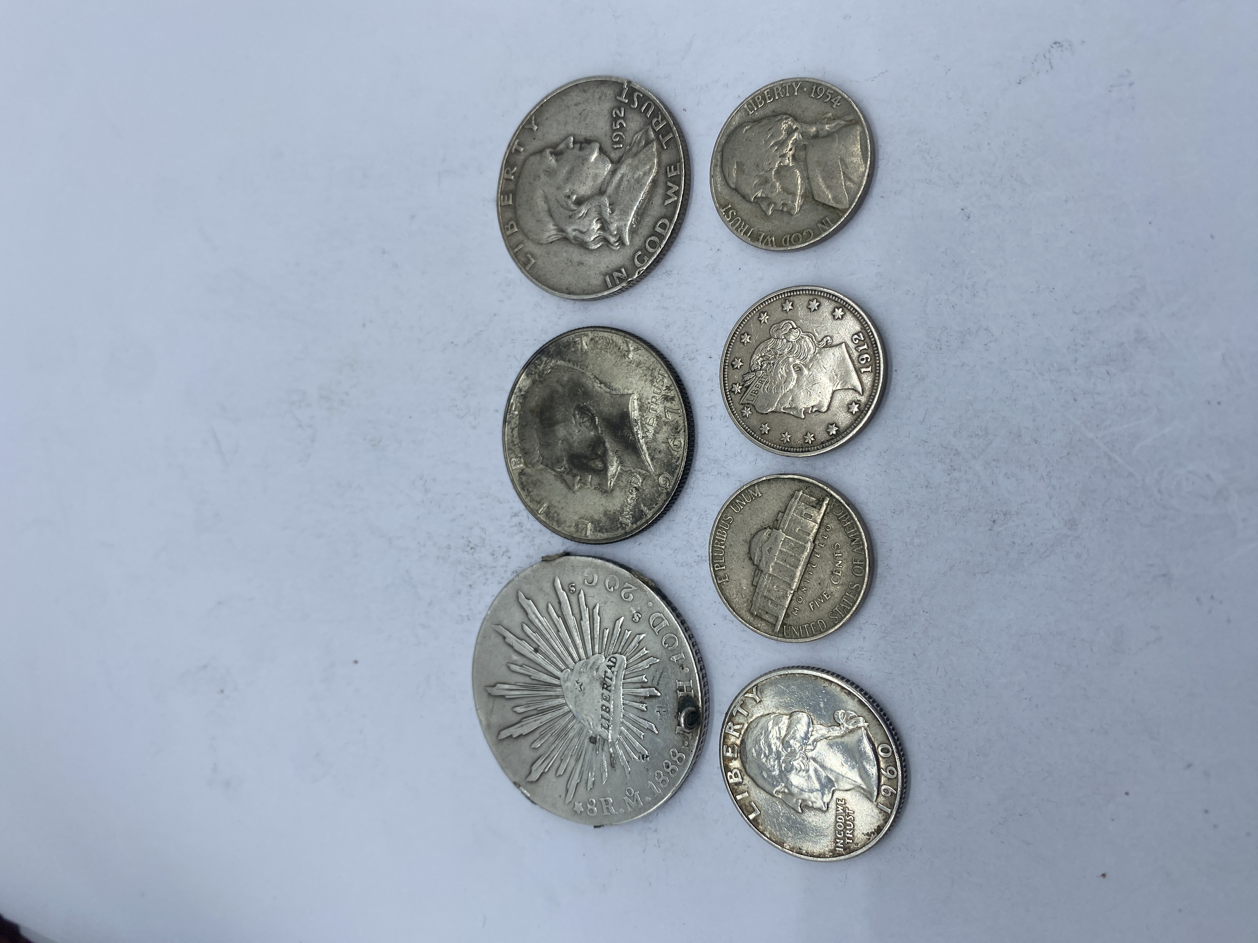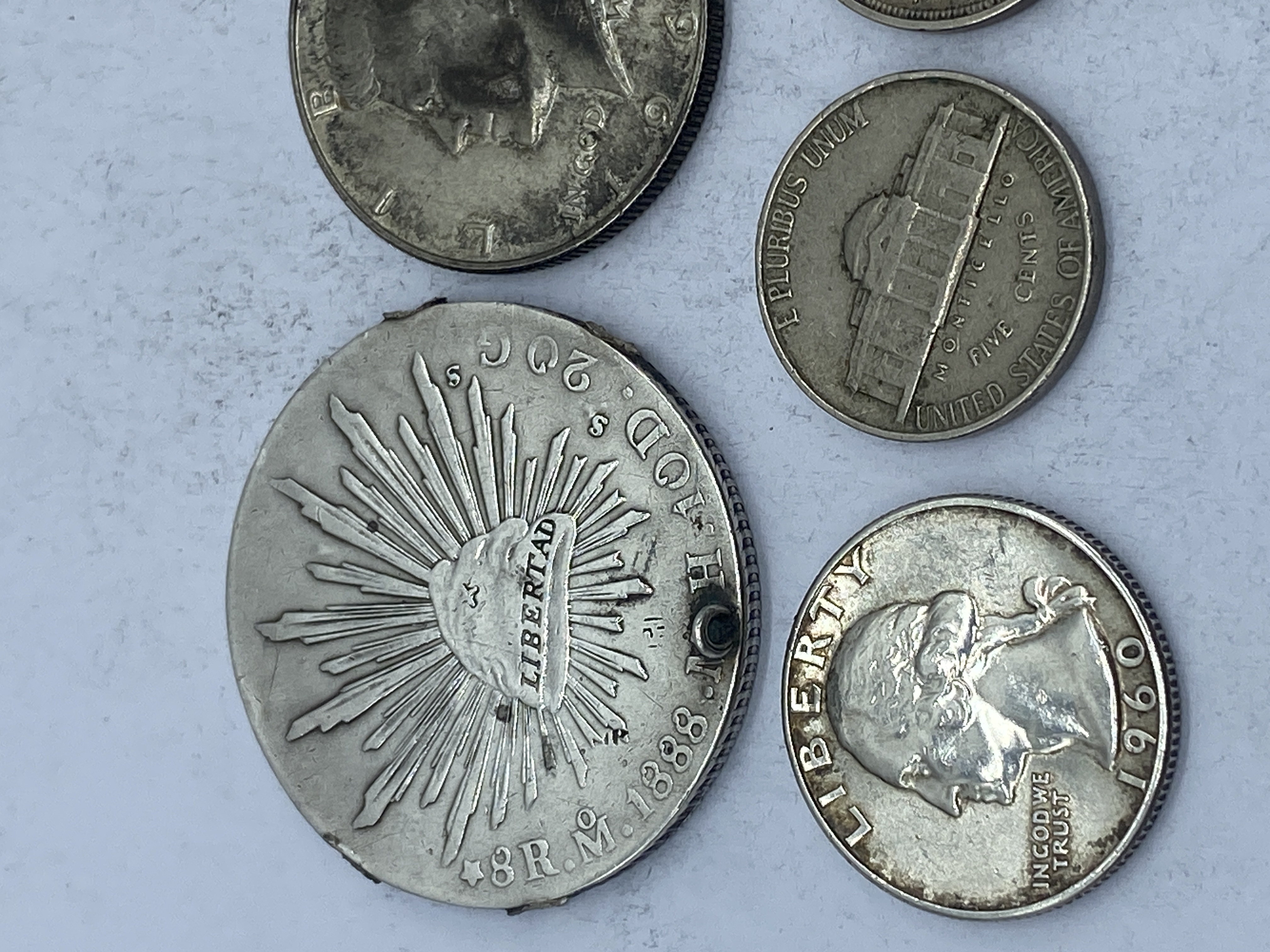 A collection of silver-colored coins, including Kennedy half dollars, Franklin half dollars, a Bicentennial coin, and a Mexican coin.