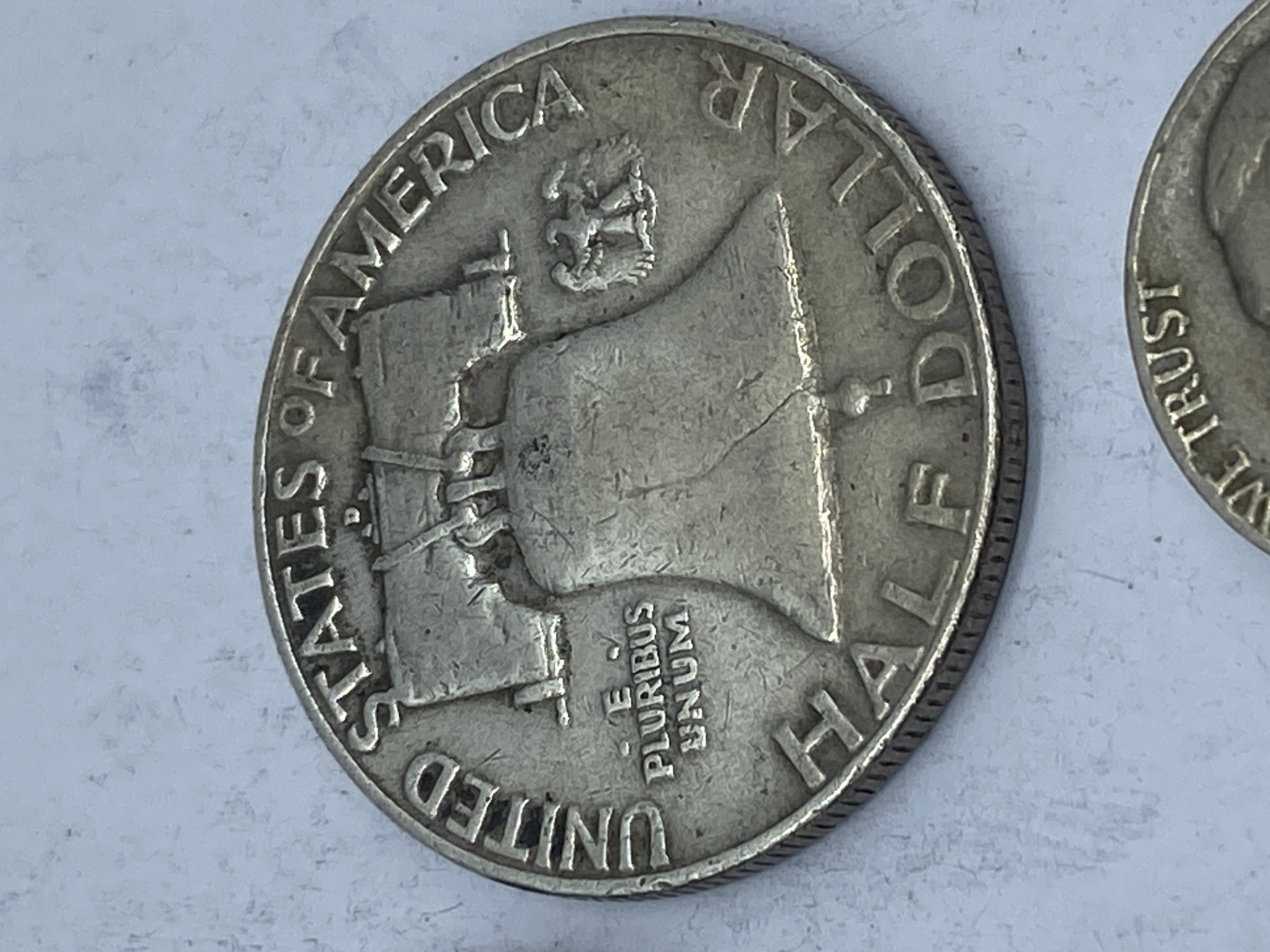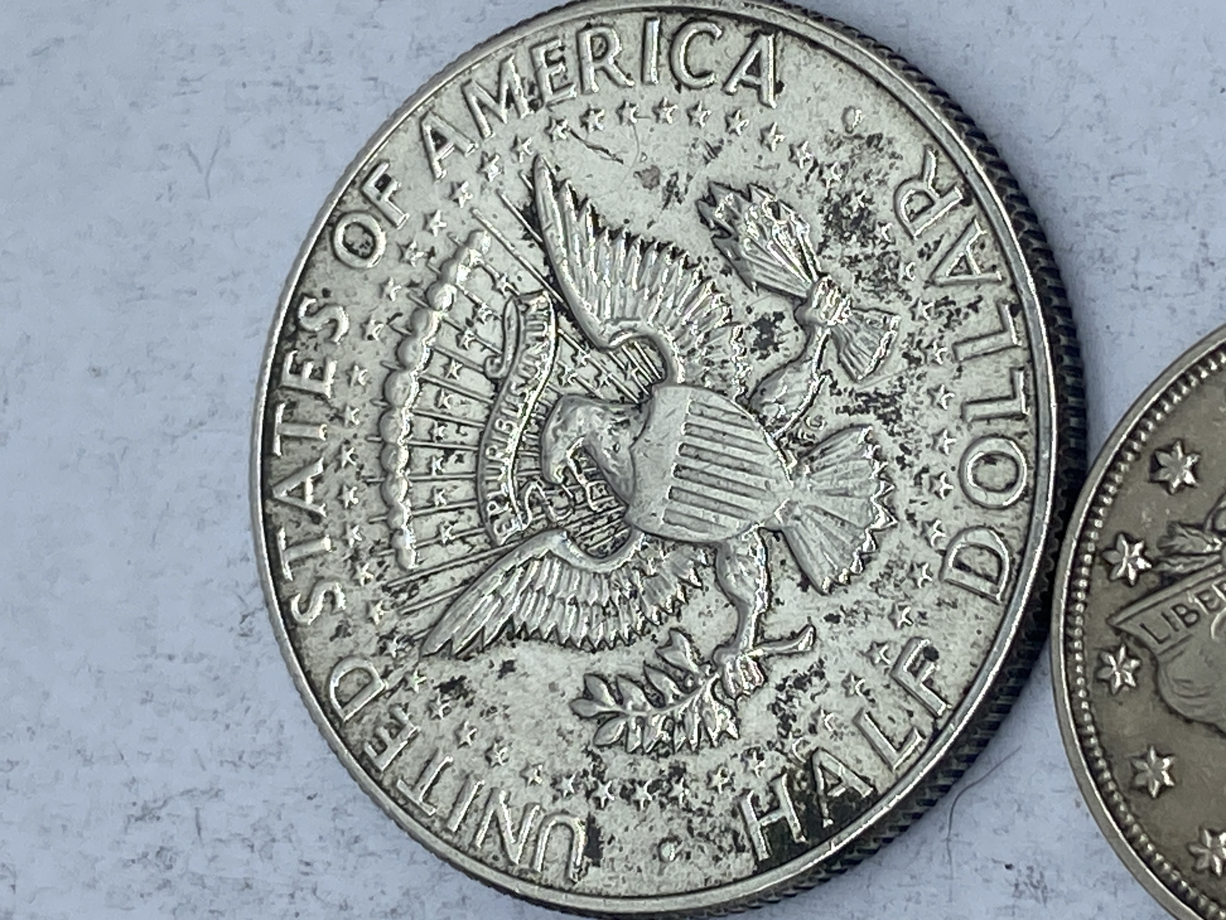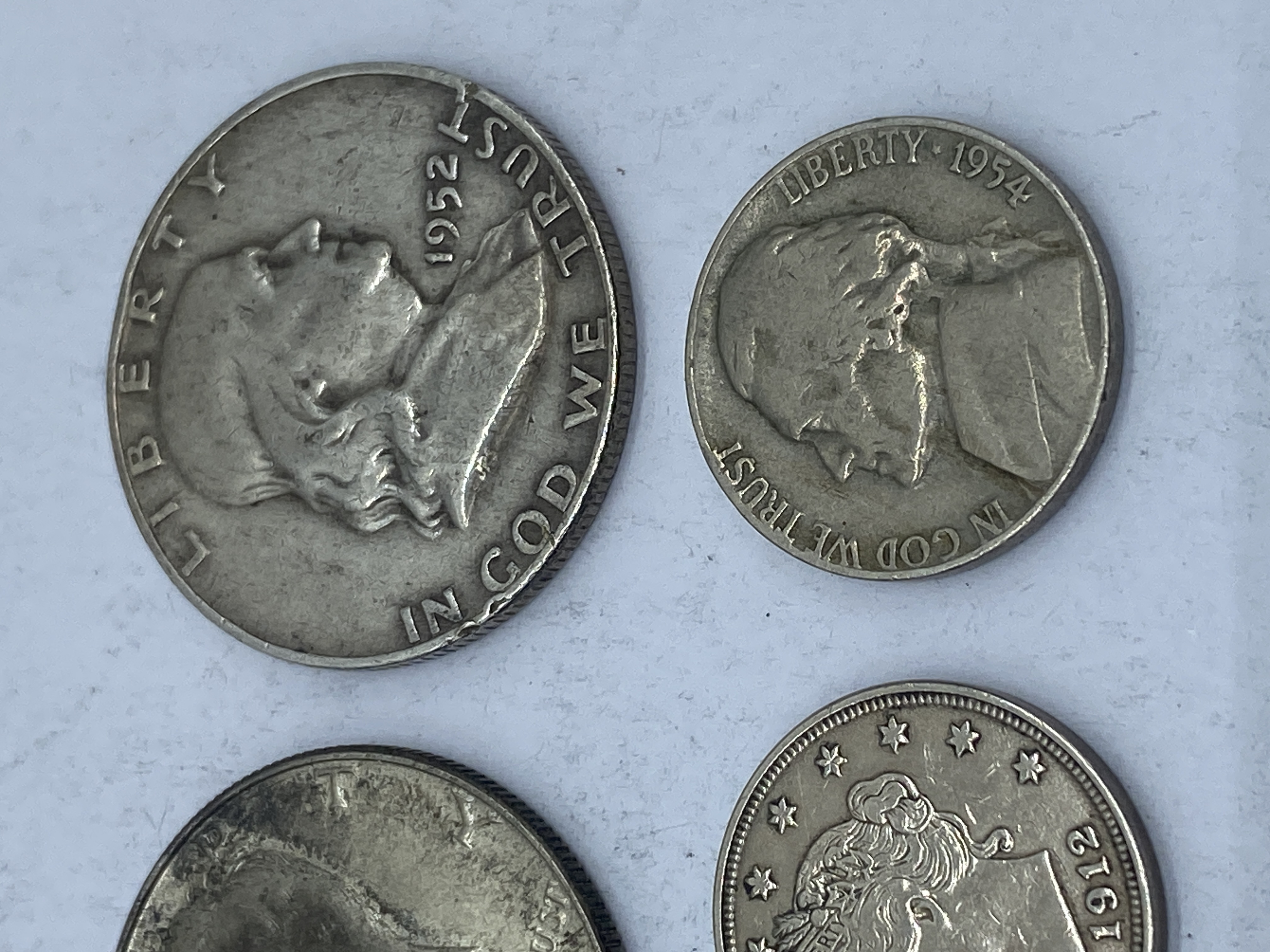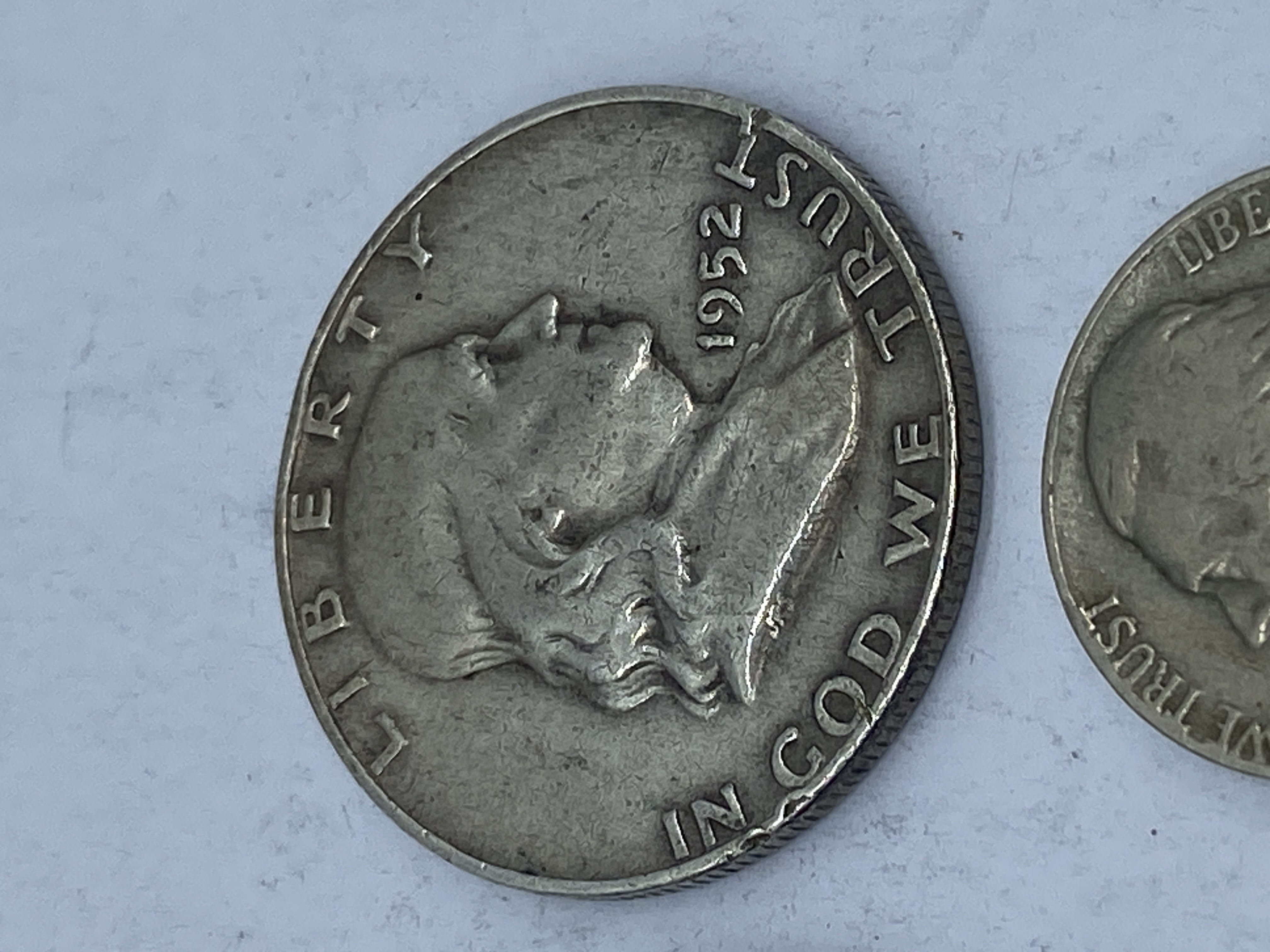A collection of silver-colored coins, including Kennedy half dollars, Franklin half dollars, a Bicentennial coin, and a Mexican coin.