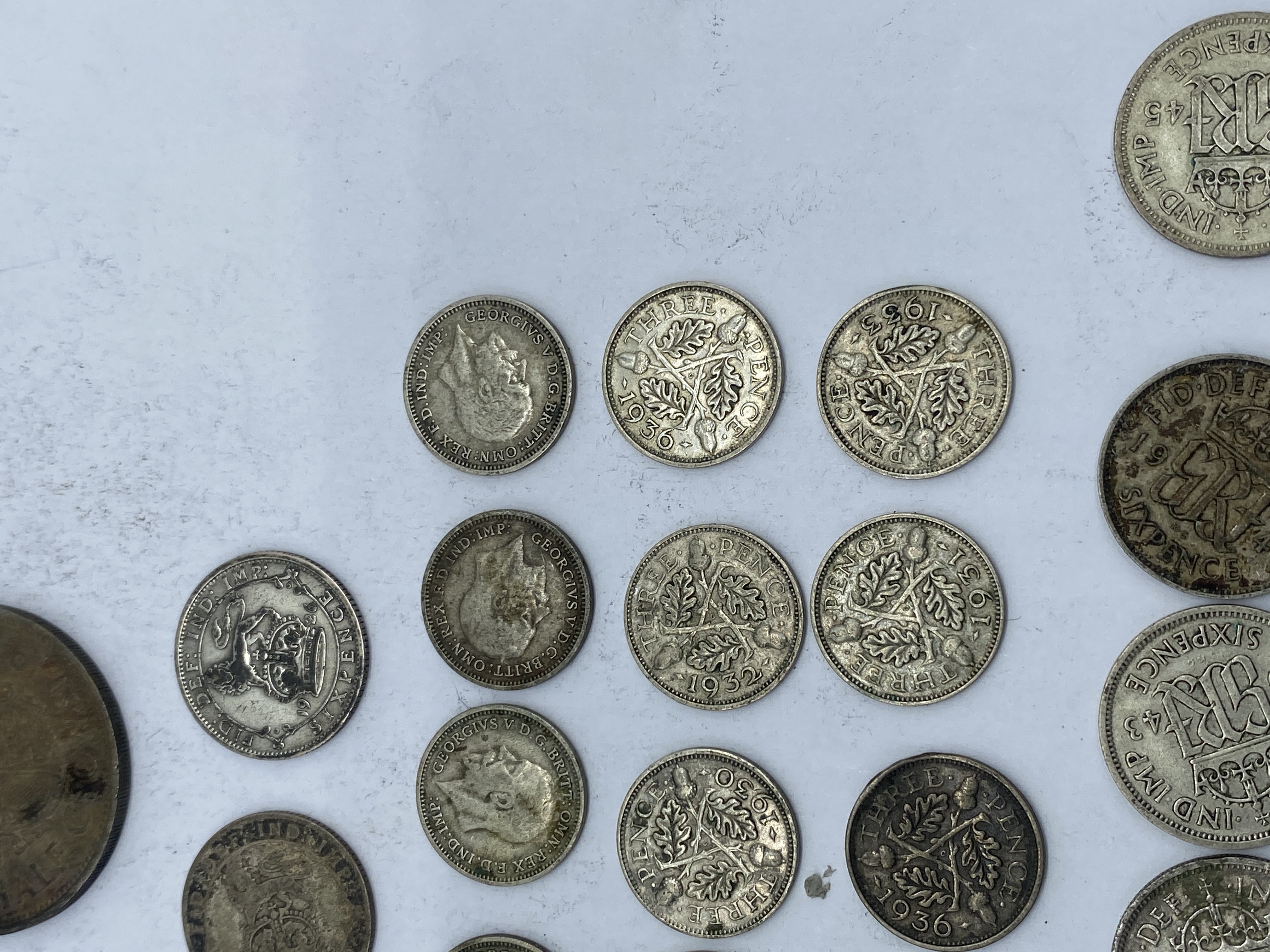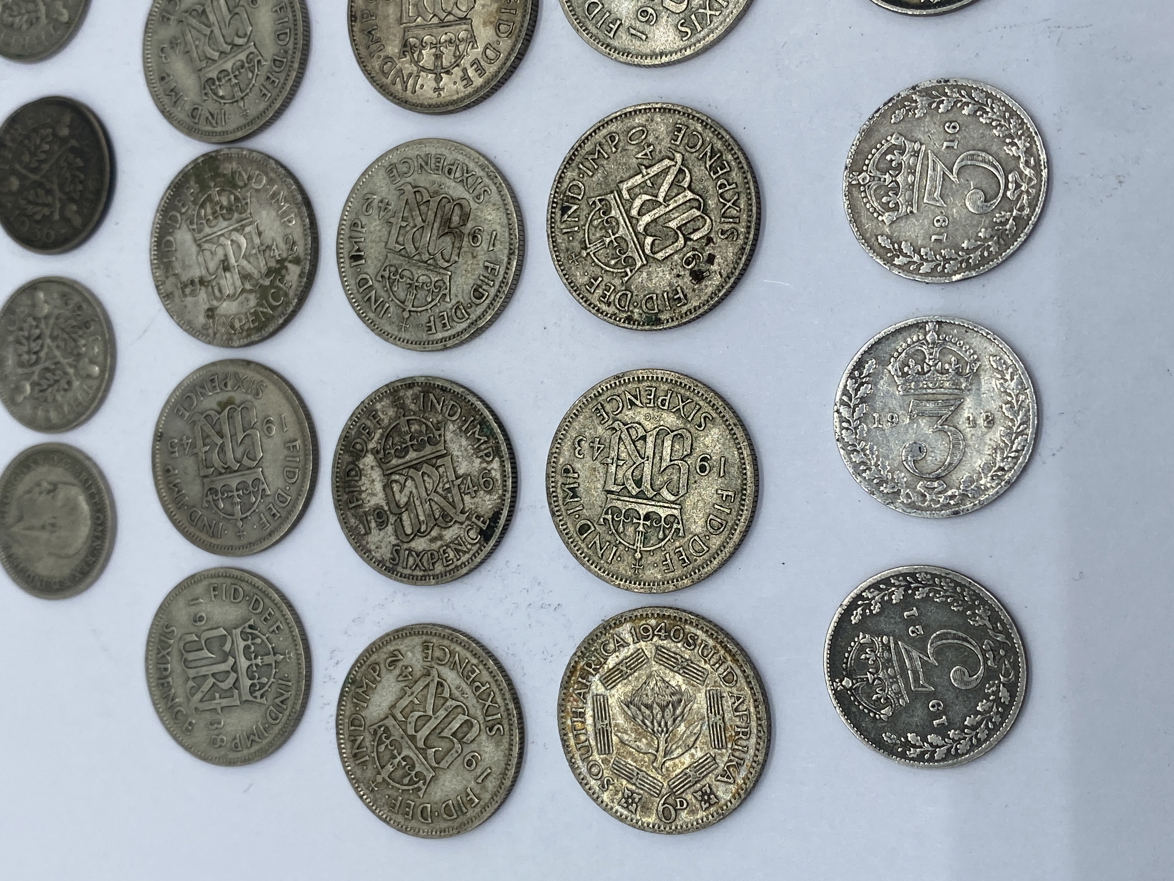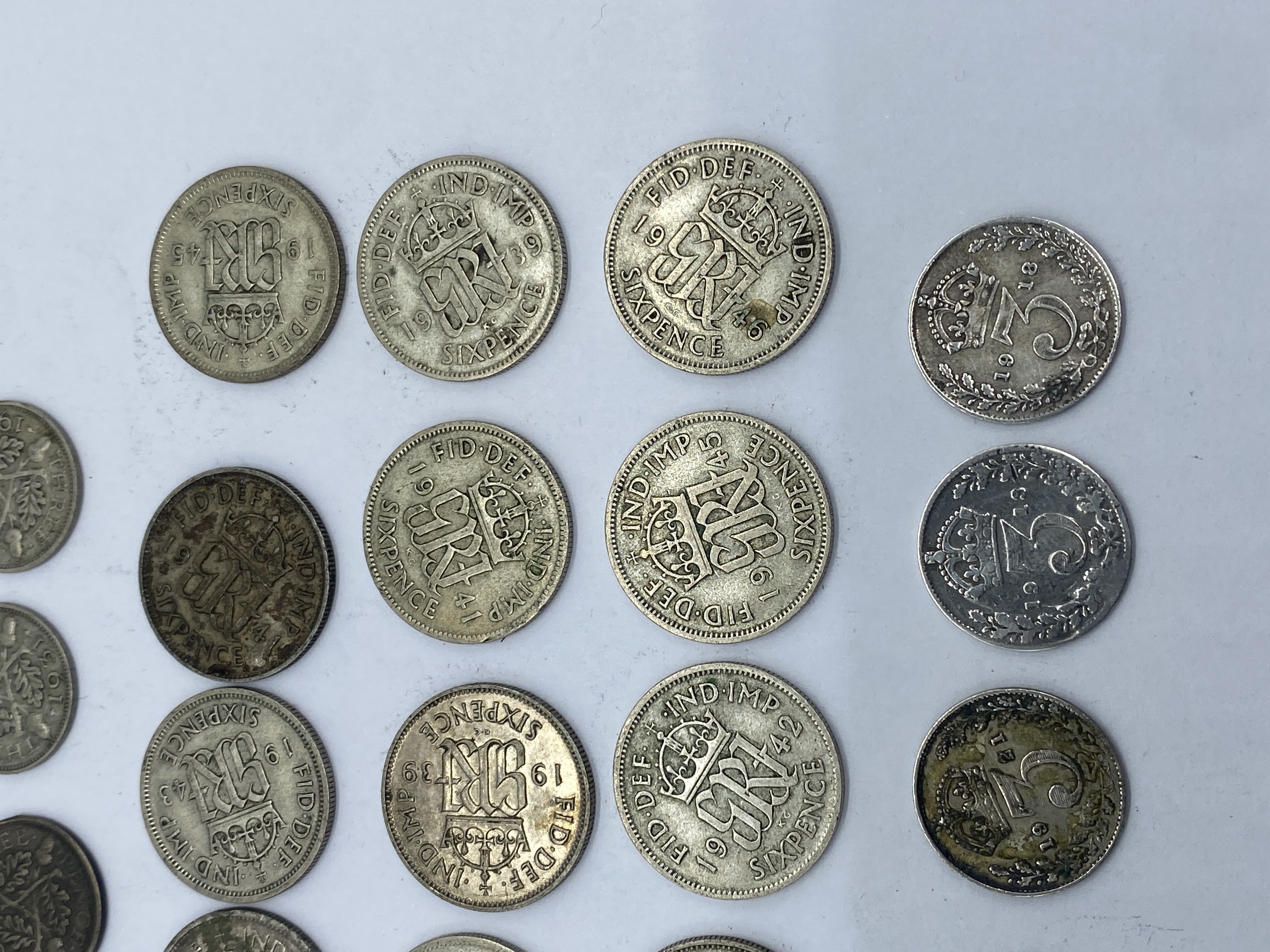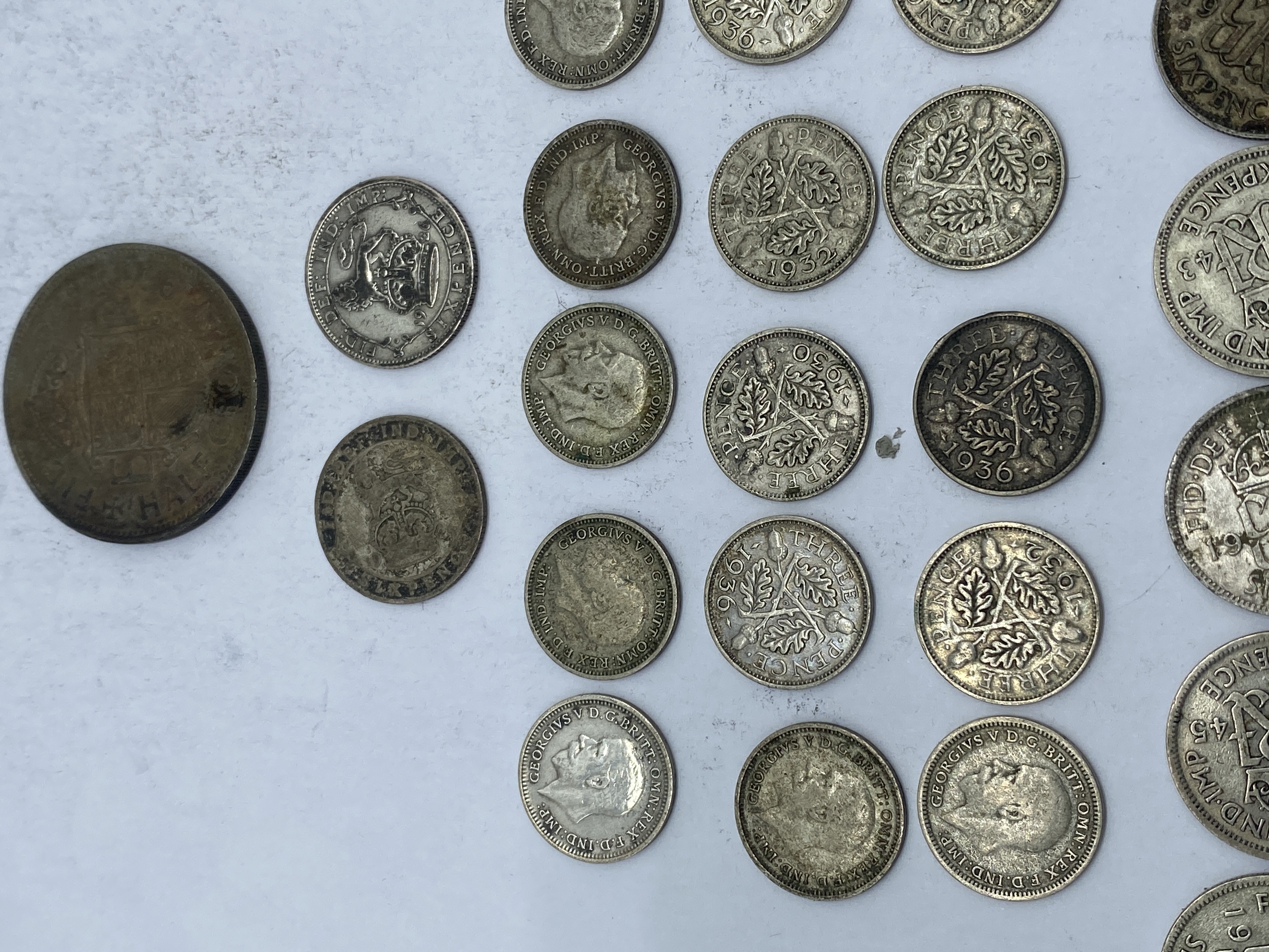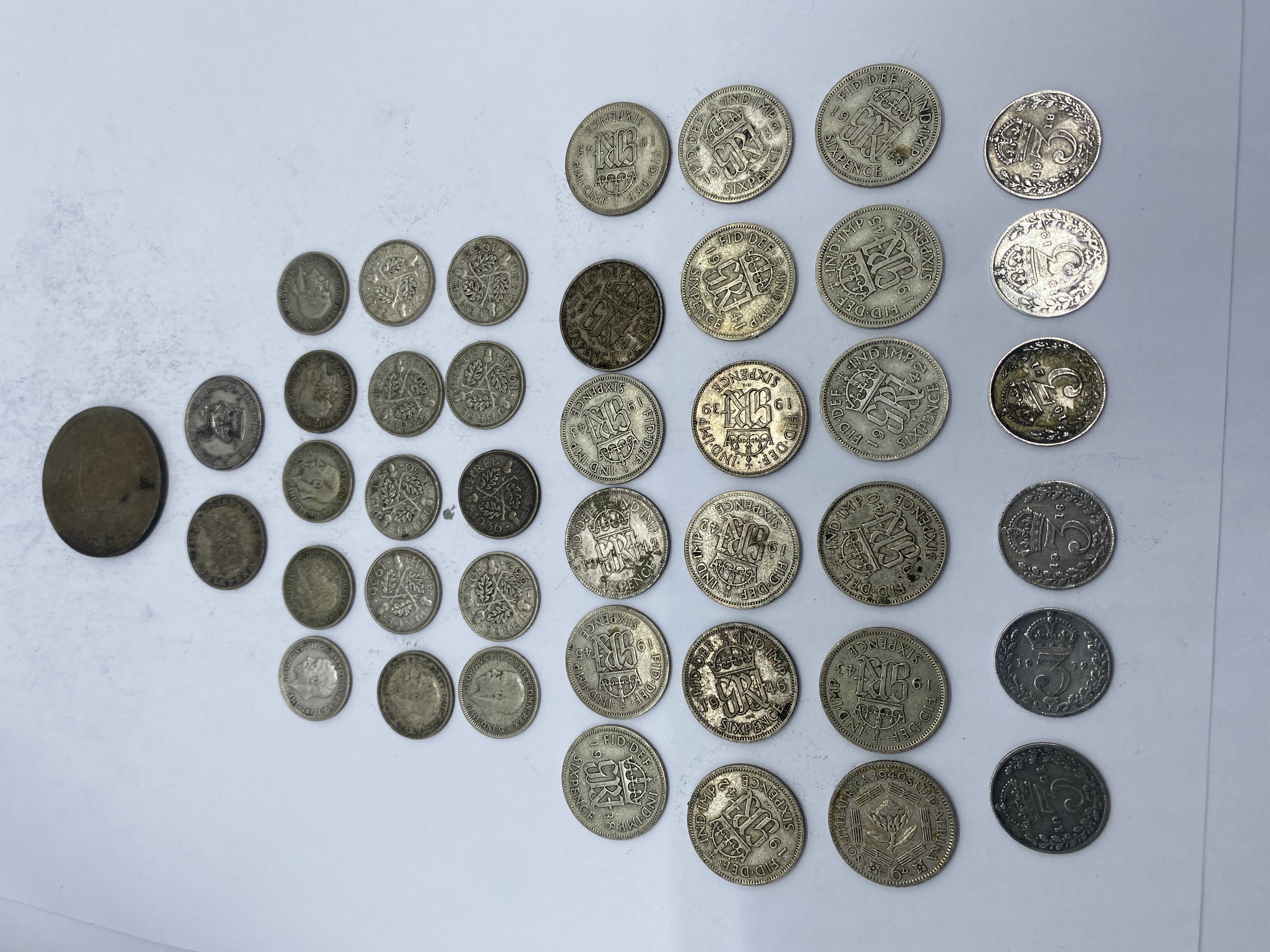 A collection of various silver-colored coins, including threepence, sixpence, and shillings.