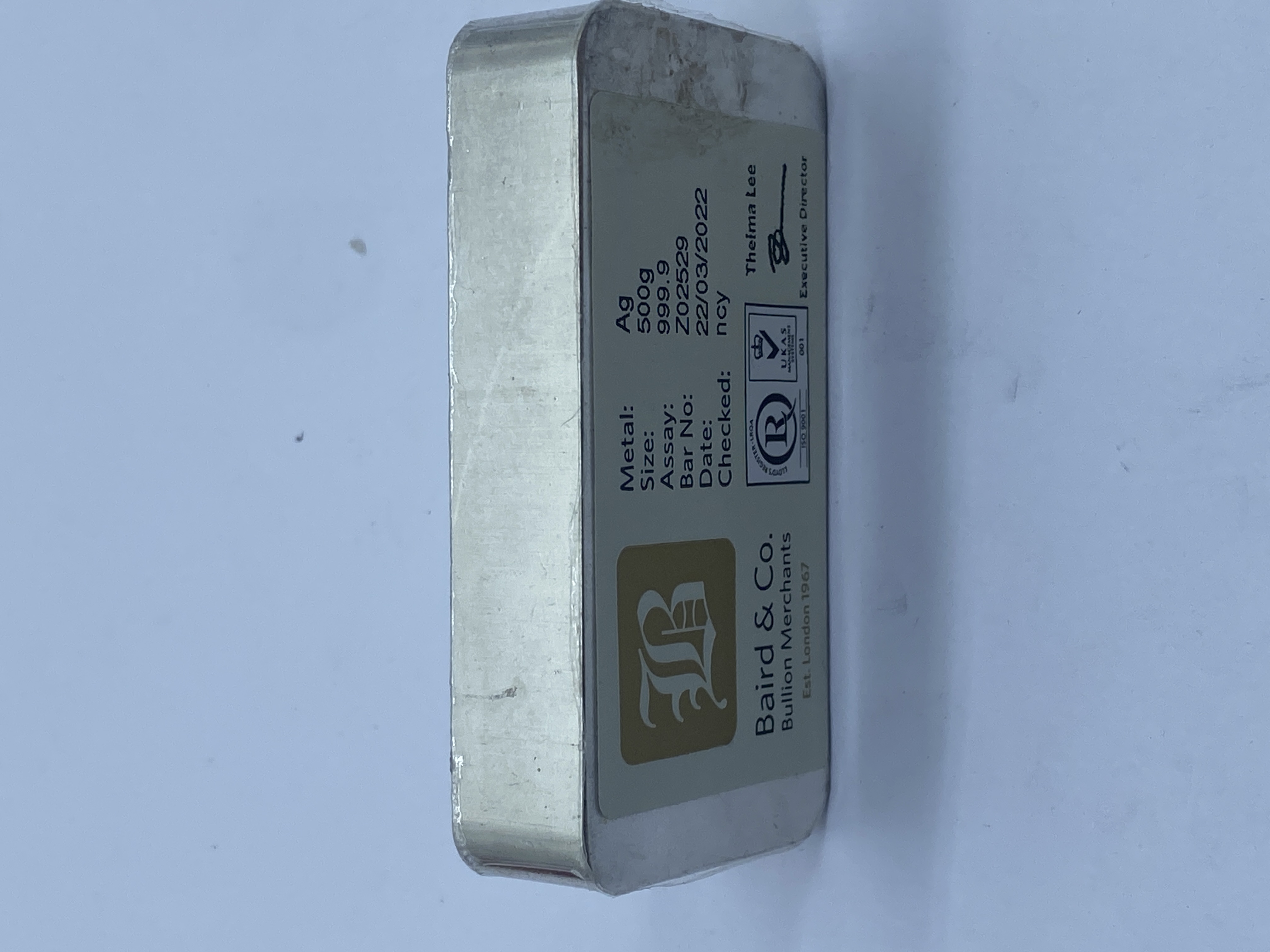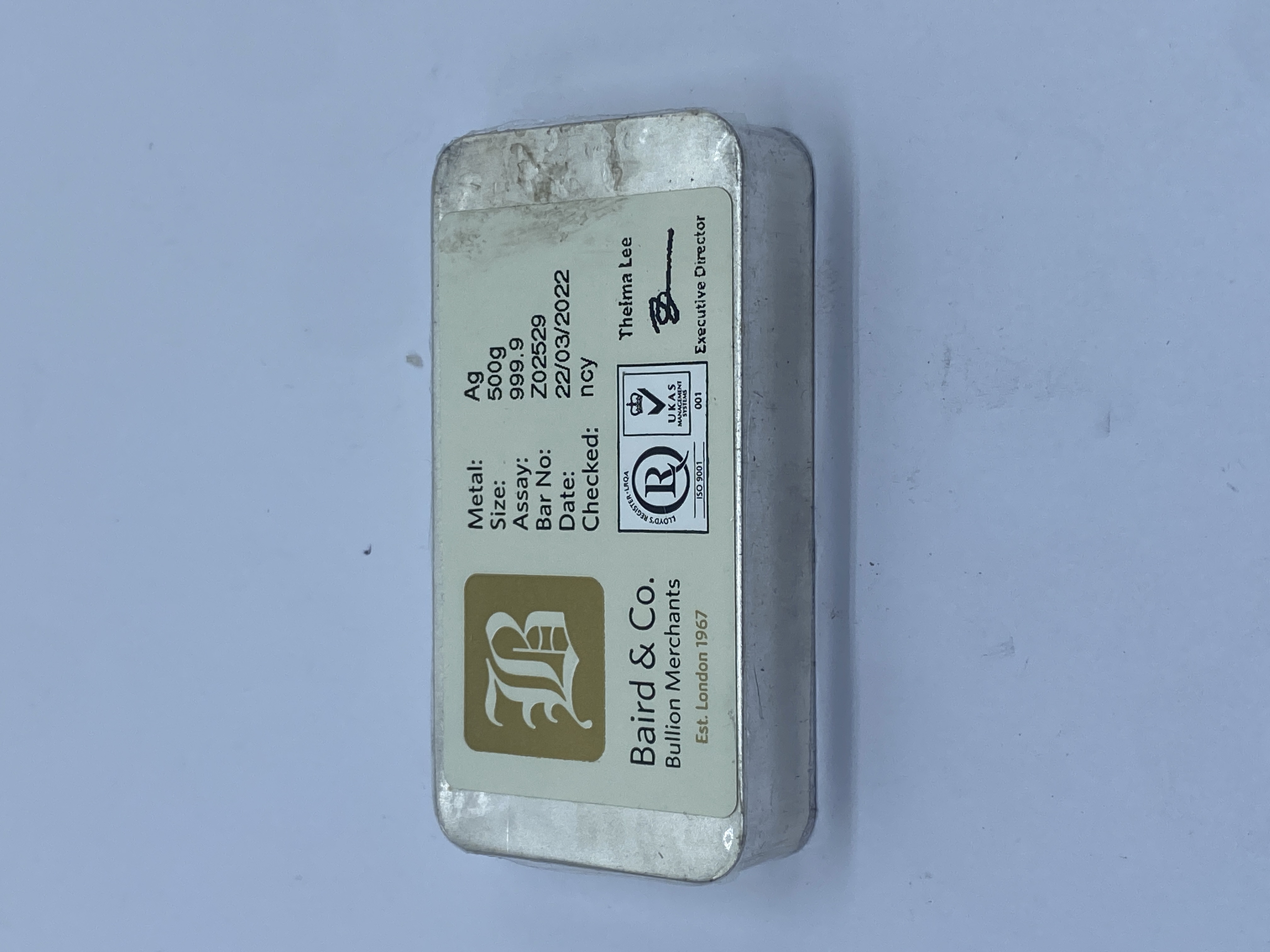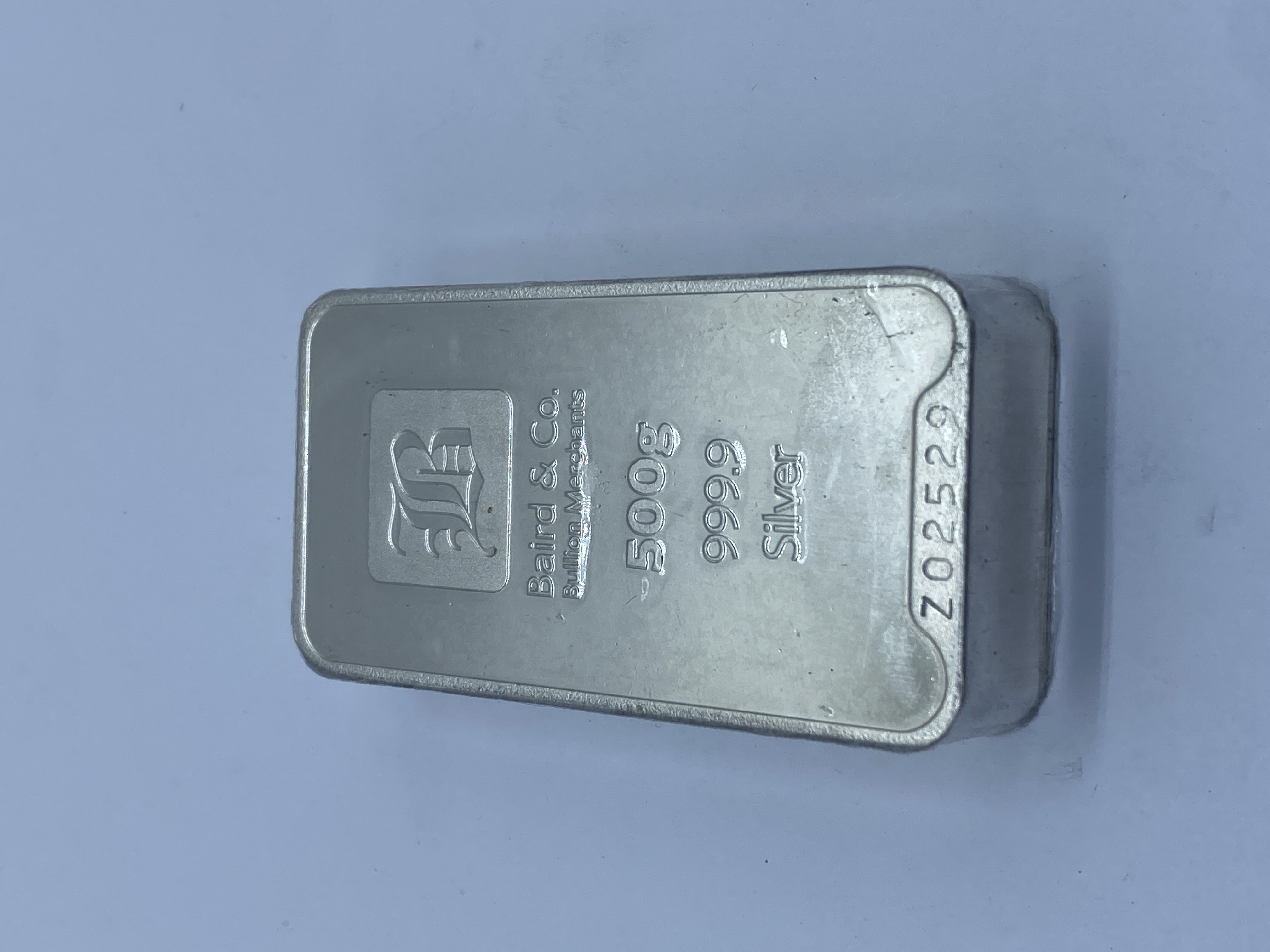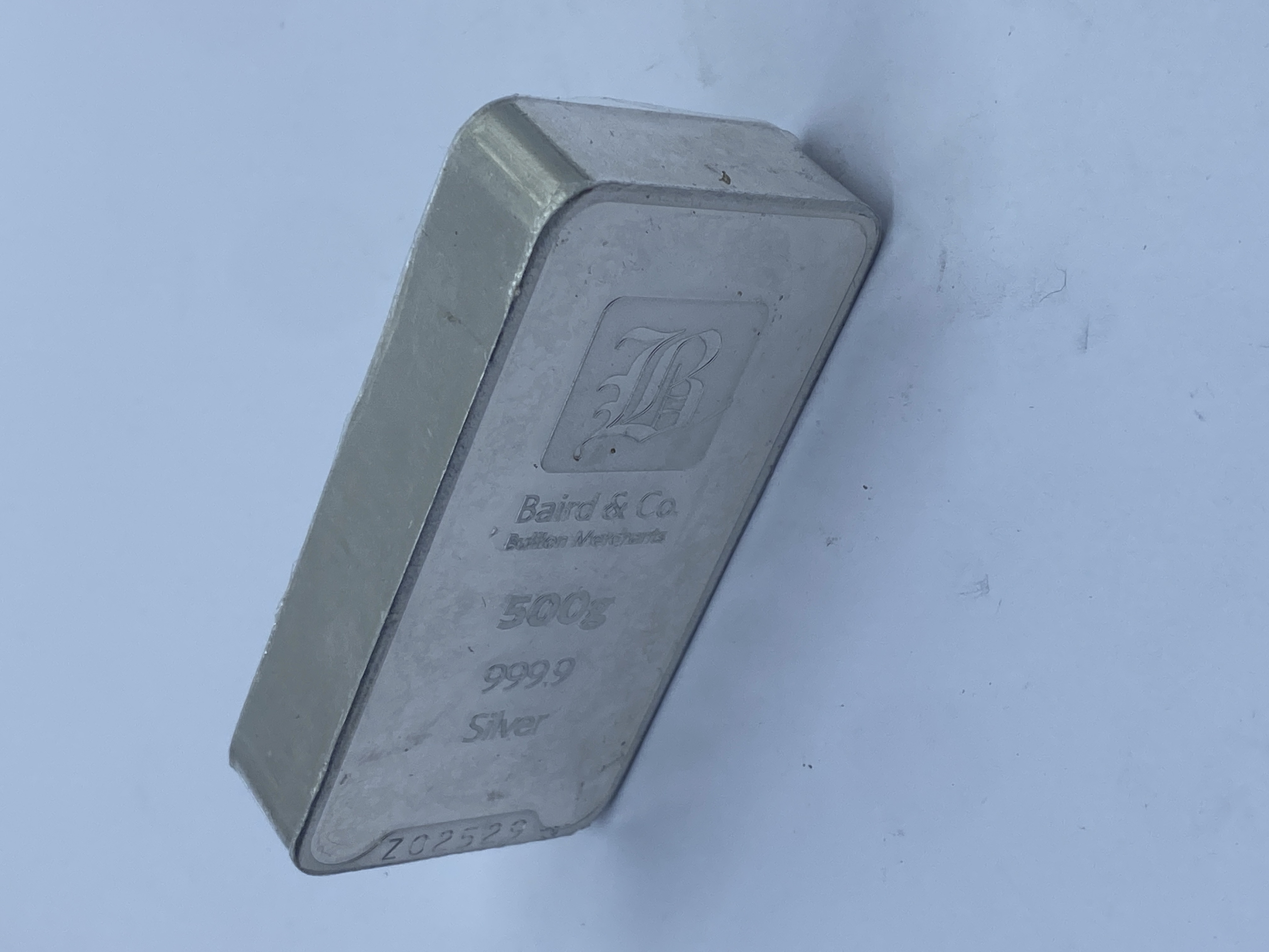 500g silver bar marked .999 fine silver.