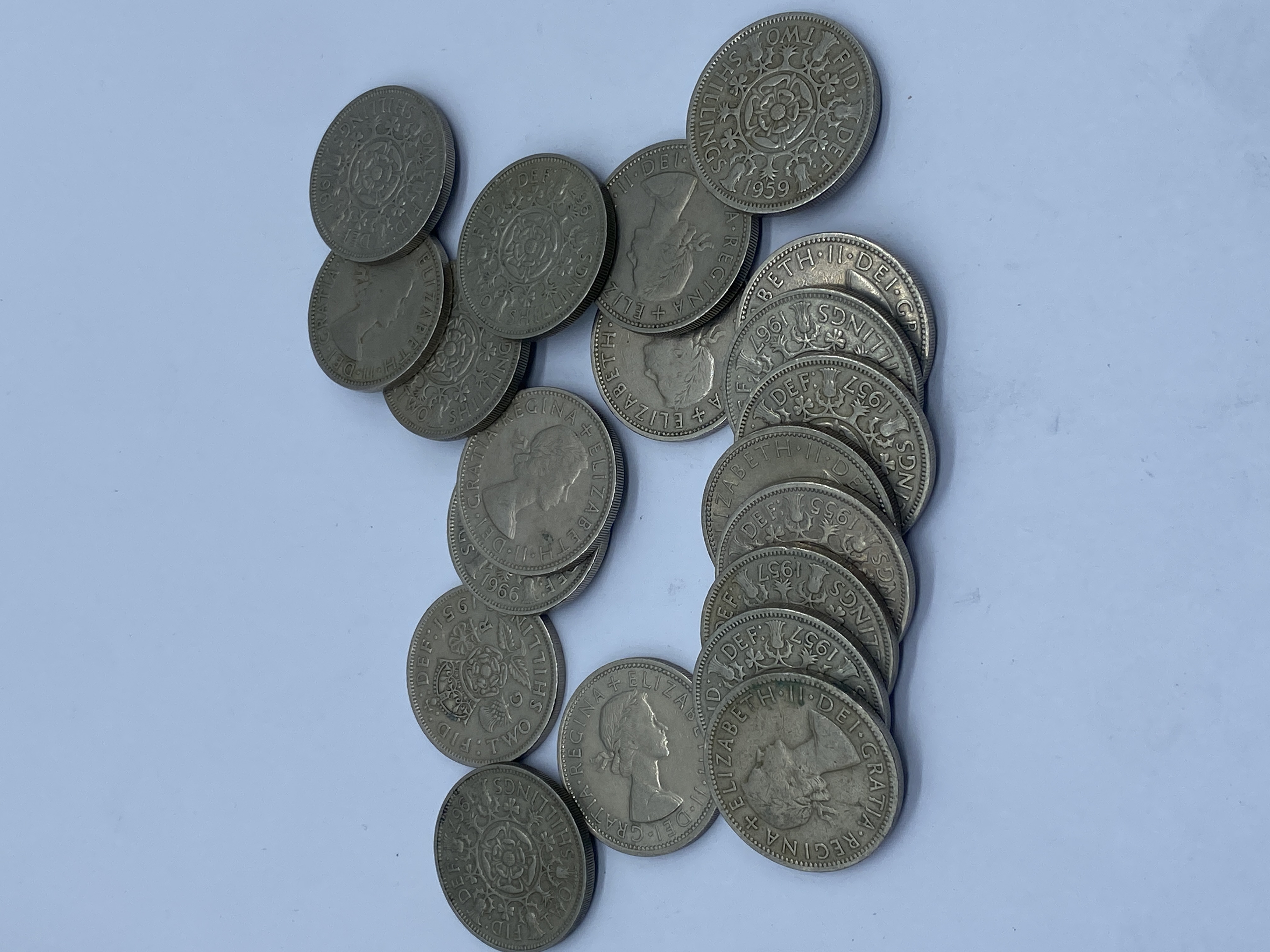 A pile of circulated British two shilling coins (florins) featuring Queen Elizabeth II.