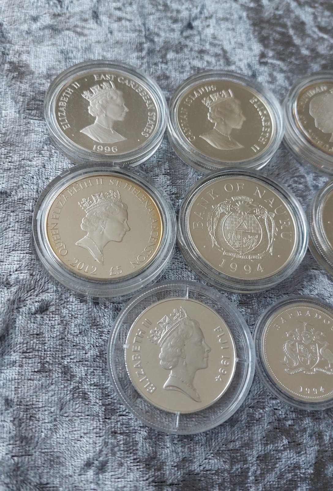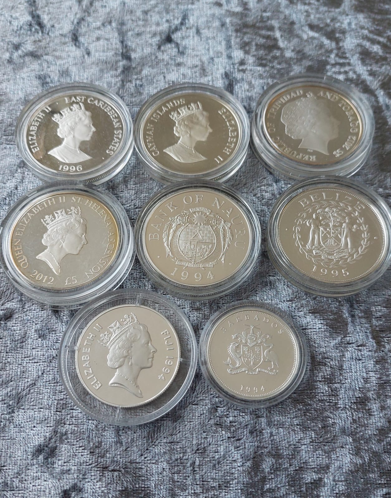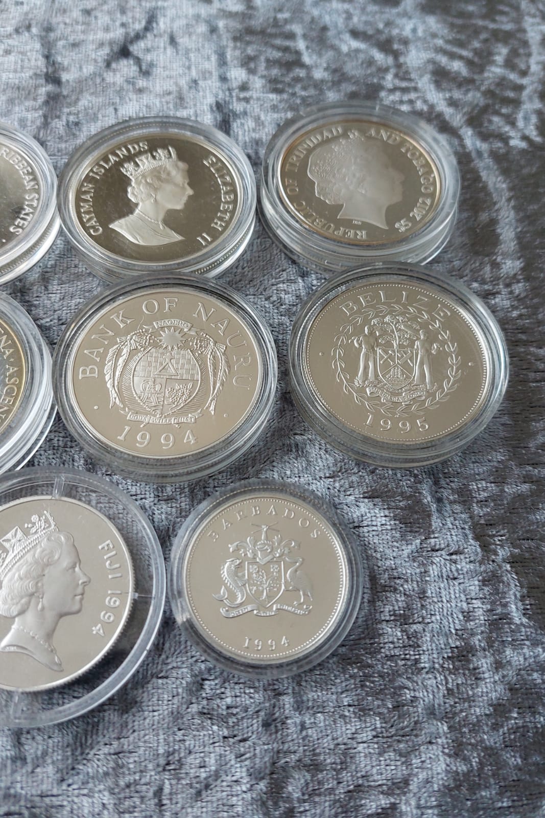 A collection of various silver commemorative coins from Nauru, Fiji, Trinidad and Tobago, Belize, and the East Caribbean States, including Nauru $10 and $5 coins.