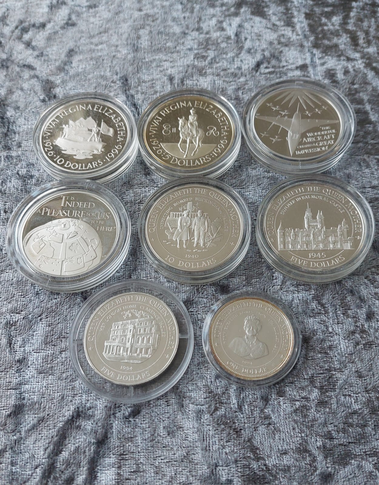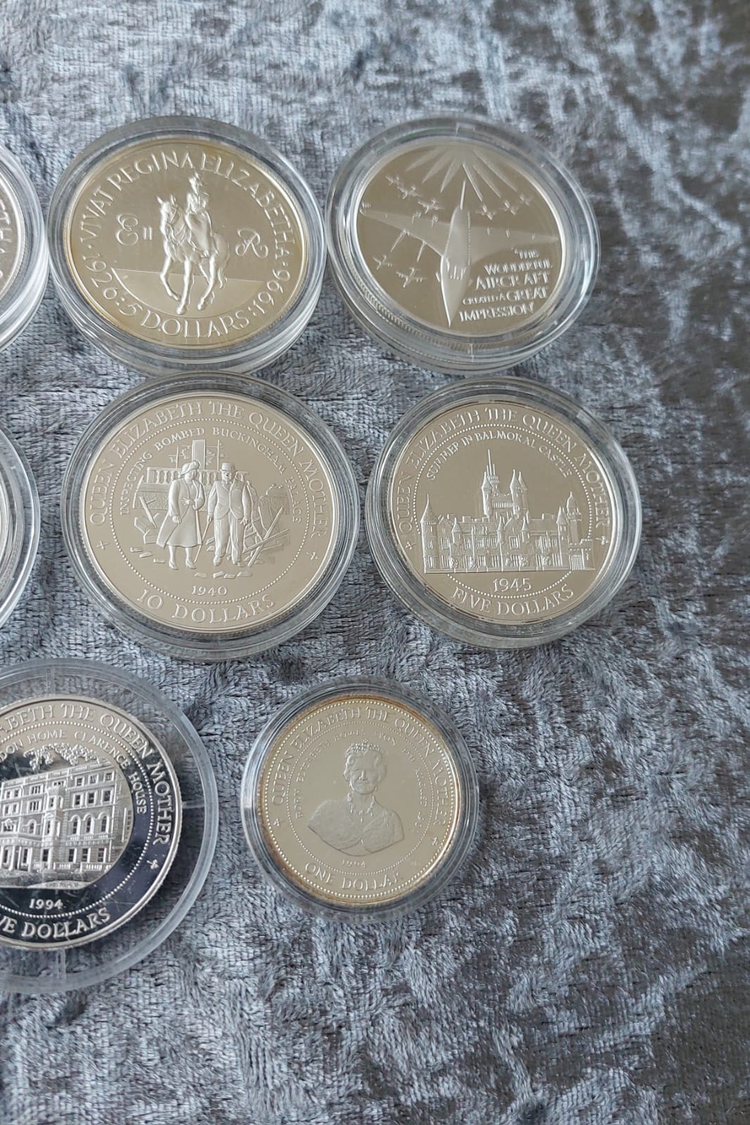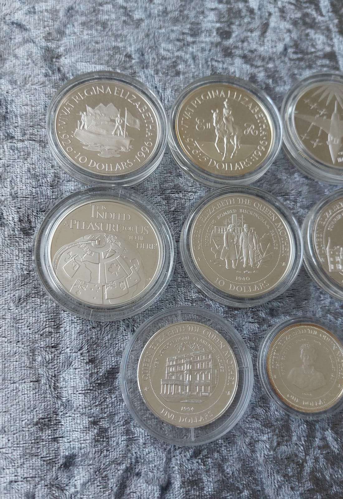 A collection of various silver commemorative coins from Nauru, Fiji, Trinidad and Tobago, Belize, and the East Caribbean States, including Nauru $10 and $5 coins.