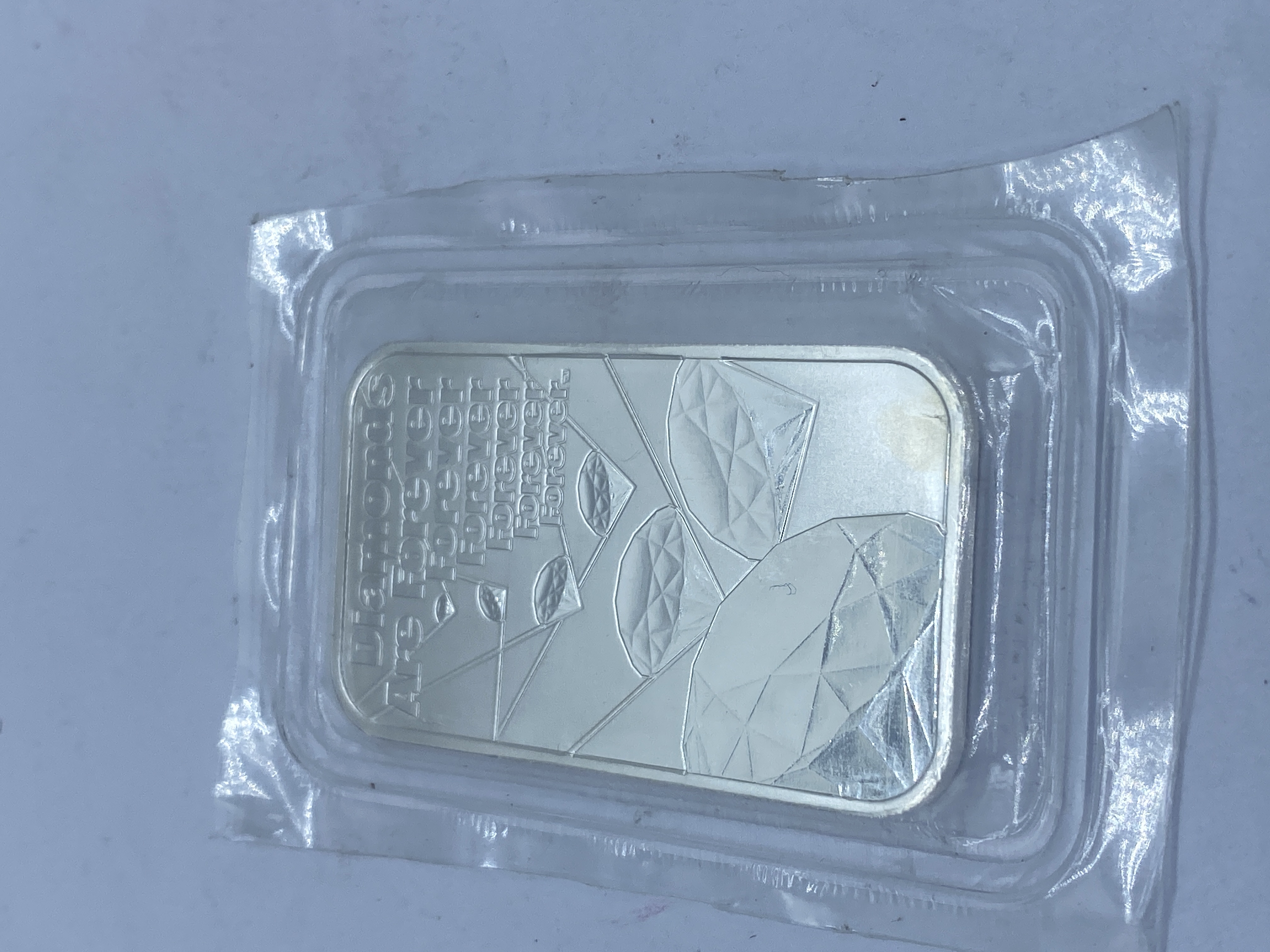 One troy ounce .999 fine silver bar featuring a James Bond Diamonds Are Forever design.