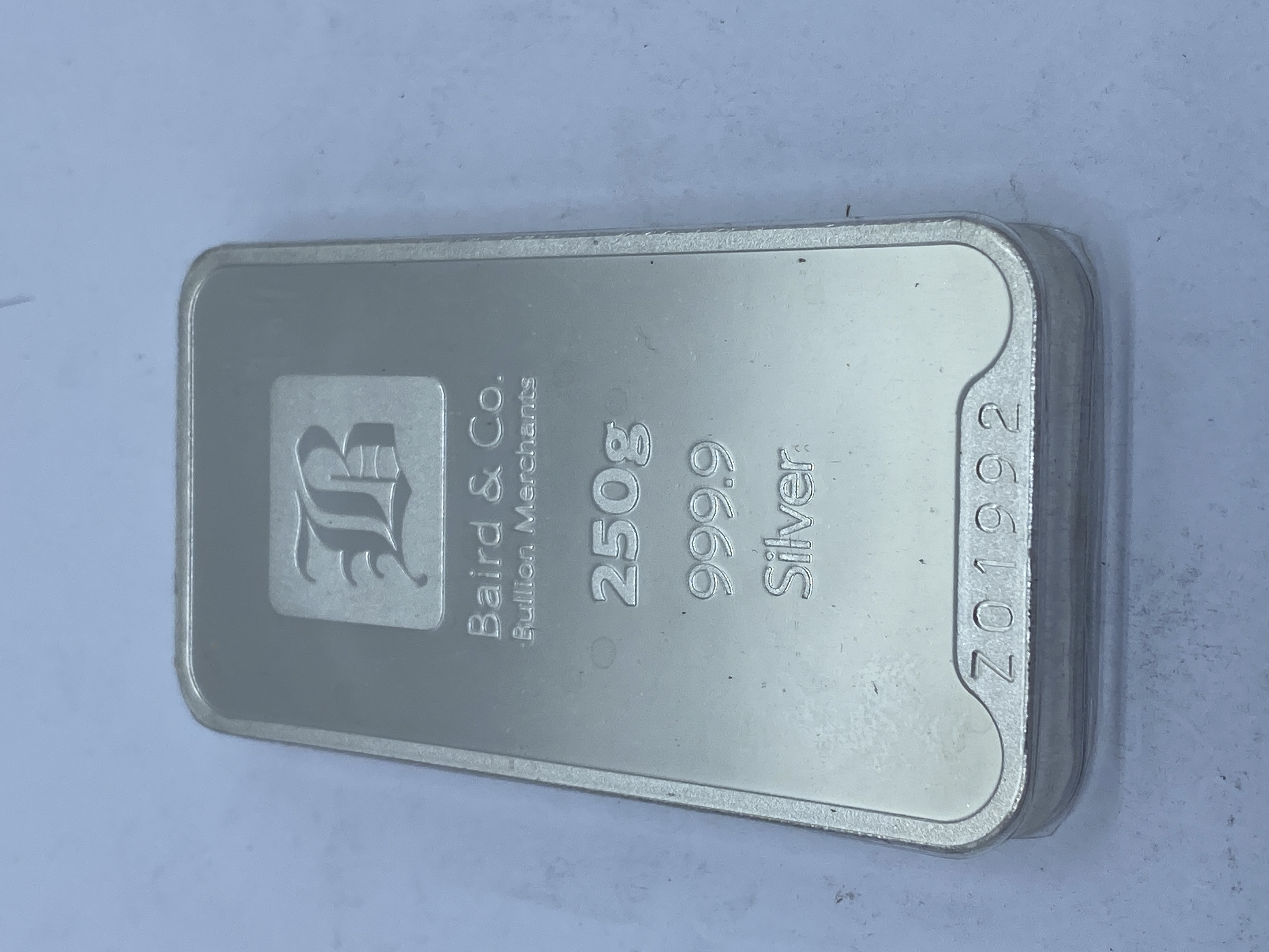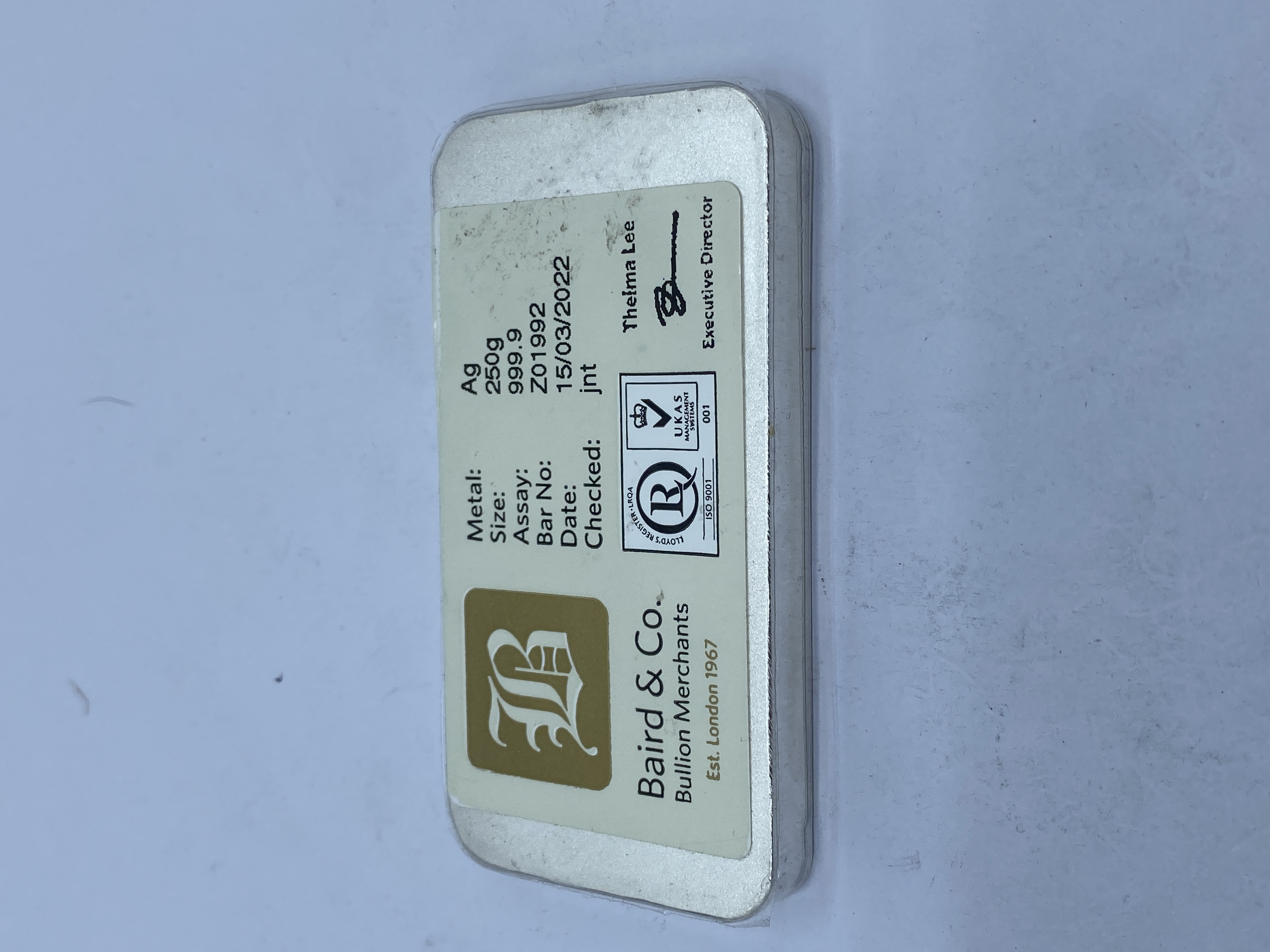 A 250g silver bar by Baird & Co., marked .9999 fine.