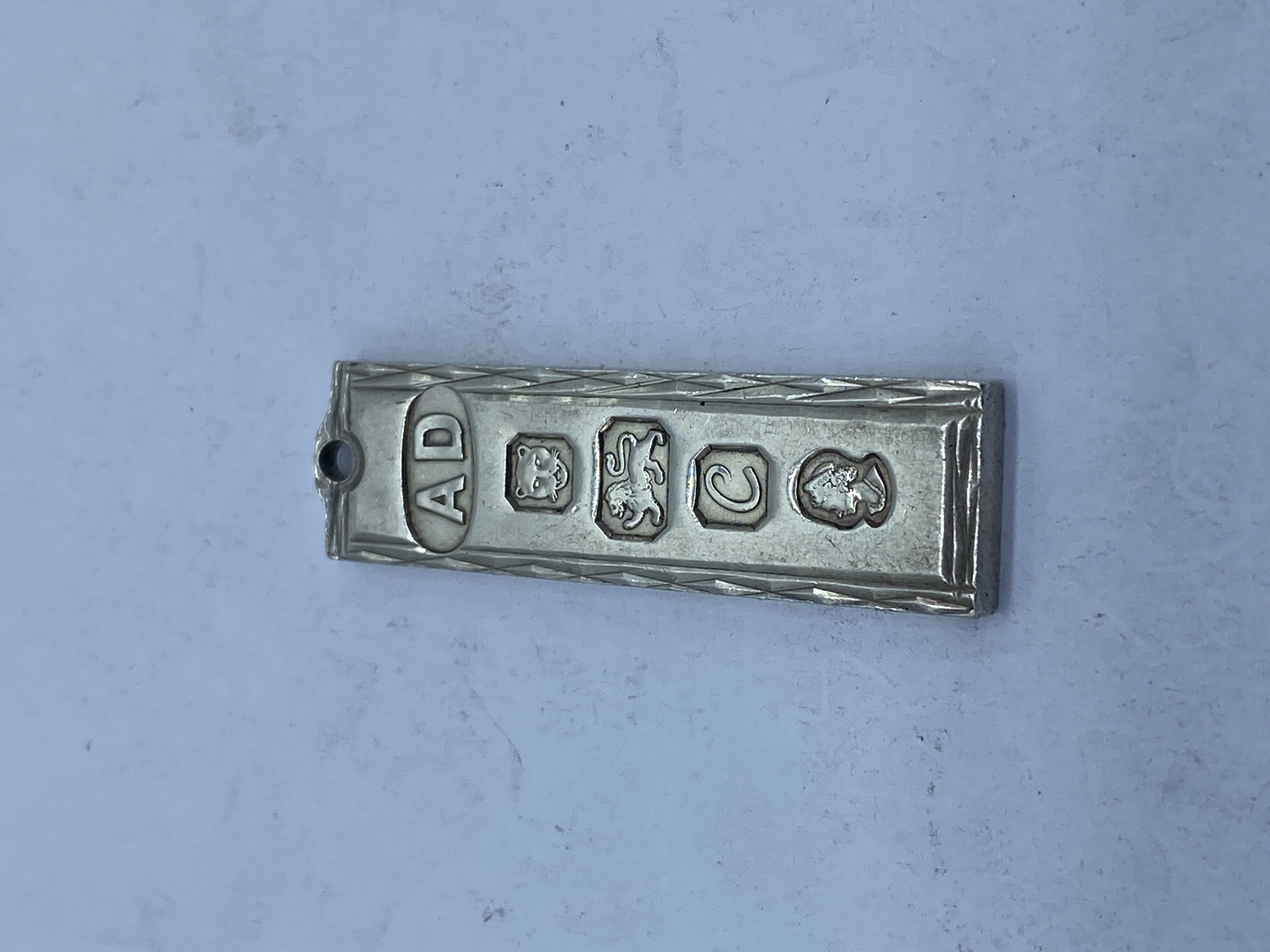 Silver-colored metal ingot pendant or keychain.