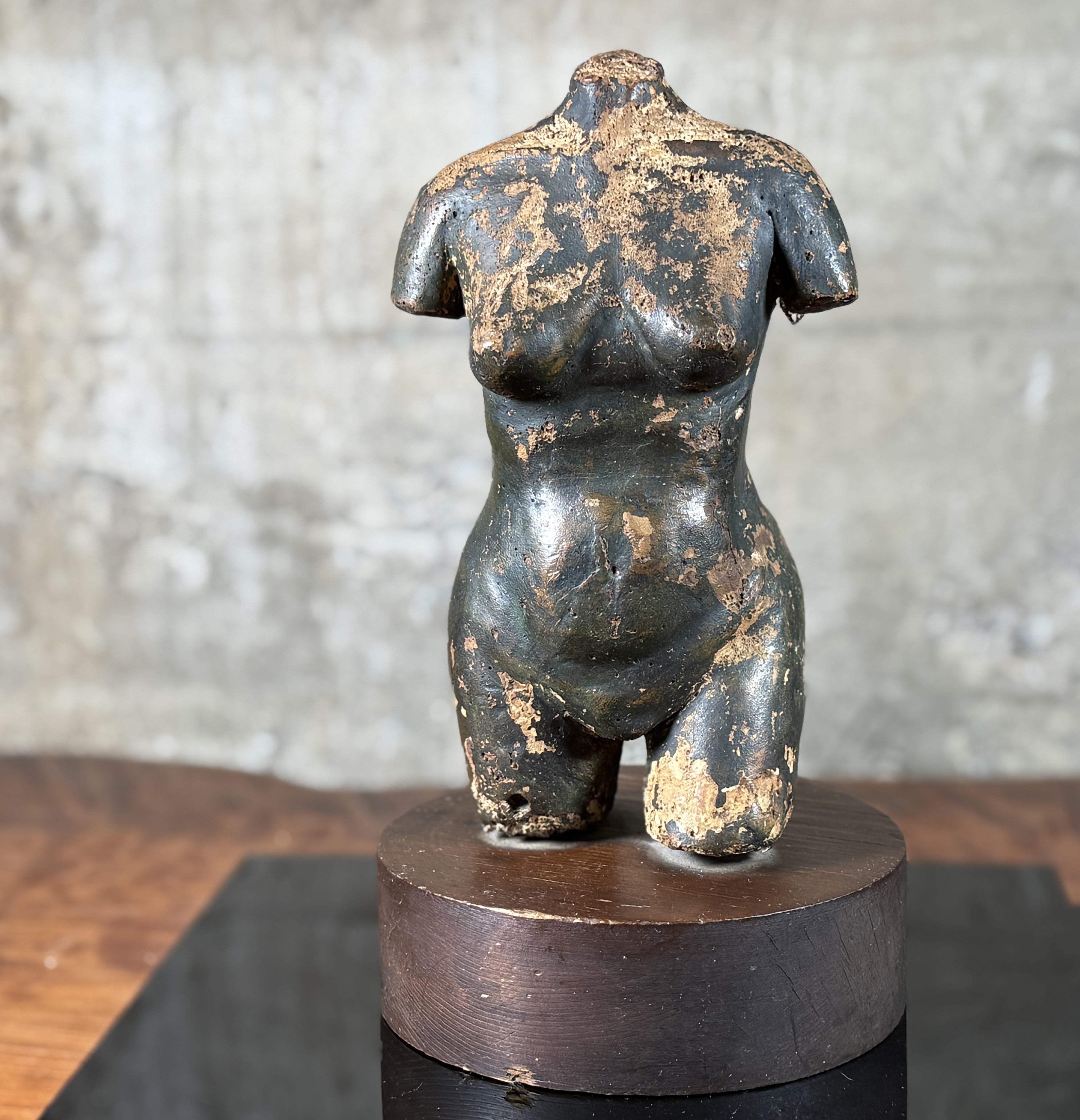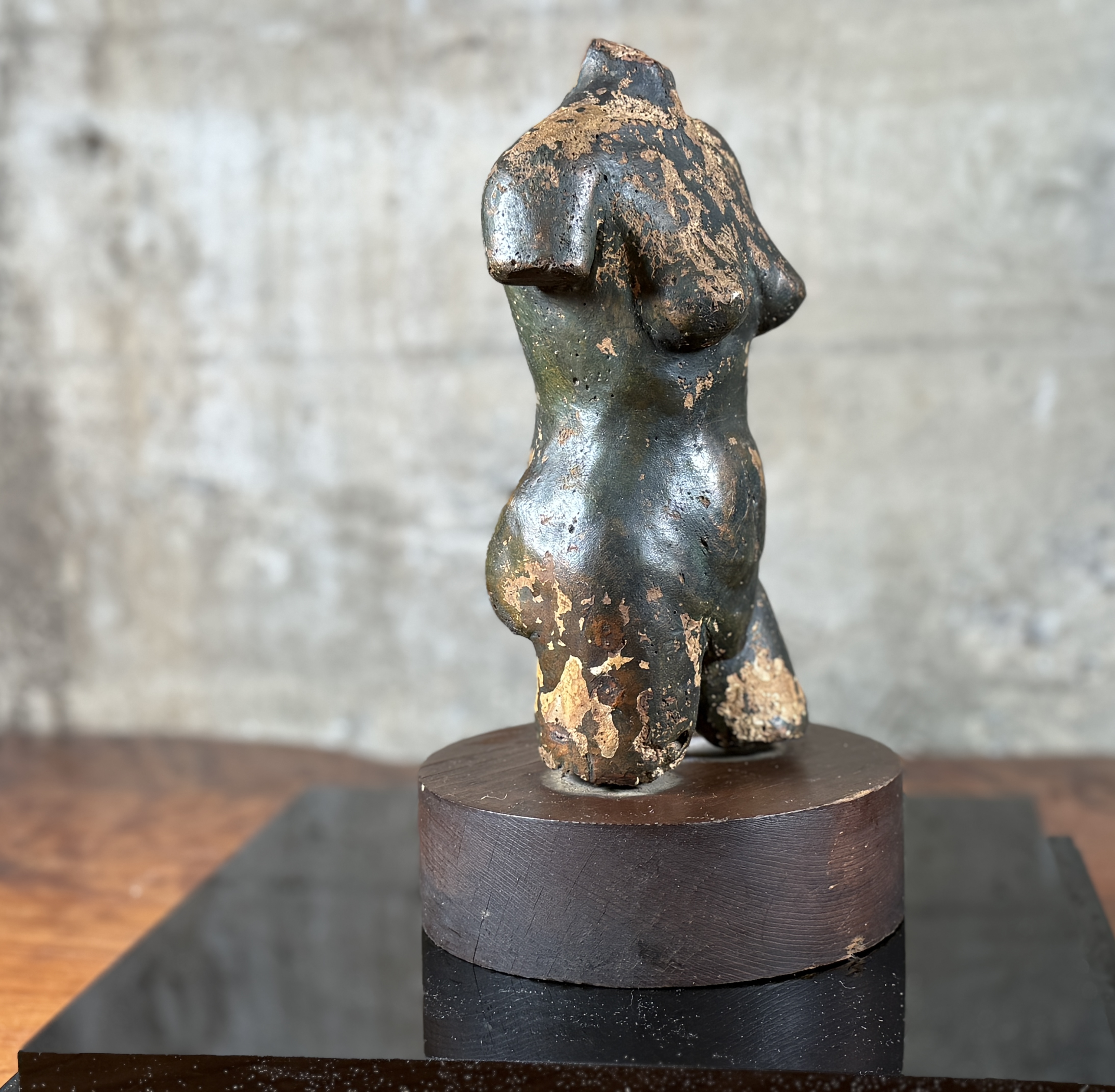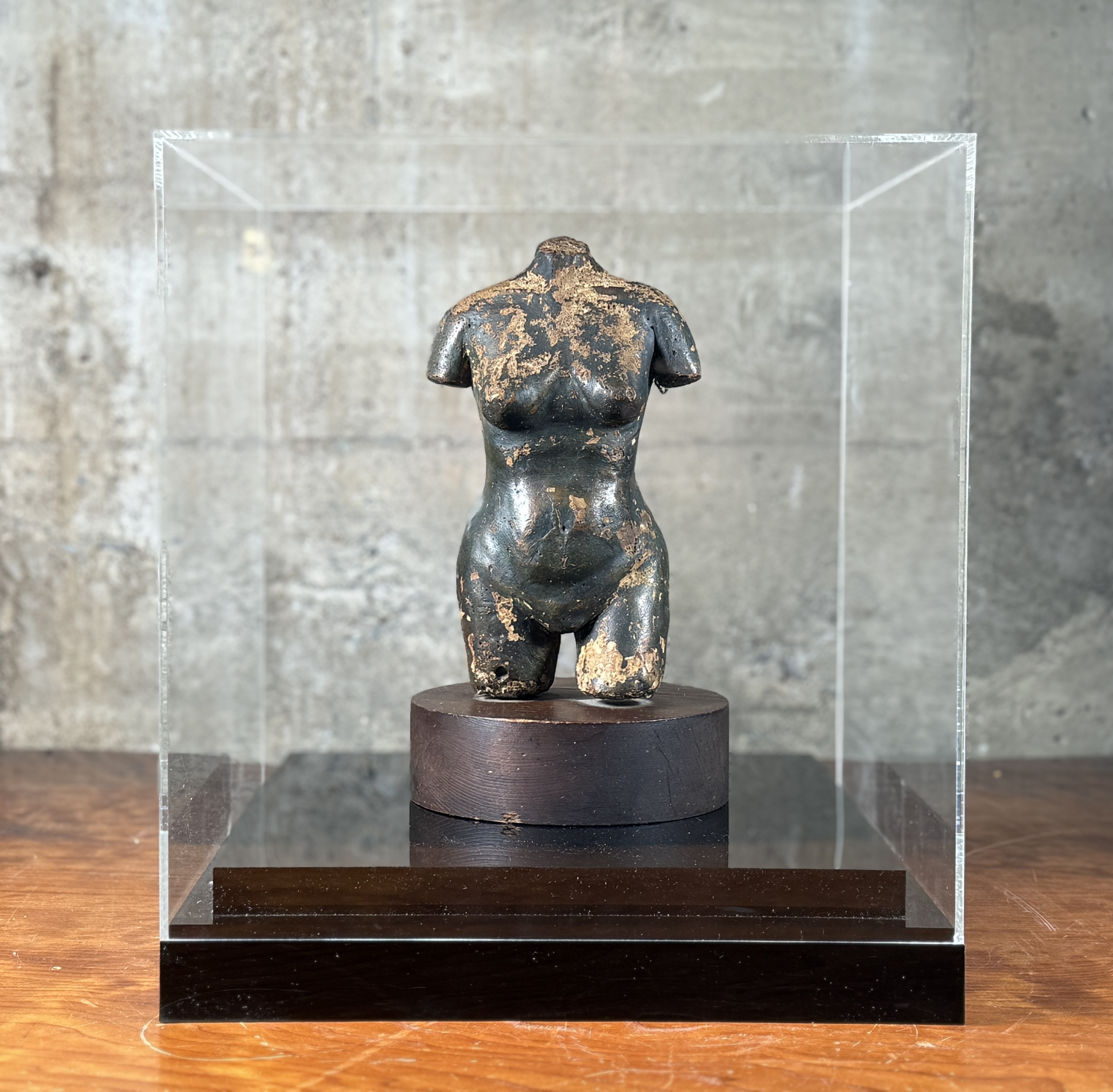 A small-scale sculpture depicting an abstracted or stylized female torso, consistent with classical or archaic-inspired forms, lacking definitive features for the head, arms, and lower legs. The figure is crafted from a dark, possibly metallic or composite material, exhibiting a heavily distressed surface with significant loss of the dark outer layer, revealing a lighter, ochre-toned material beneath. It is presented on a dark circular wood plinth within a clear acrylic display case.