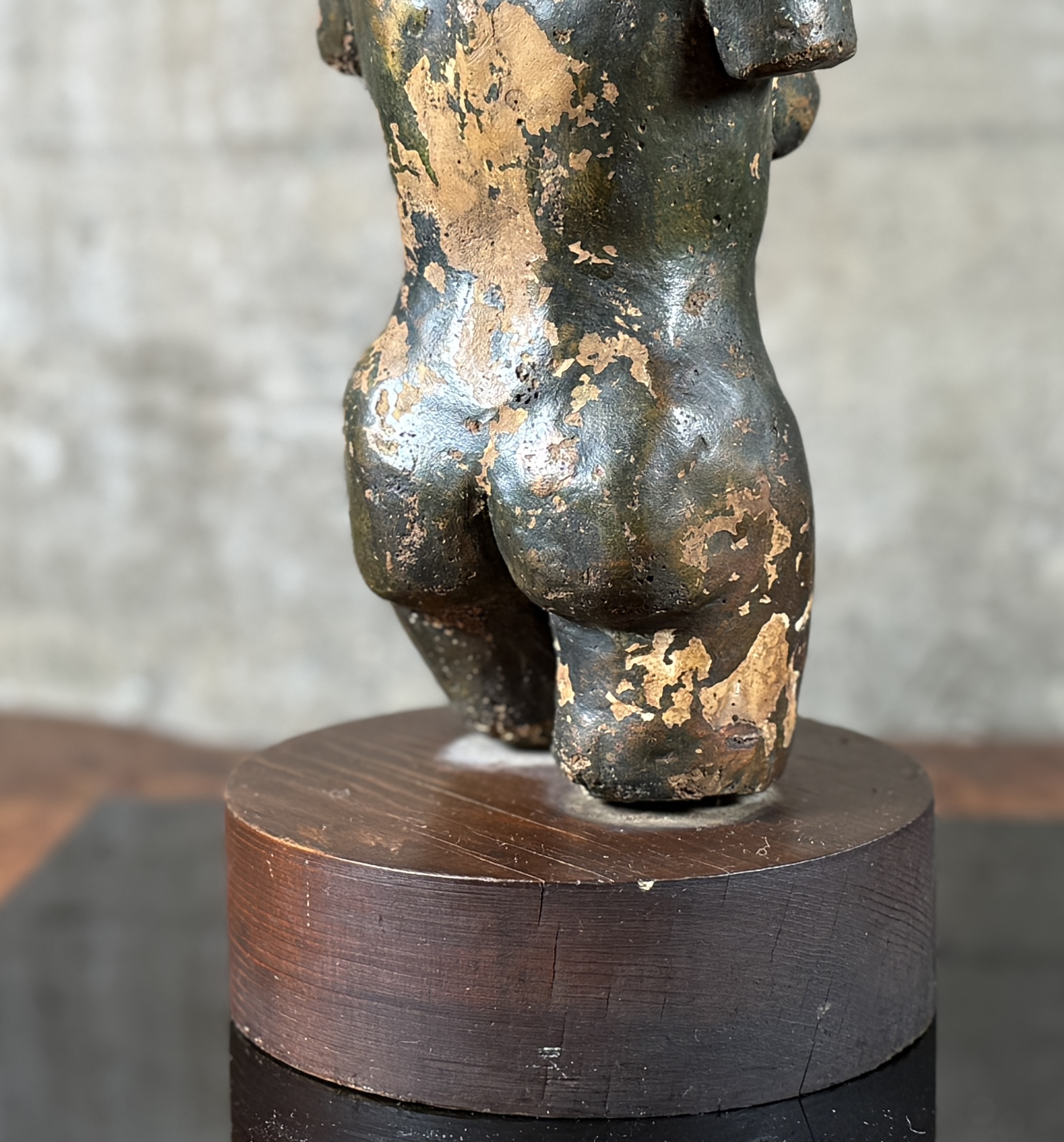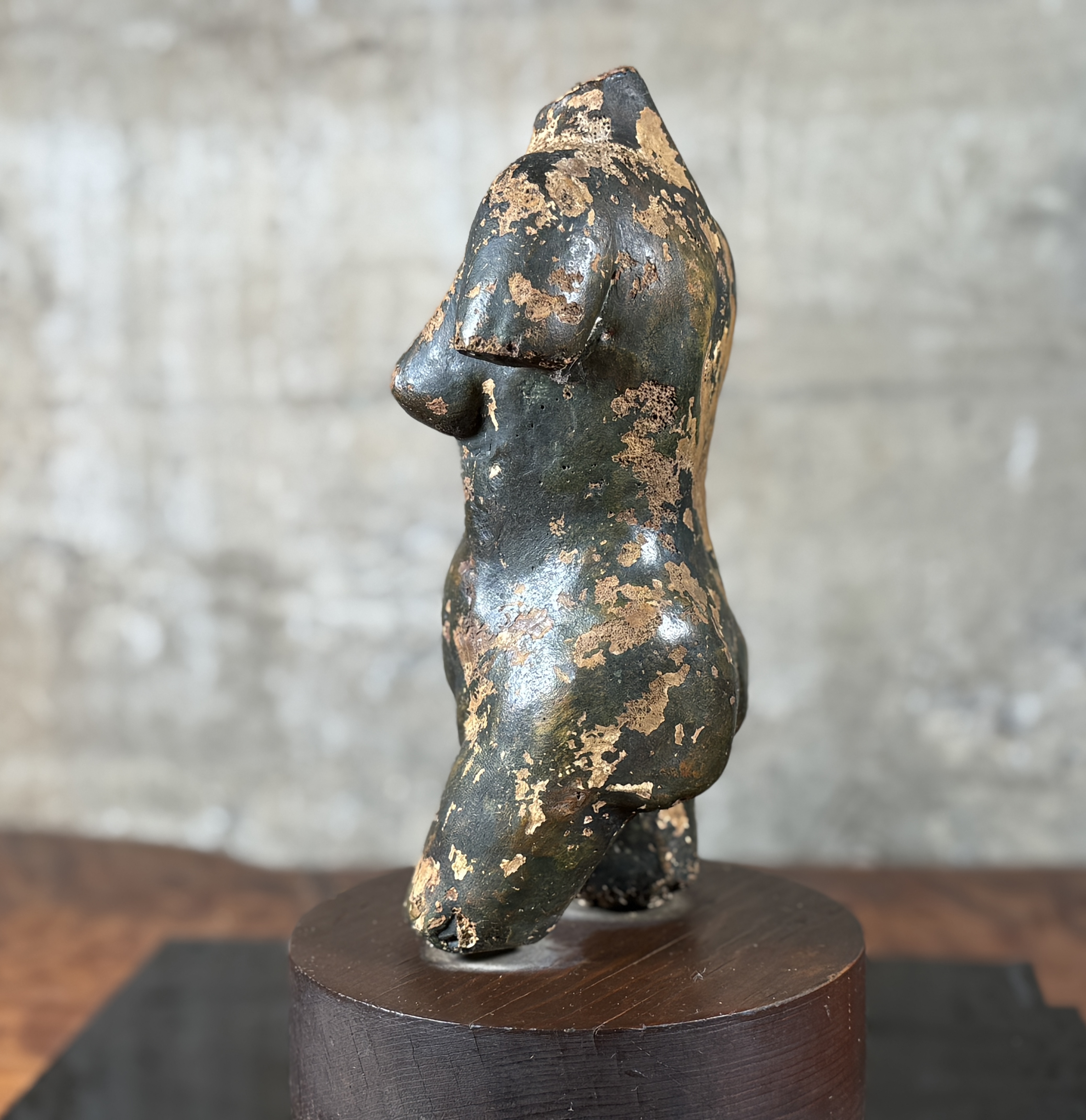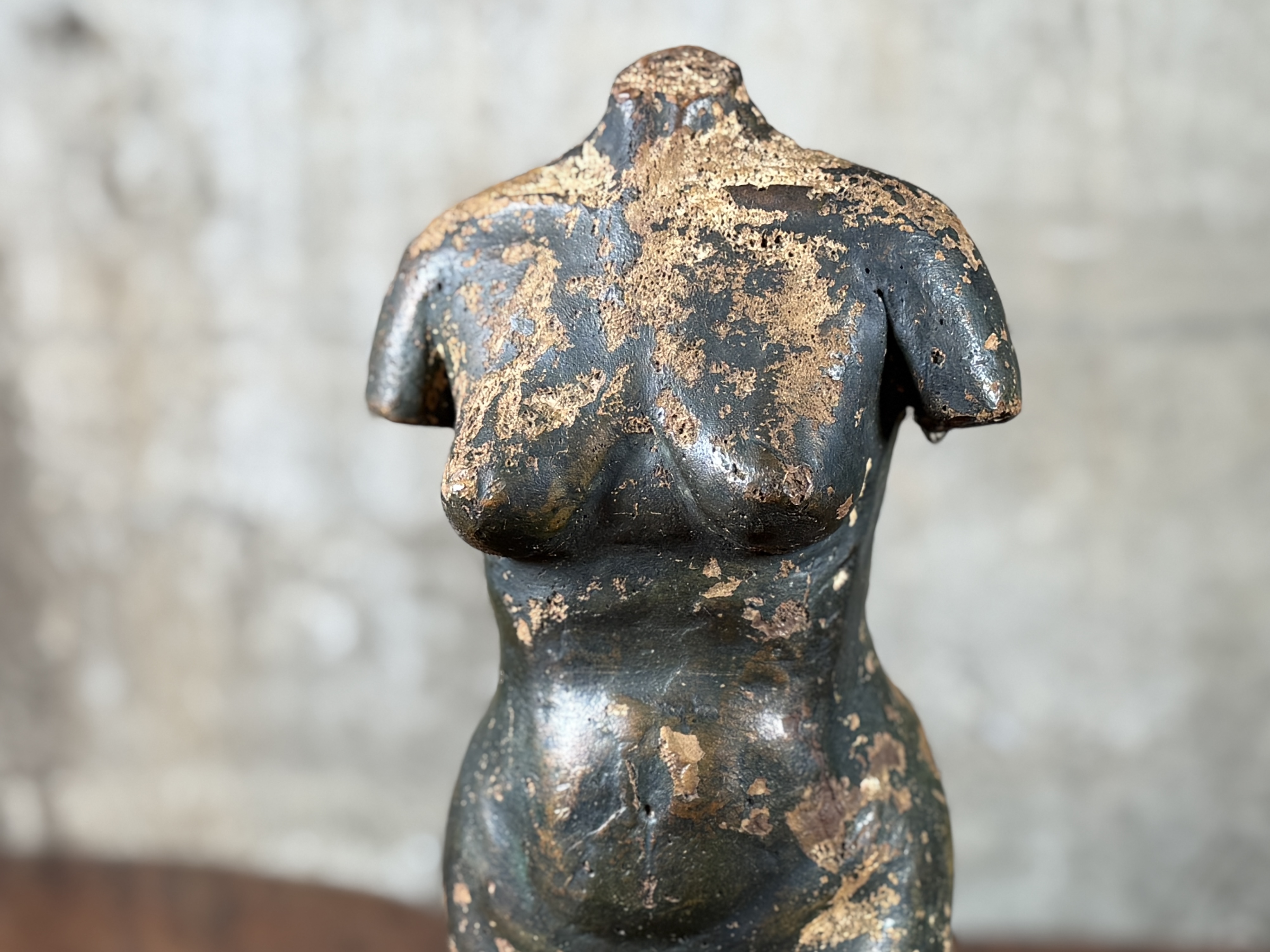 A small-scale sculpture depicting an abstracted or stylized female torso, consistent with classical or archaic-inspired forms, lacking definitive features for the head, arms, and lower legs. The figure is crafted from a dark, possibly metallic or composite material, exhibiting a heavily distressed surface with significant loss of the dark outer layer, revealing a lighter, ochre-toned material beneath. It is presented on a dark circular wood plinth within a clear acrylic display case.