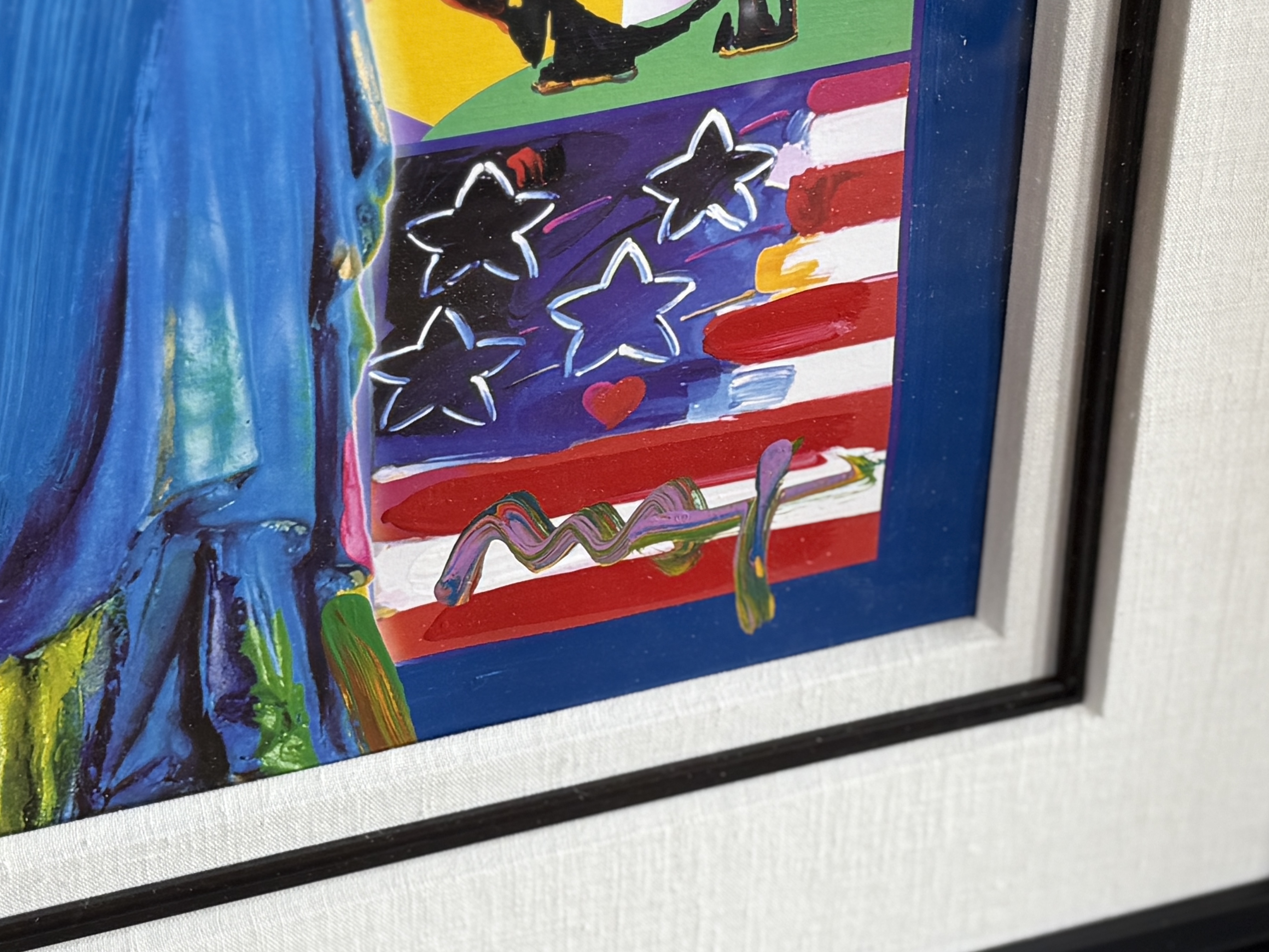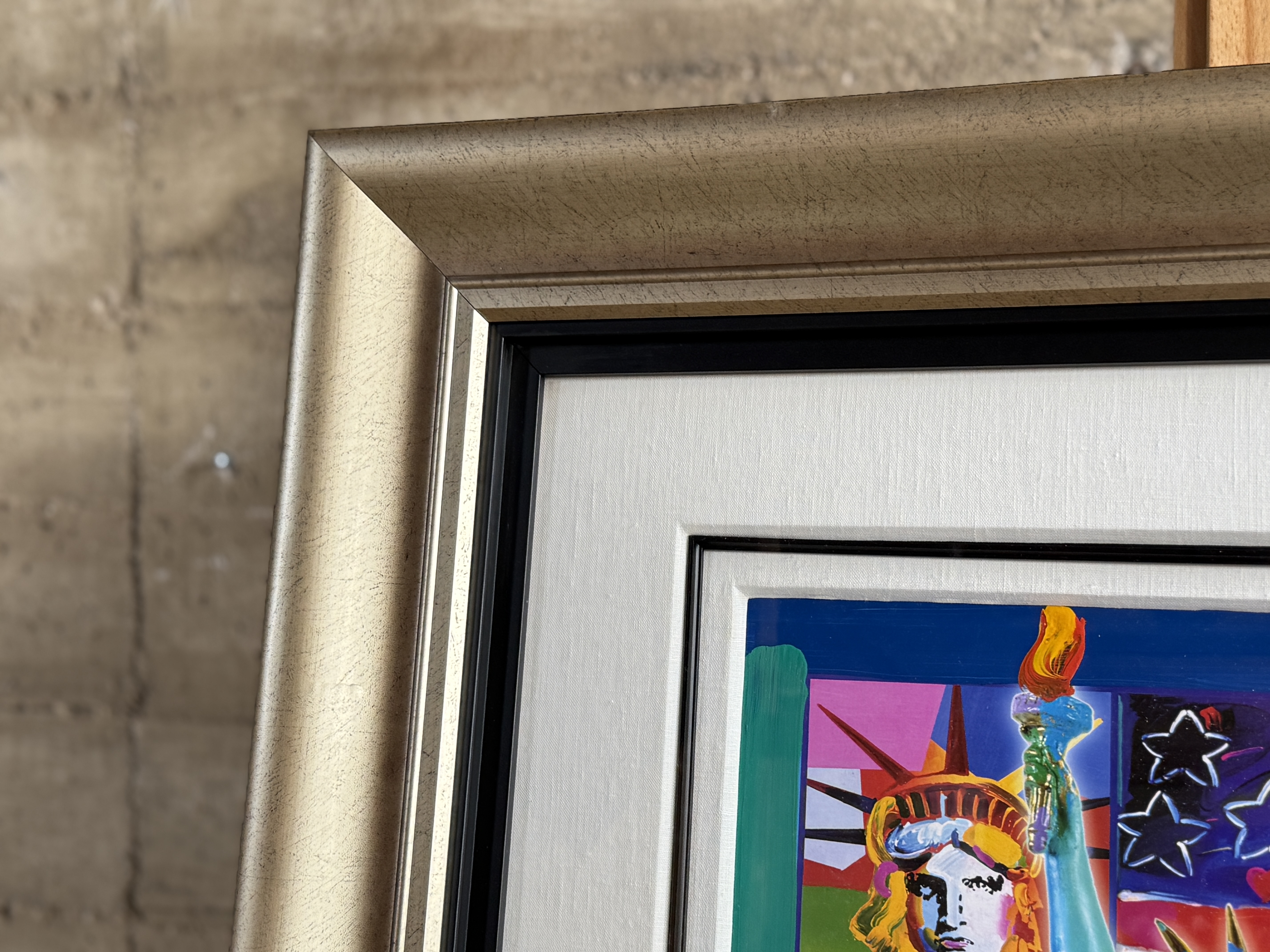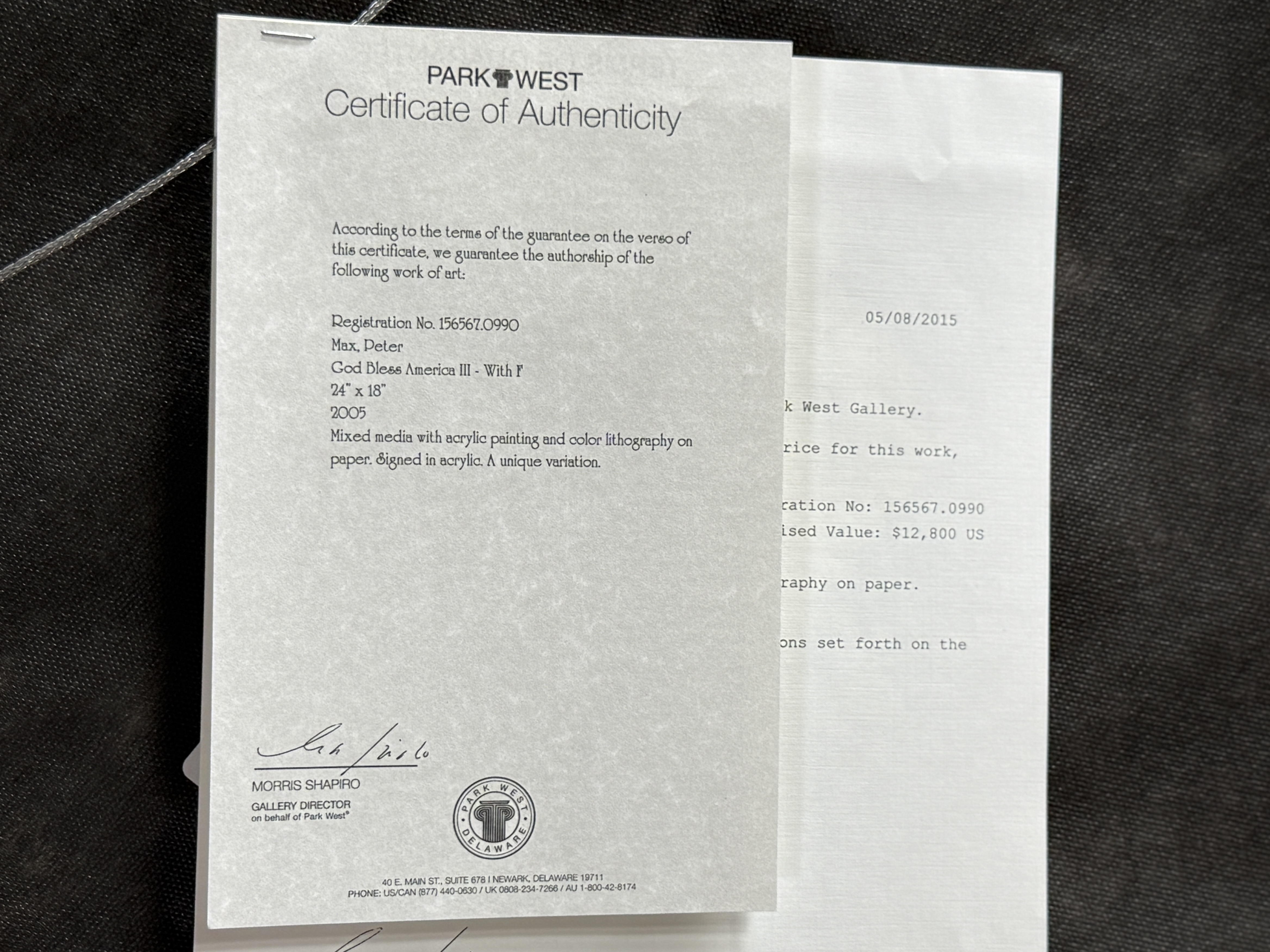 A mixed media artwork by Peter Max titled ‘God Bless America III – With F’, dated 2005. The piece features a stylized depiction of the Statue of Liberty in a bold, colorful Pop Art or contemporary style. The central full-body figure of Lady Liberty is set against a grid background incorporating smaller abstracted Statue of Liberty heads and American flag motifs. The artwork is executed in mixed media with acrylic painting and color lithography on paper, exhibiting visible impasto. A prominent signature, “MAX,” is visible in colorful paint on the lower right. The artwork is housed under glazing within a wide, off-white fabric-lined mat and a thin black inner fillet, set within a metallic-finished frame. A “PARK WEST Certificate of Authenticity” and a shipping label are attached to the verso, both identifying the artist as “Peter Max,” the title as “God Bless America III – With F,” and the date as “2005,” along with a registration number. The sheet dimensions are noted on the certificate.