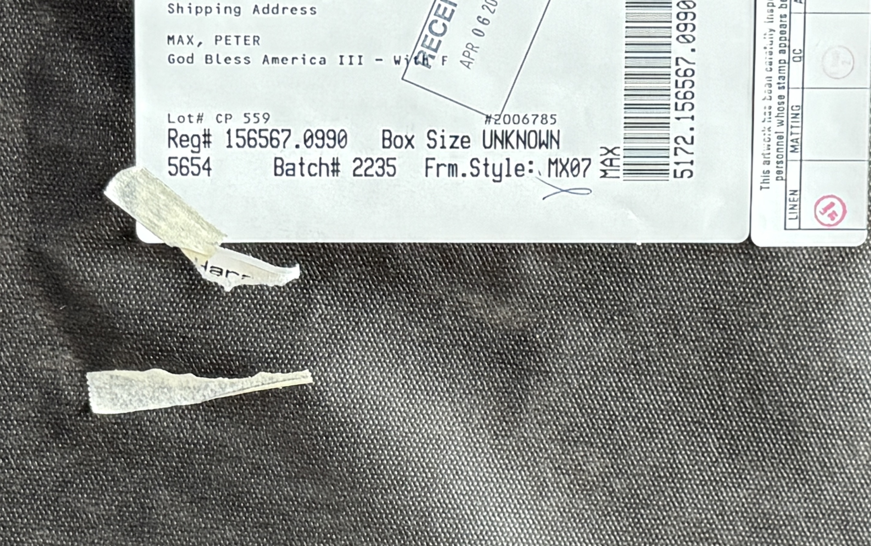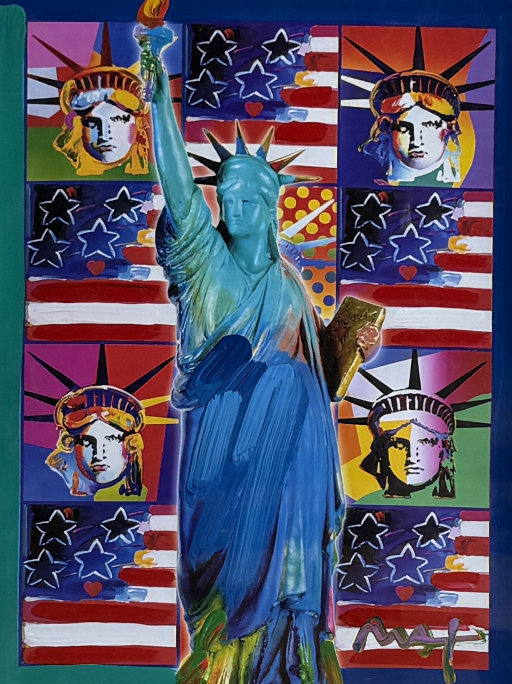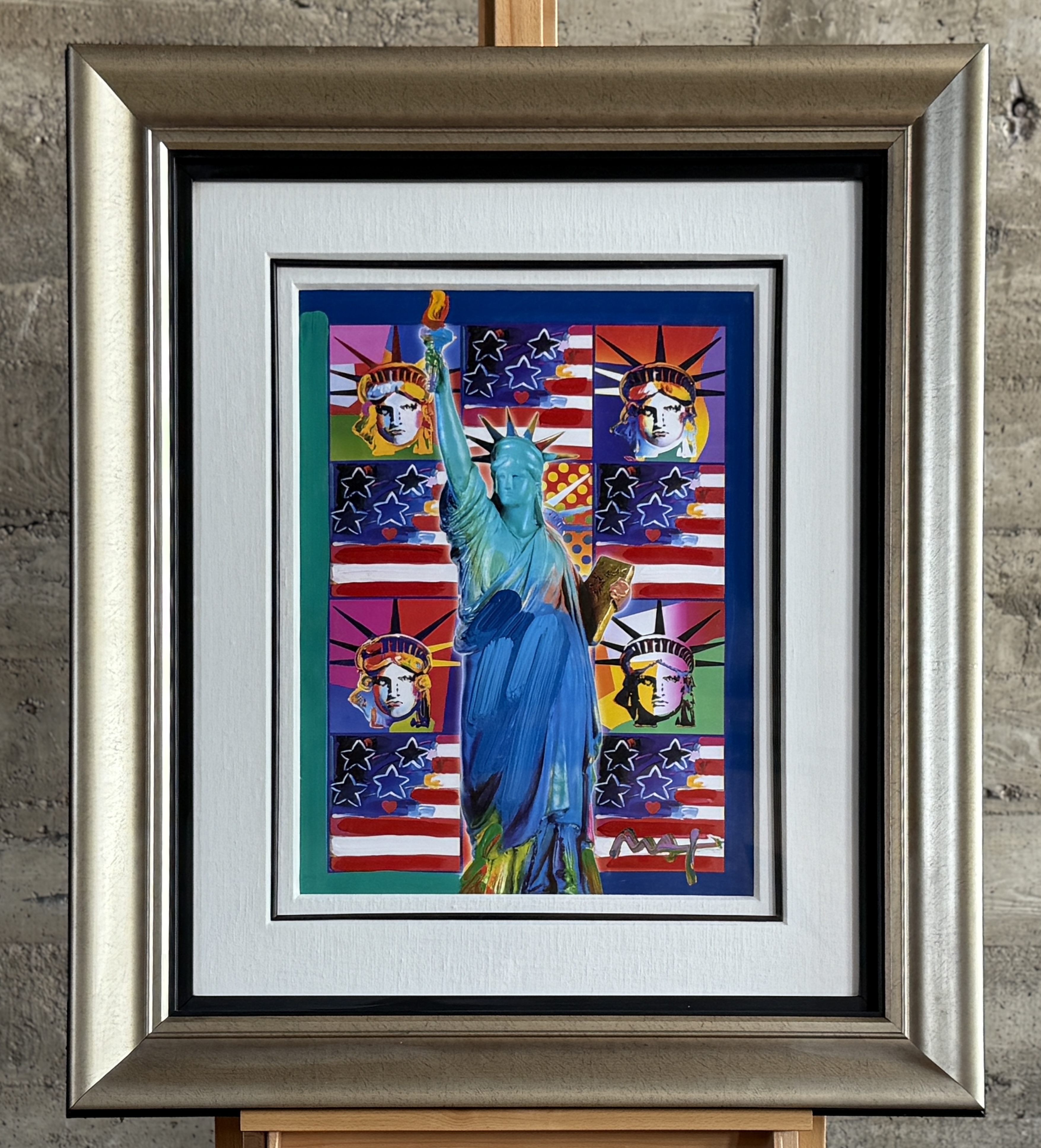 A mixed media artwork by Peter Max titled ‘God Bless America III – With F’, dated 2005. The piece features a stylized depiction of the Statue of Liberty in a bold, colorful Pop Art or contemporary style. The central full-body figure of Lady Liberty is set against a grid background incorporating smaller abstracted Statue of Liberty heads and American flag motifs. The artwork is executed in mixed media with acrylic painting and color lithography on paper, exhibiting visible impasto. A prominent signature, “MAX,” is visible in colorful paint on the lower right. The artwork is housed under glazing within a wide, off-white fabric-lined mat and a thin black inner fillet, set within a metallic-finished frame. A “PARK WEST Certificate of Authenticity” and a shipping label are attached to the verso, both identifying the artist as “Peter Max,” the title as “God Bless America III – With F,” and the date as “2005,” along with a registration number. The sheet dimensions are noted on the certificate.