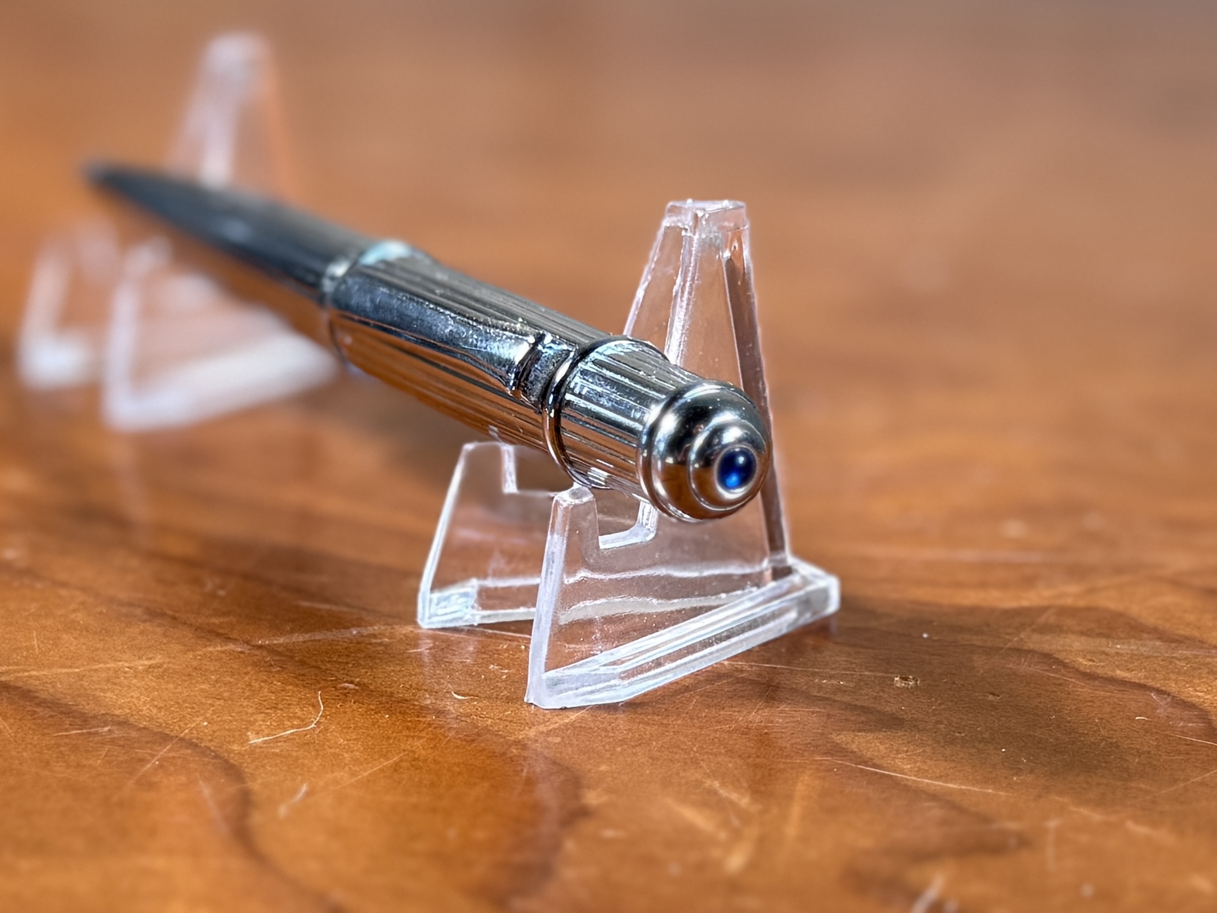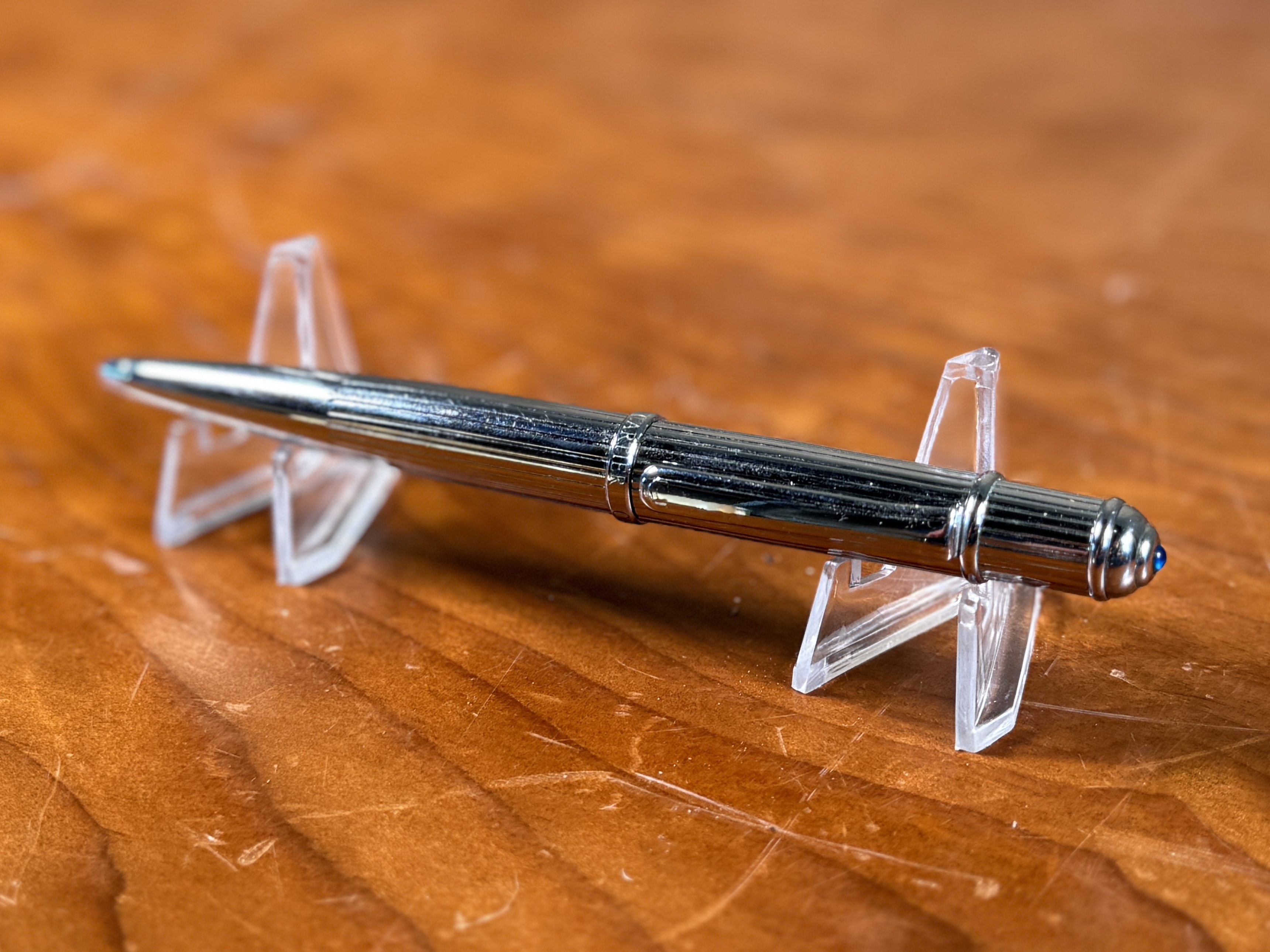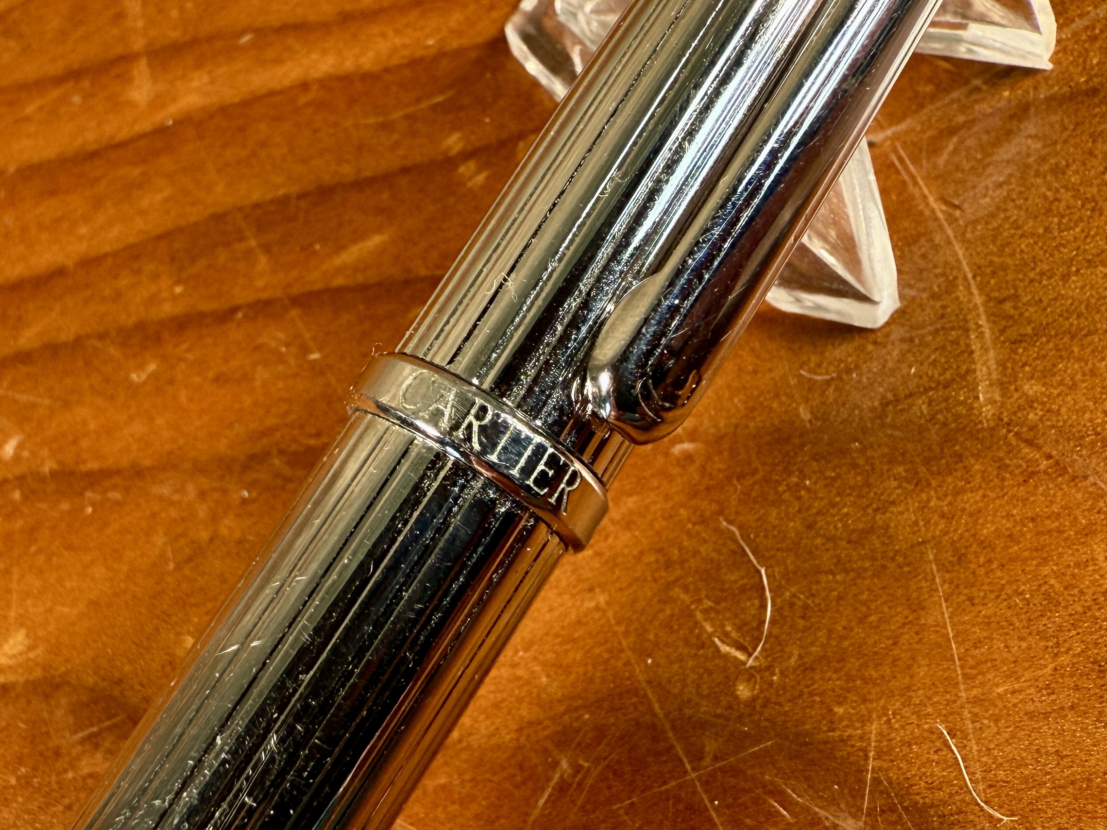 A Cartier Diabolo Platinum Plated Ballpoint Pen. This modern-style writing instrument is crafted from a silver-toned metal, featuring a distinctive fluted or reeded body design. A polished blue cabochon is set into the finial of the cap. The brand name ‘CARTIER’ is clearly engraved on a band encircling the cap near the clip.
