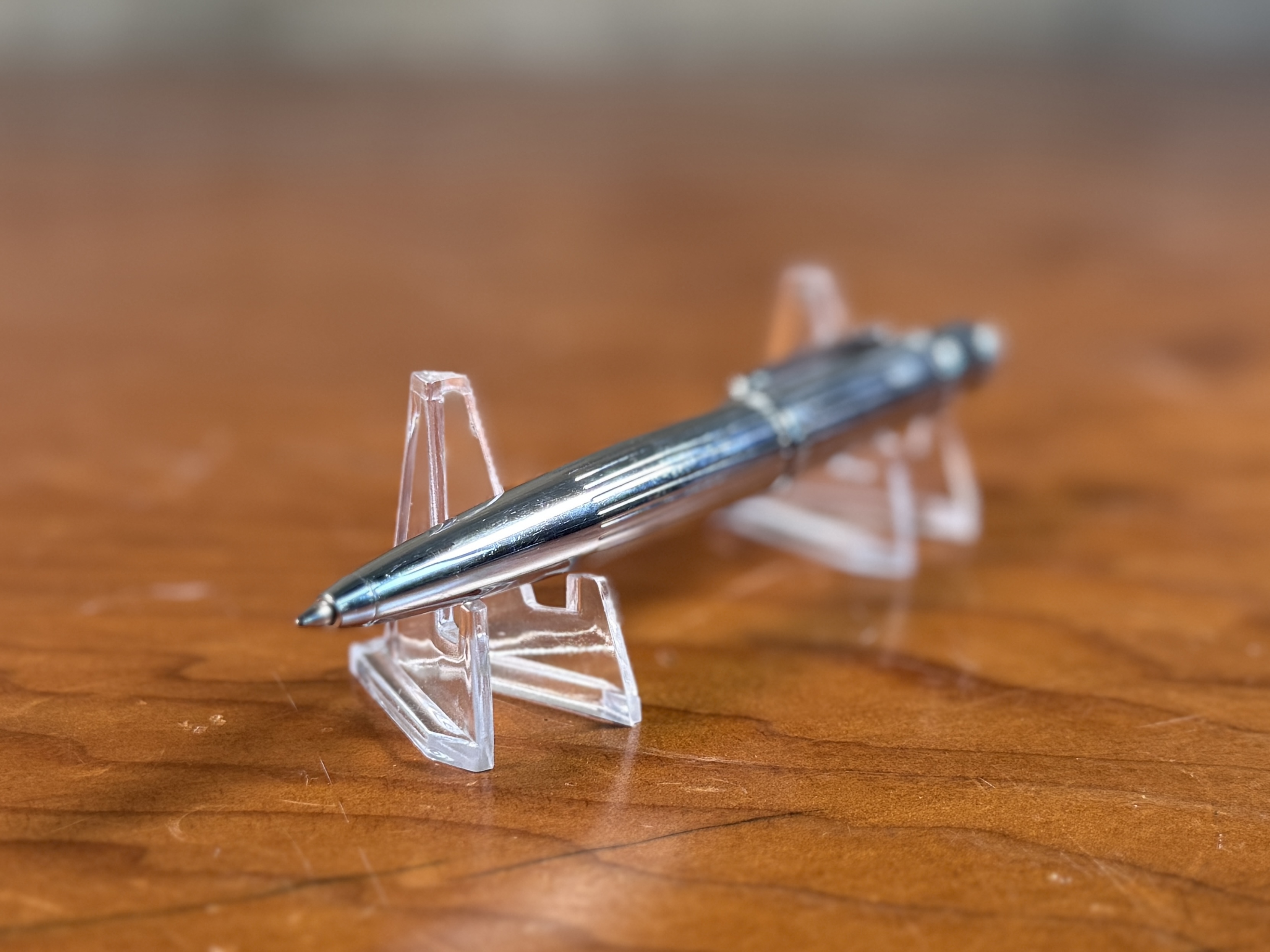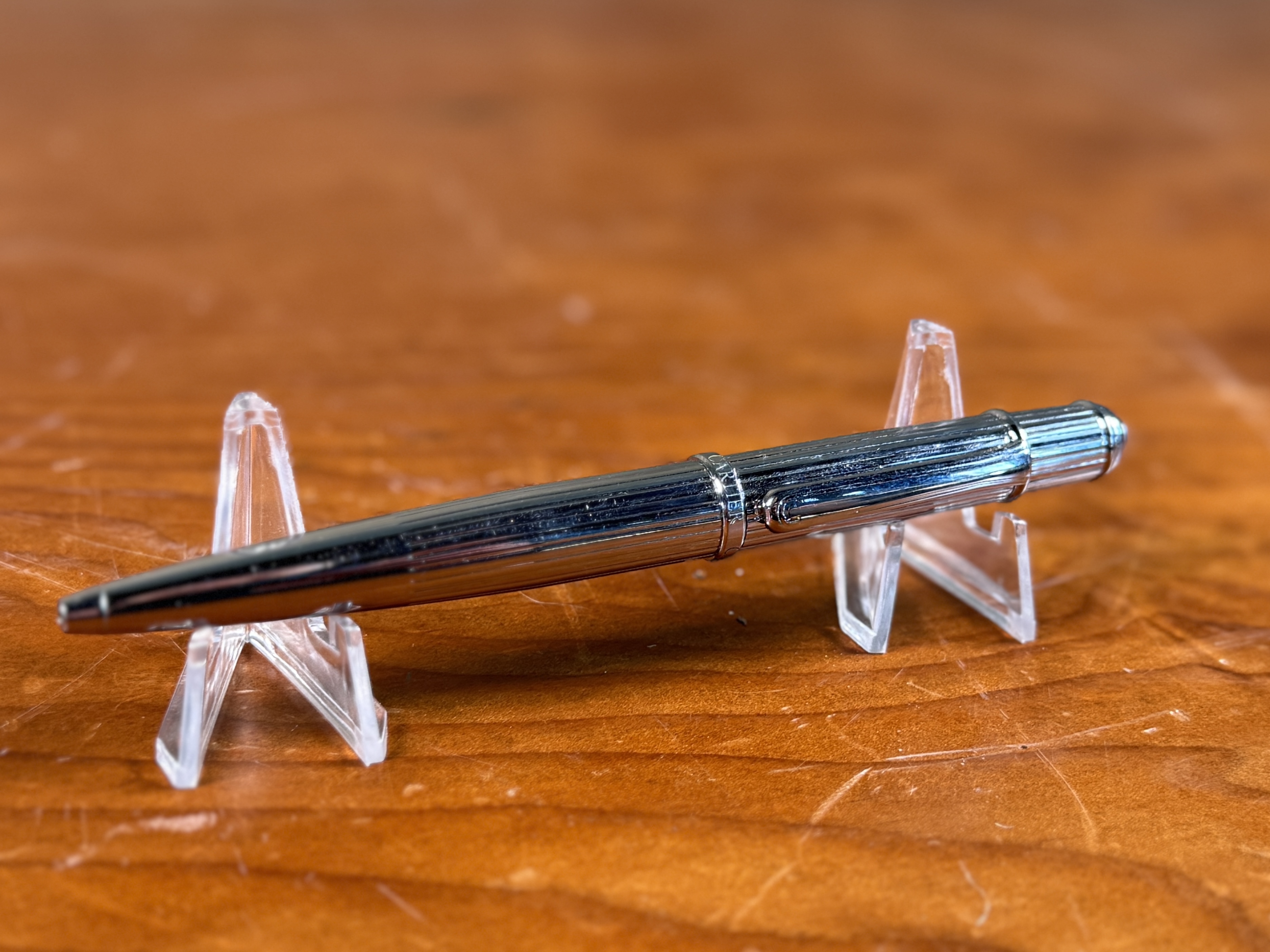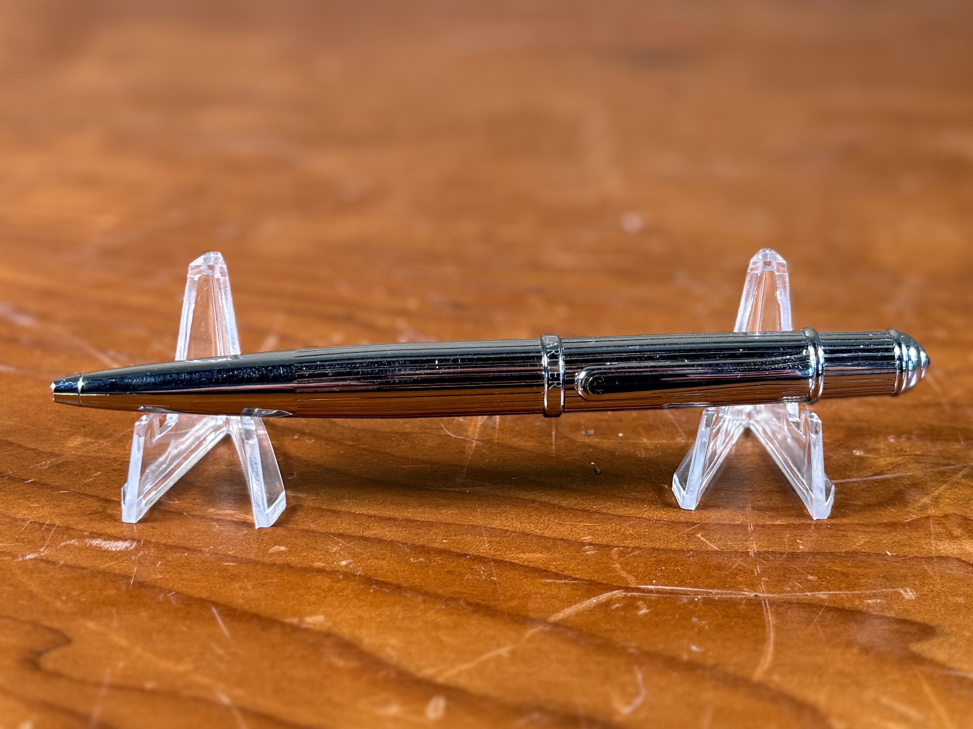 A Cartier Diabolo Platinum Plated Ballpoint Pen. This modern-style writing instrument is crafted from a silver-toned metal, featuring a distinctive fluted or reeded body design. A polished blue cabochon is set into the finial of the cap. The brand name ‘CARTIER’ is clearly engraved on a band encircling the cap near the clip.