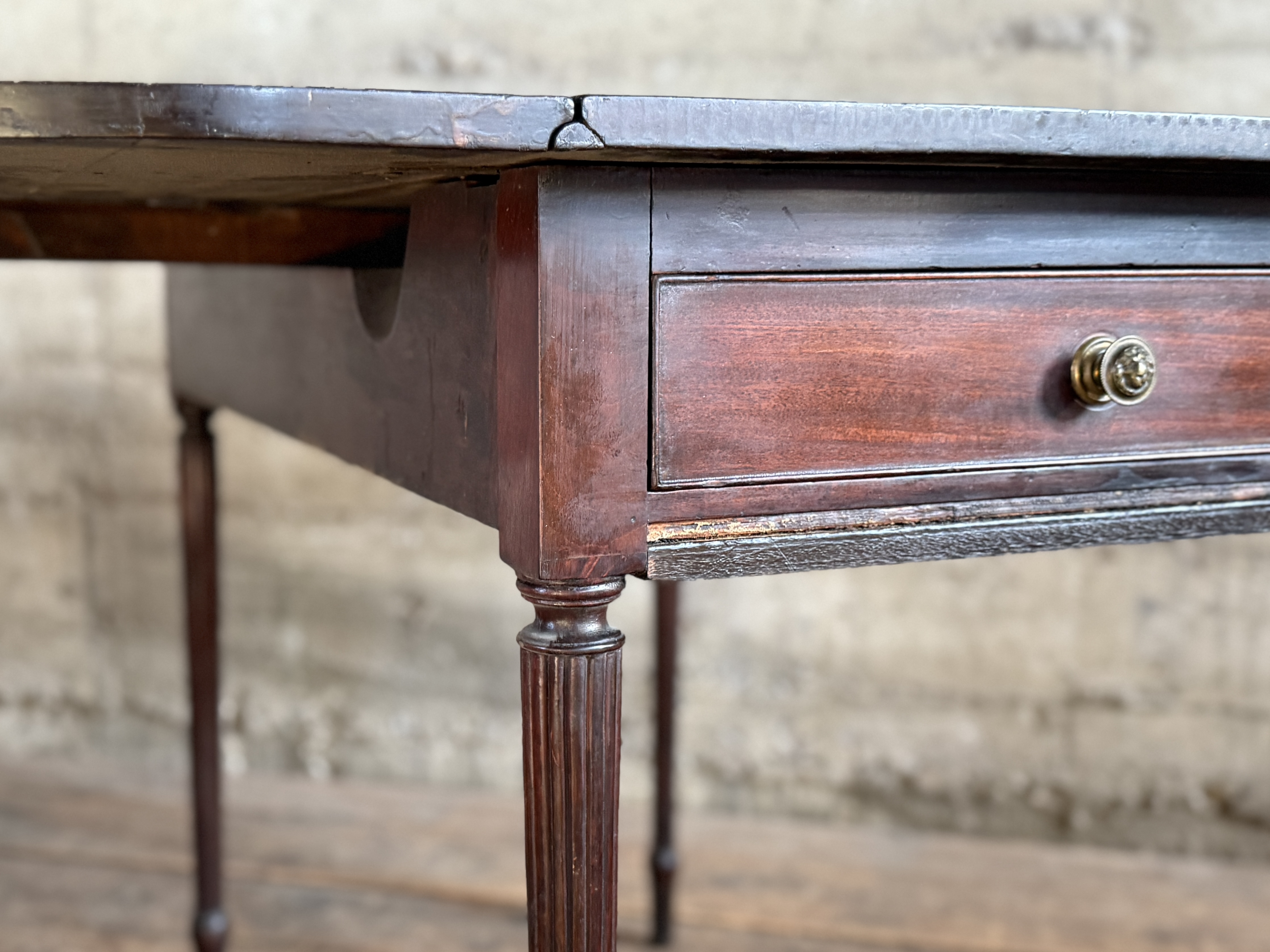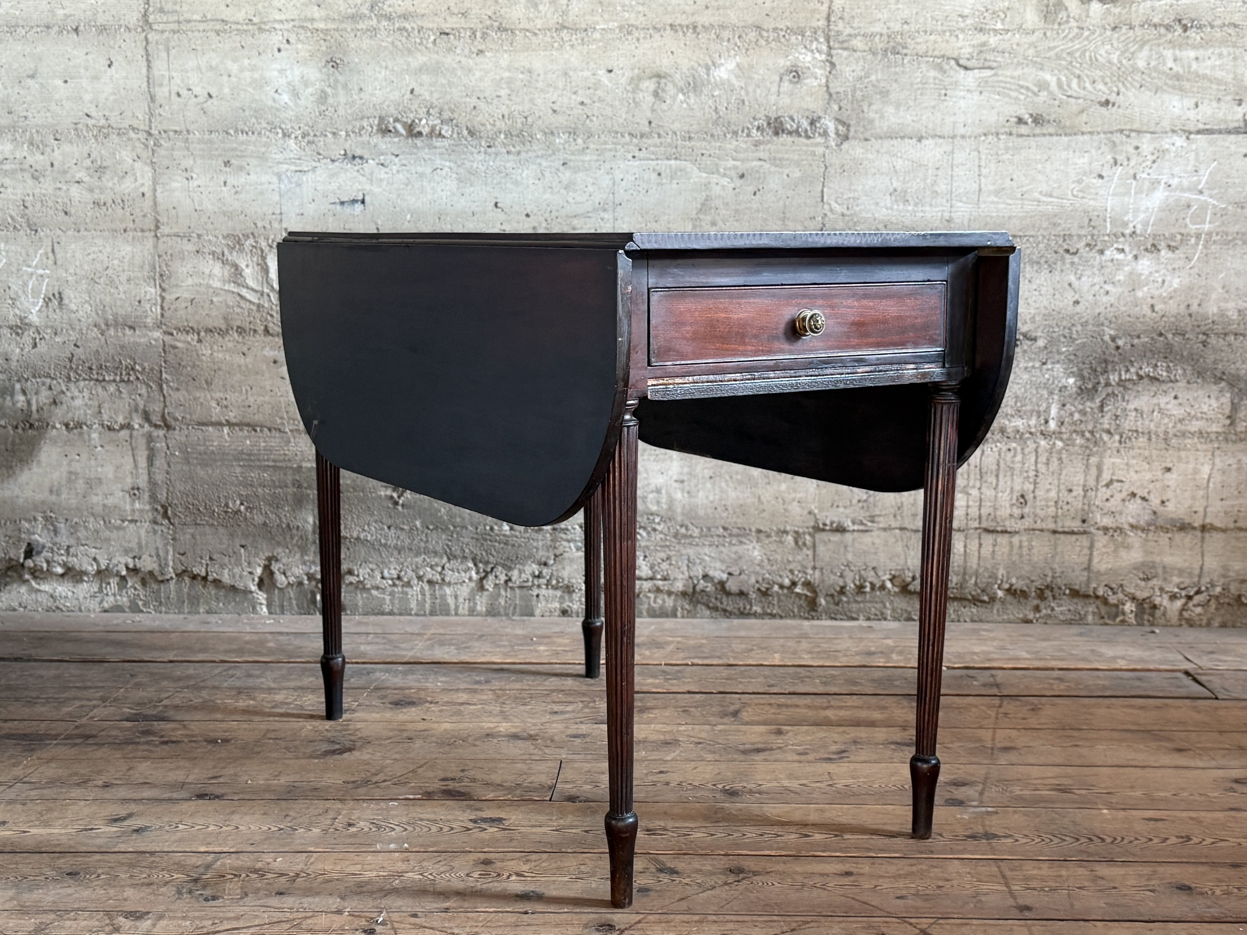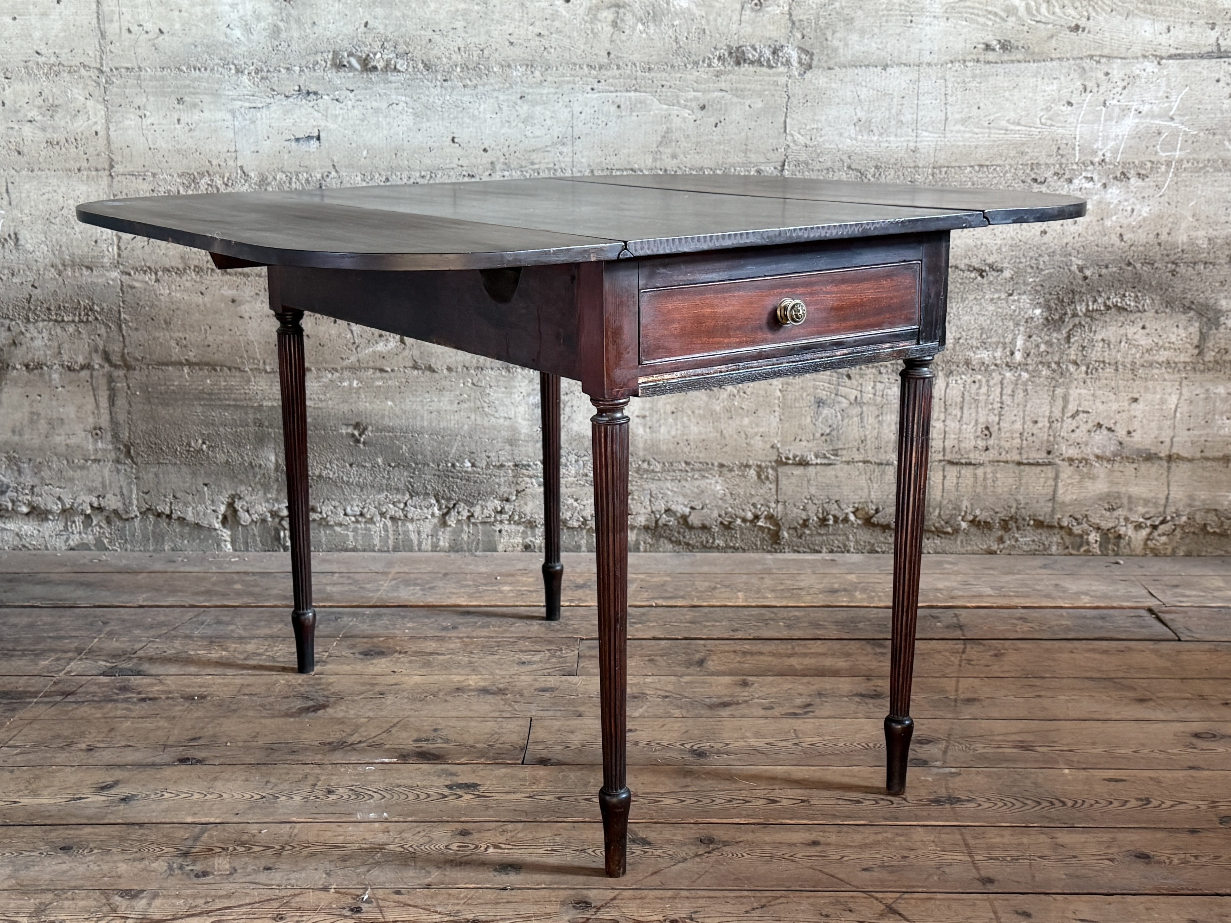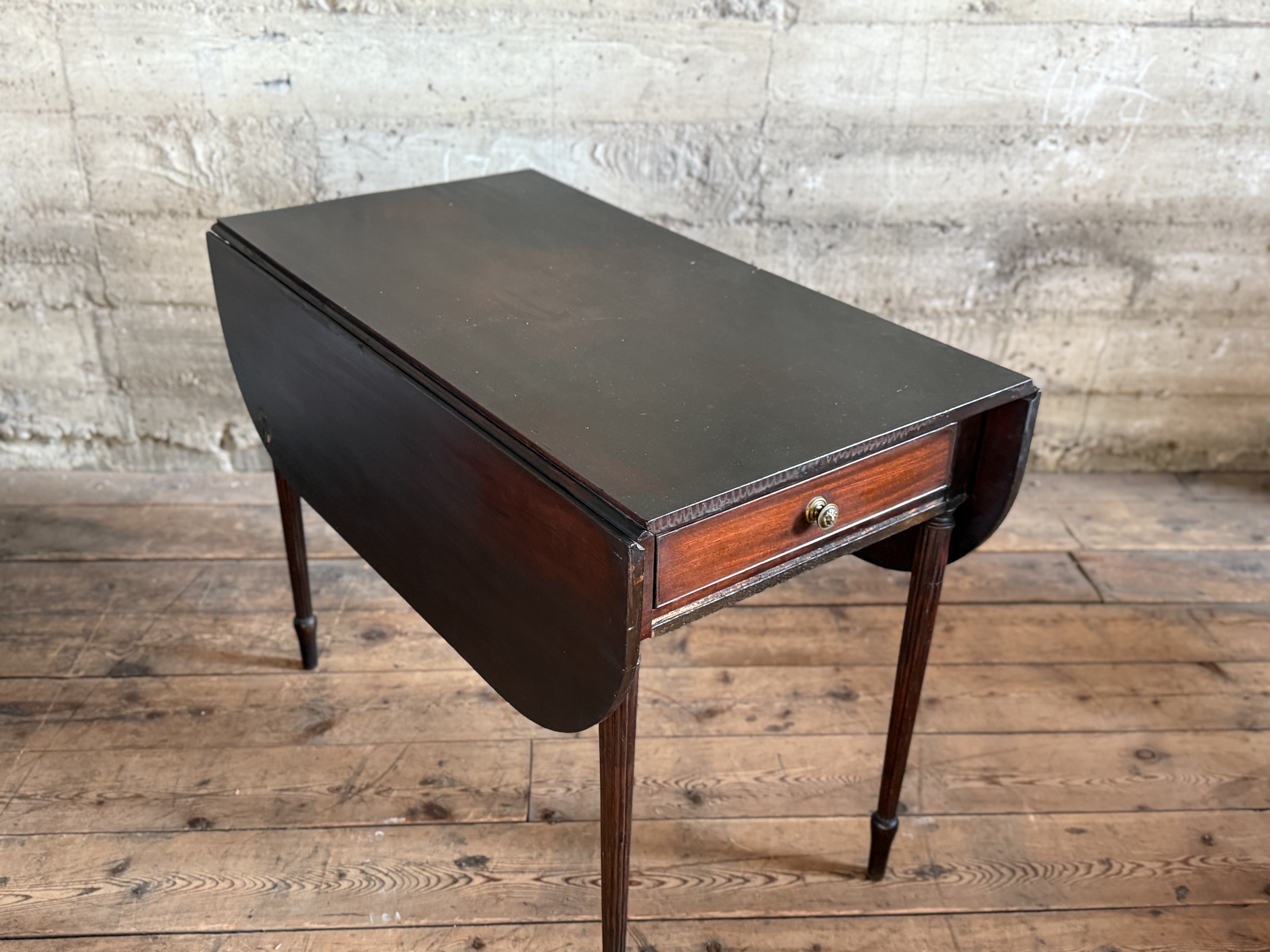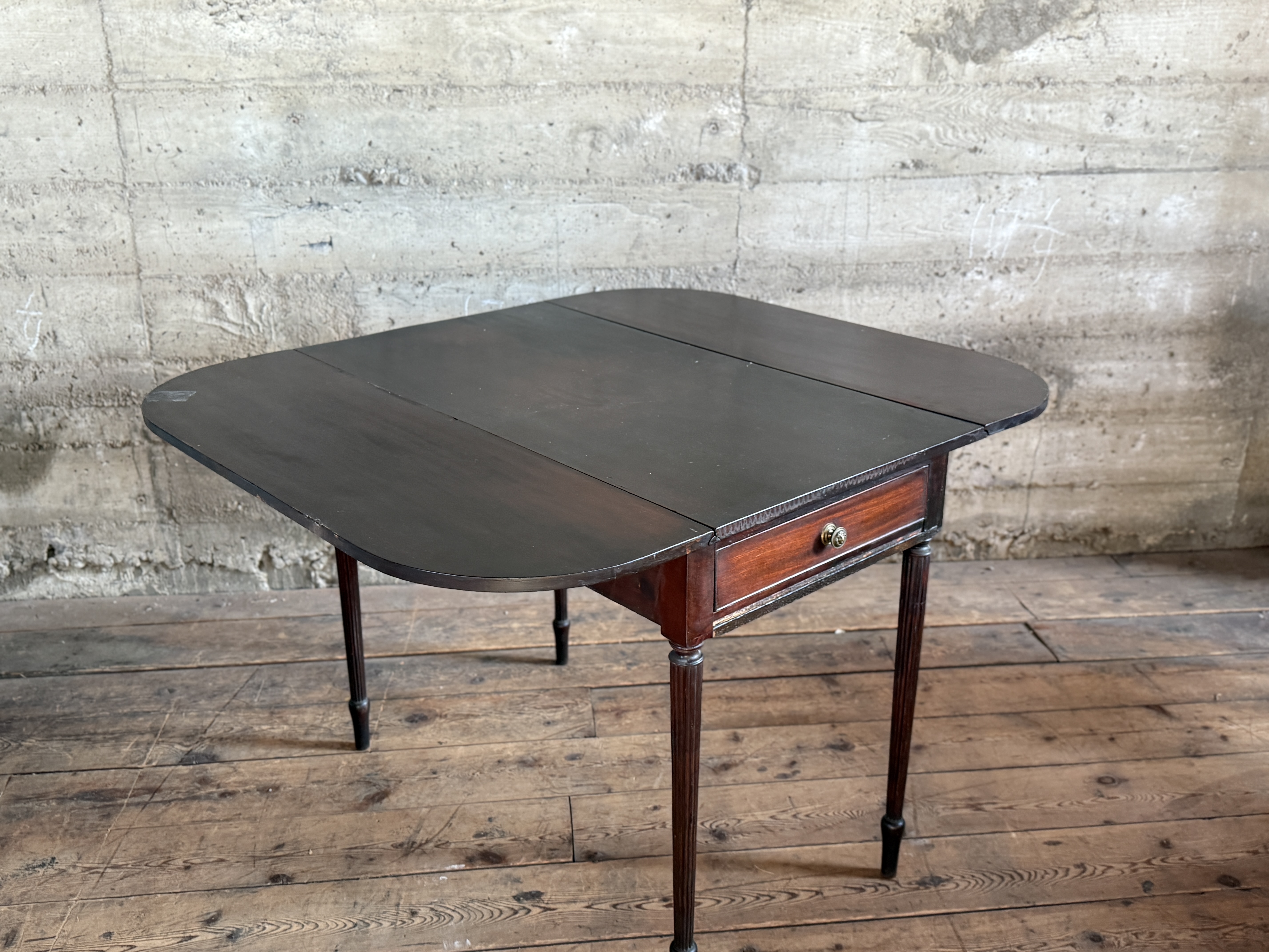 A Hepplewhite mahogany Pembroke table, dating to the late 18th century. This drop-leaf table features a central rectangular section with two hinged D-shaped leaves, supported by four tapered and fluted legs terminating in small turned feet. The piece is constructed from a dark reddish-brown hardwood, likely mahogany, with the tabletop exhibiting a darker, possibly ebonized, finish in areas. A single drawer is centrally located on one long side, fitted with a circular, decorative metal knob, likely brass.