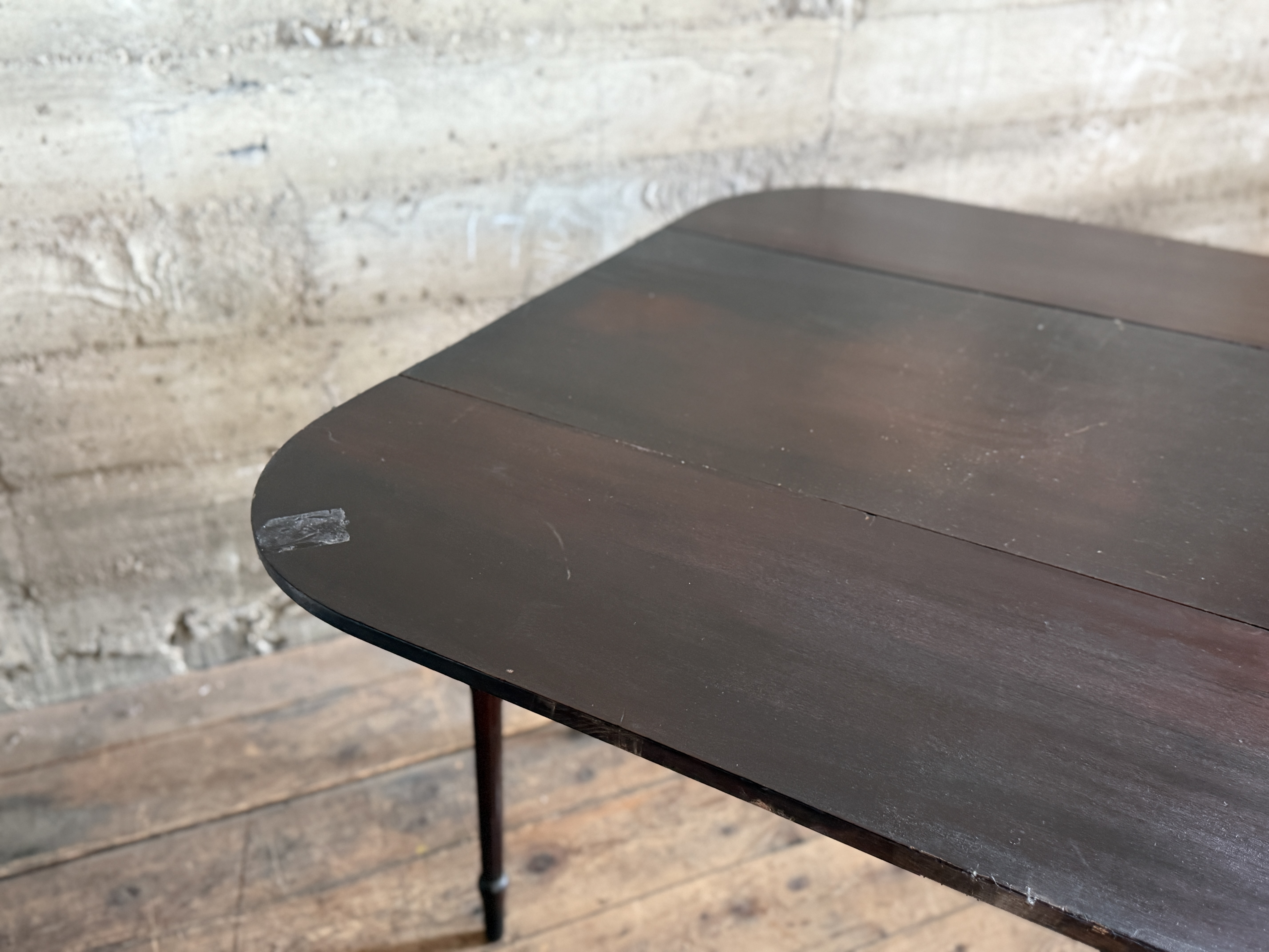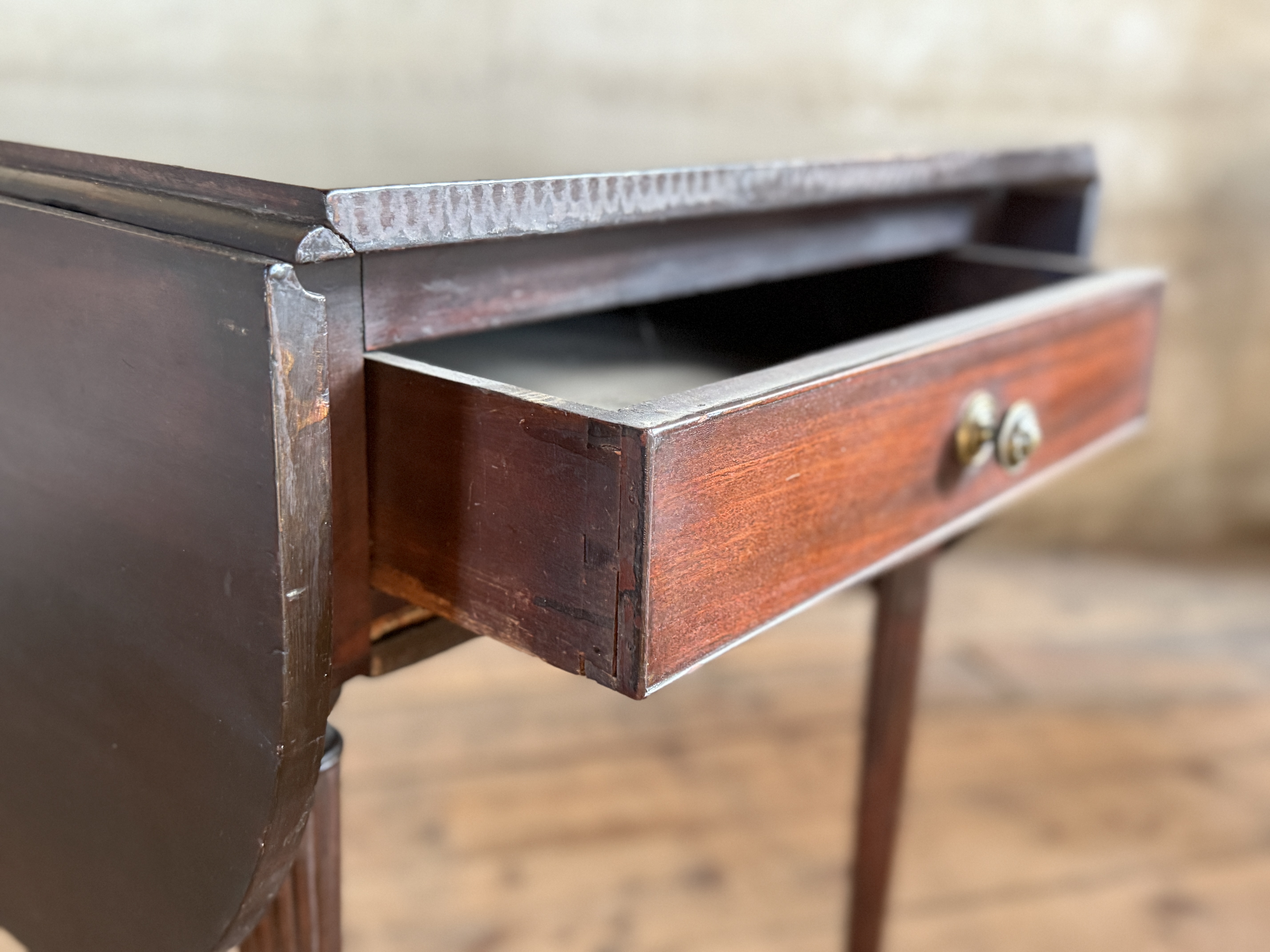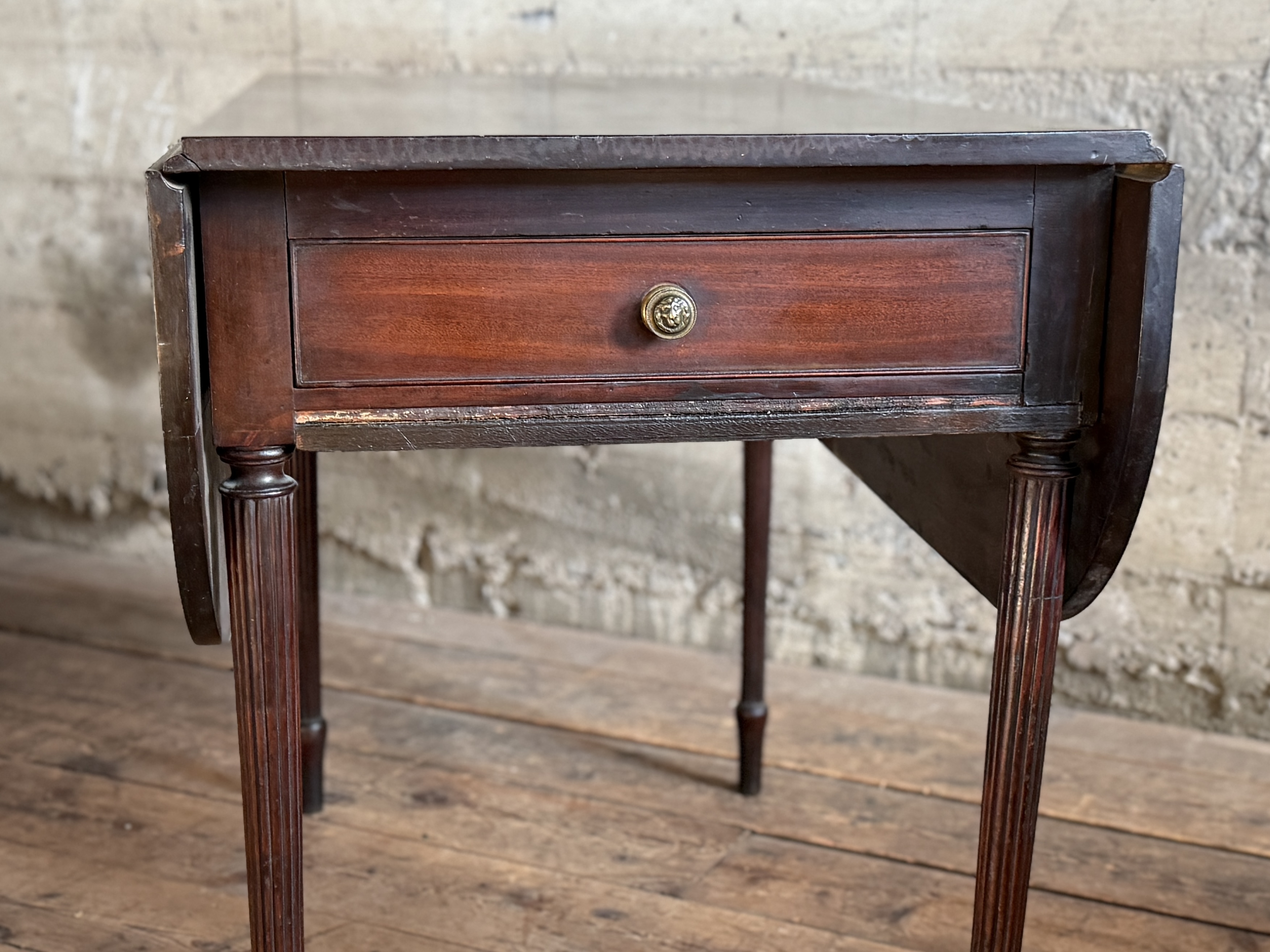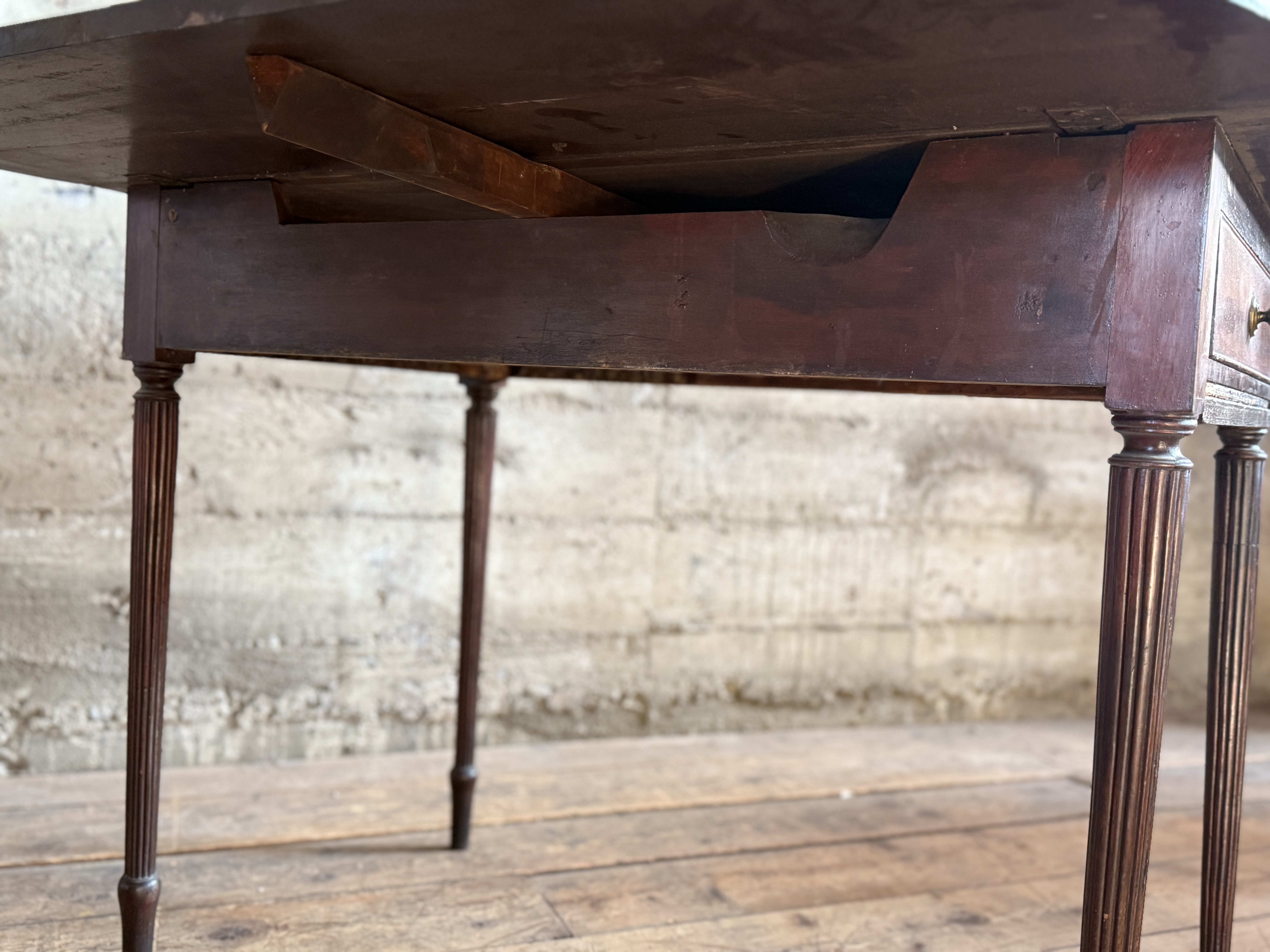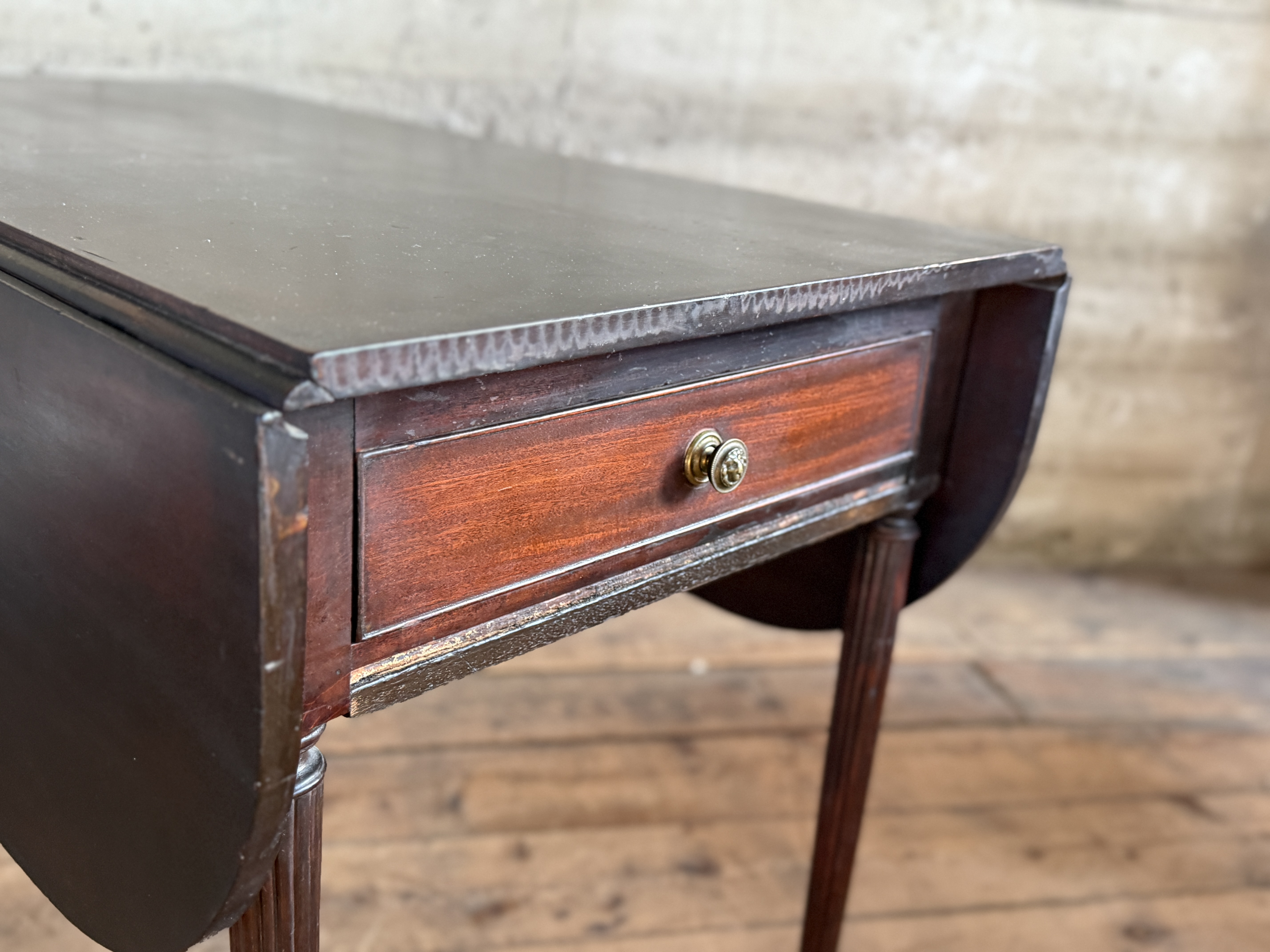 A Hepplewhite mahogany Pembroke table, dating to the late 18th century. This drop-leaf table features a central rectangular section with two hinged D-shaped leaves, supported by four tapered and fluted legs terminating in small turned feet. The piece is constructed from a dark reddish-brown hardwood, likely mahogany, with the tabletop exhibiting a darker, possibly ebonized, finish in areas. A single drawer is centrally located on one long side, fitted with a circular, decorative metal knob, likely brass.
