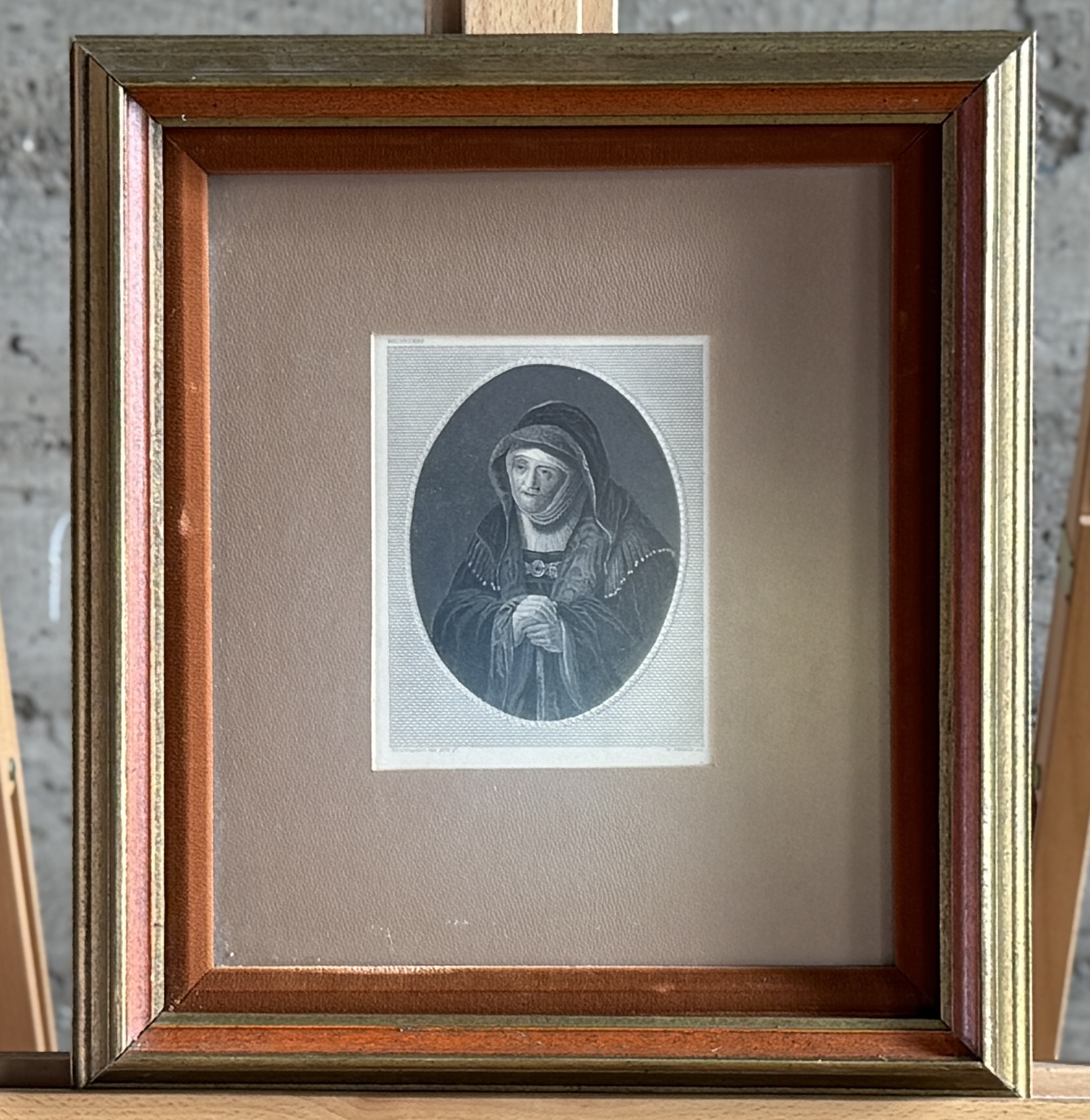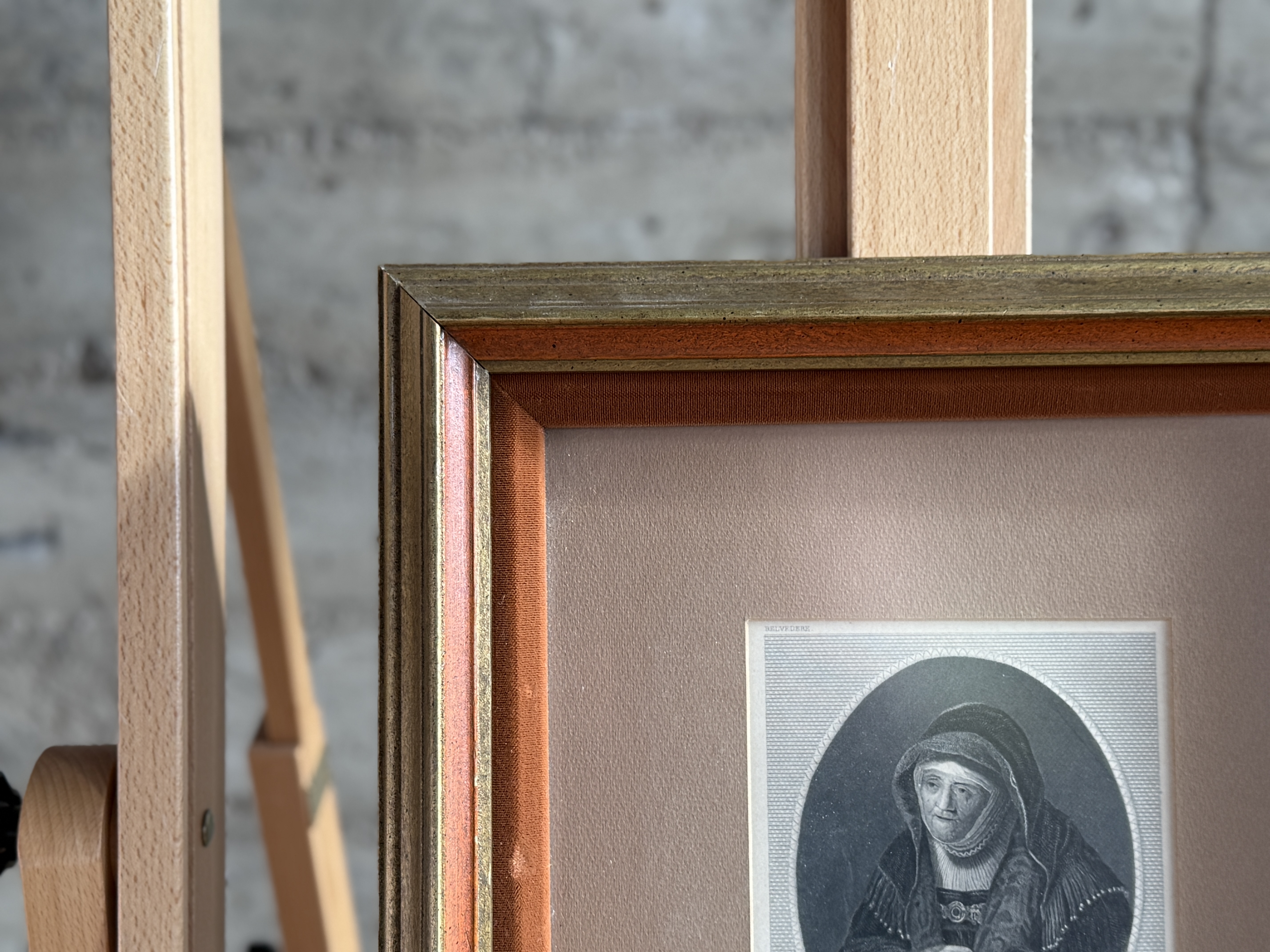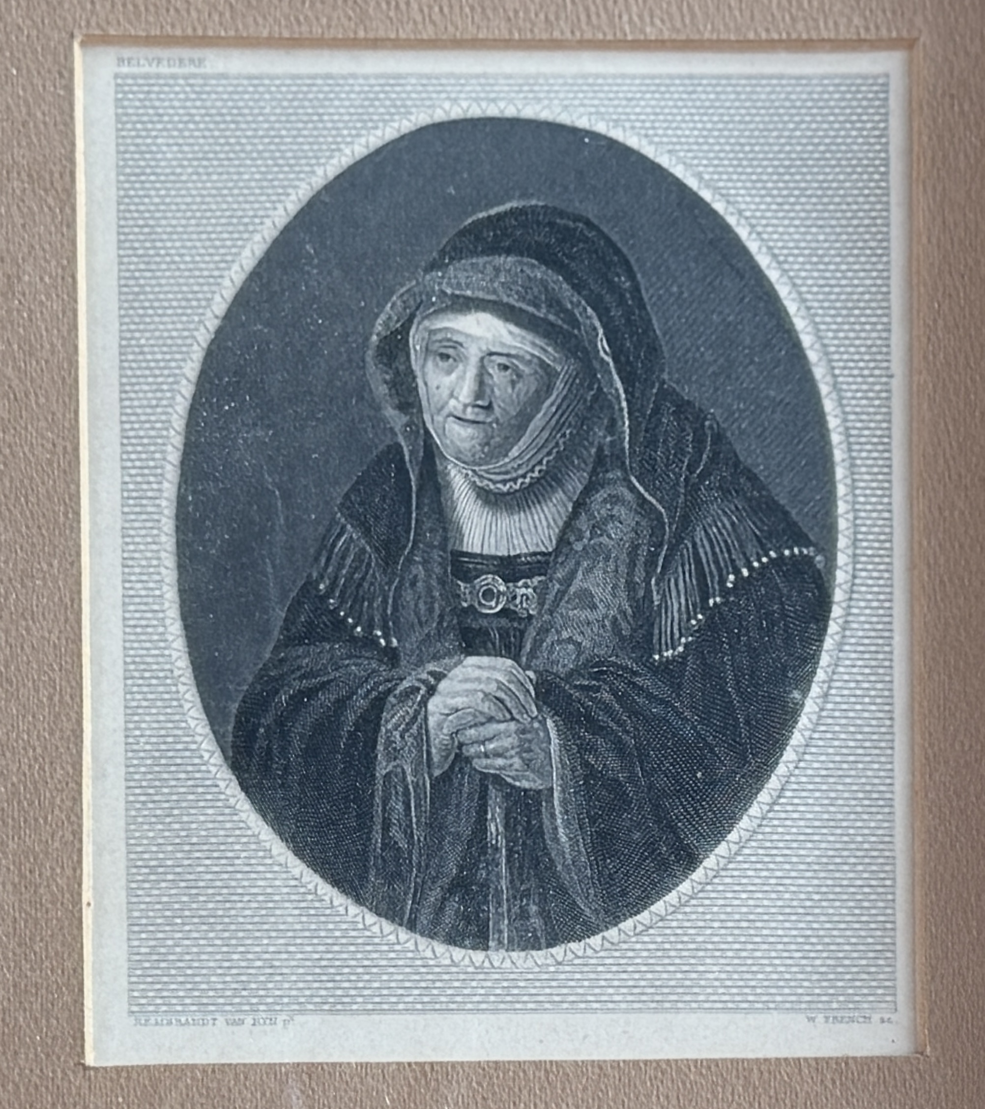 An antique engraving titled ‘Rembrandt’s Mother’, after Rembrandt van Ryn, engraved by W. French, dating to circa 1840. The print depicts an elderly woman in an oval vignette, rendered in a historical portrait style. It features visible text in the margins: “BELVEDERE” at the top, “REMBRANDT VAN RYN P.” at the lower left, and “W. FRENCH SC.” at the lower right. It is presented within a beige mat, behind glass, and housed in a multi-toned wooden frame with gold and reddish-brown finish.