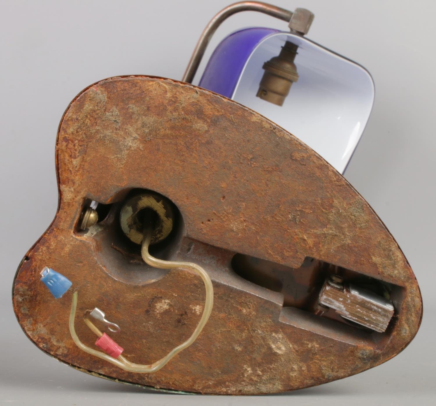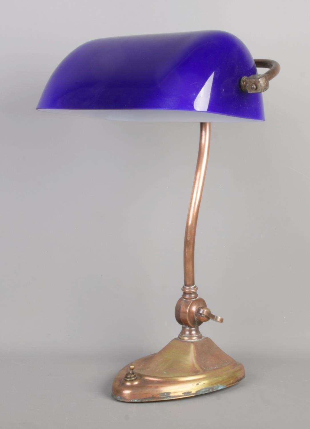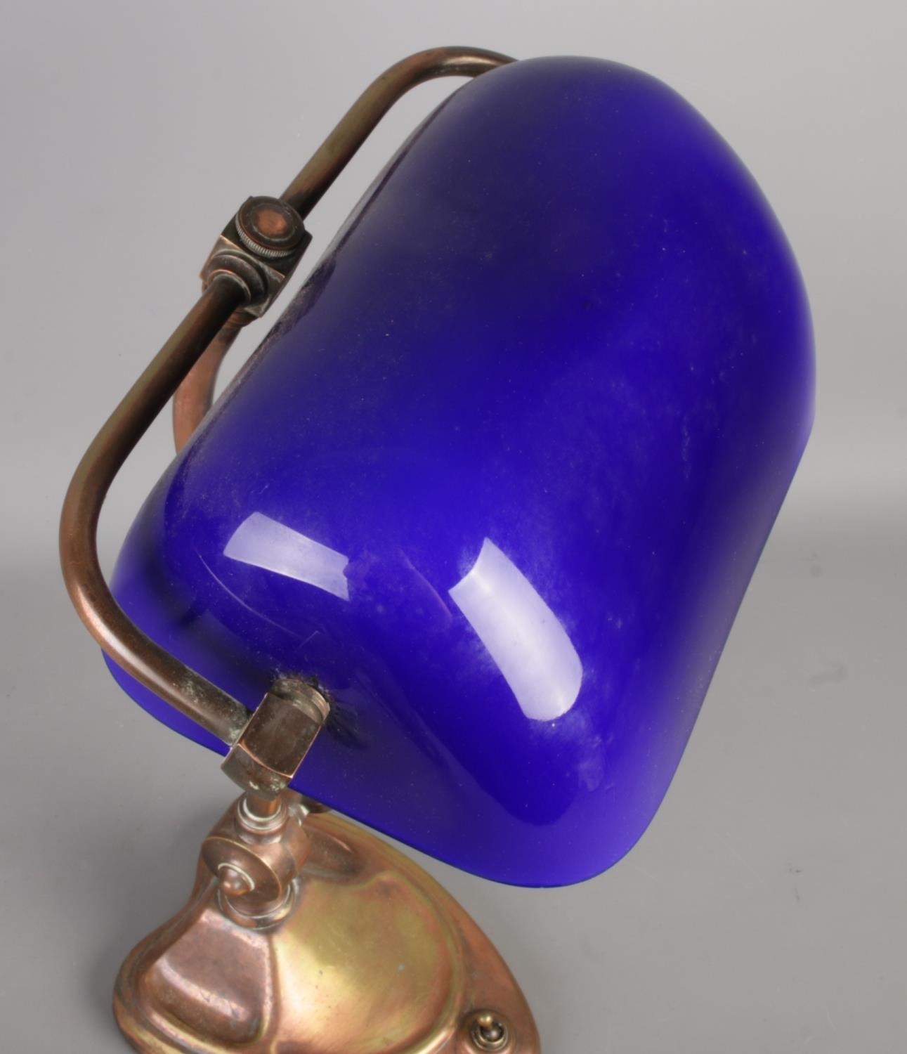A vintage banker’s desk lamp with a blue glass shade and a brass base.