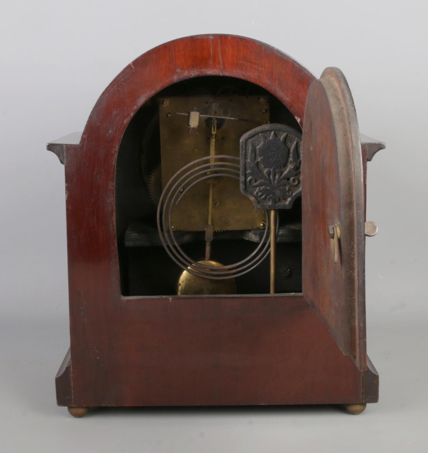 A dark-red wooden mantel clock with inlaid decoration and a brass movement.