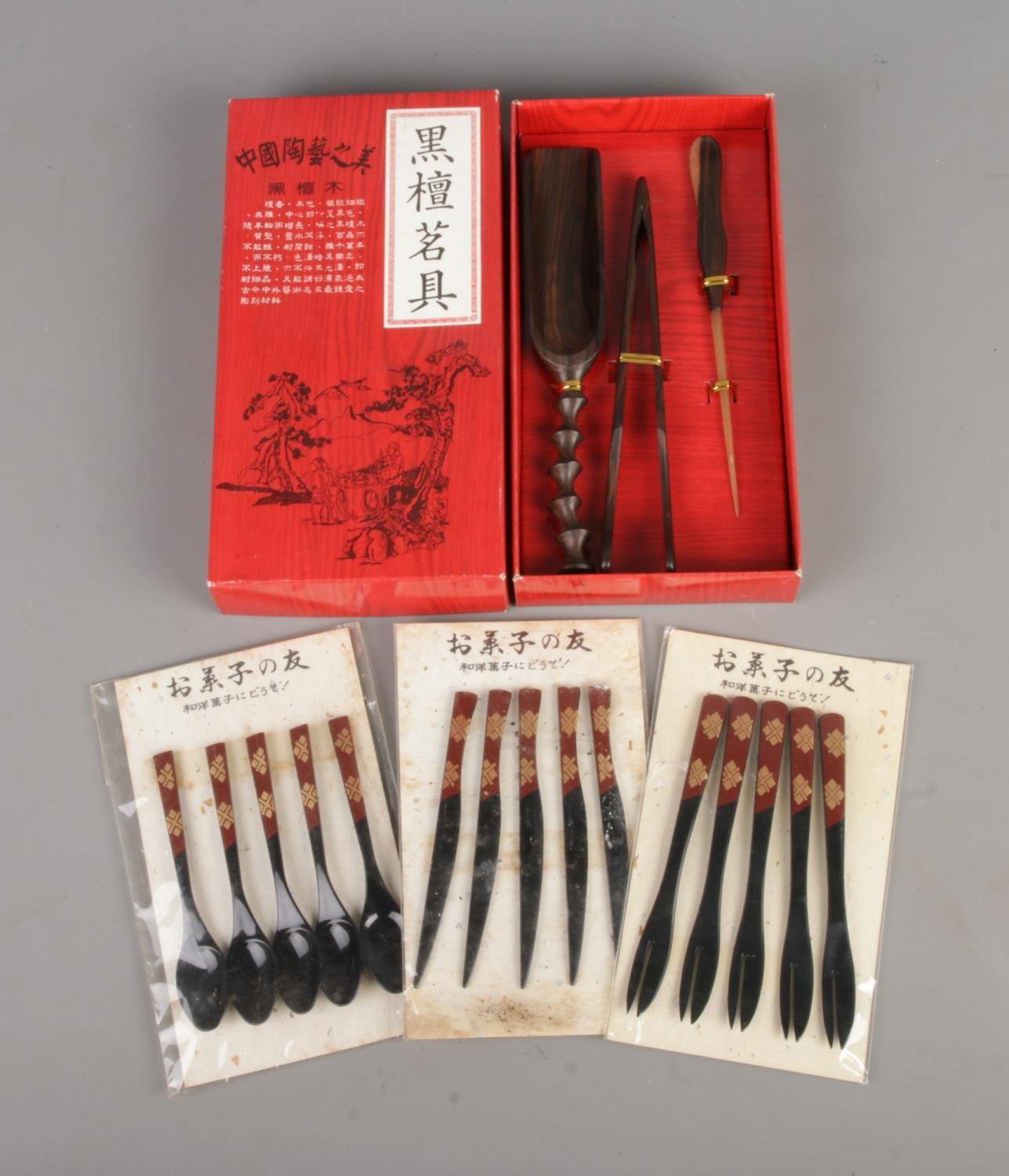 A set of Japanese lacquerware forks, spoons, and tea ceremony tools including a scoop, tongs, and pick.