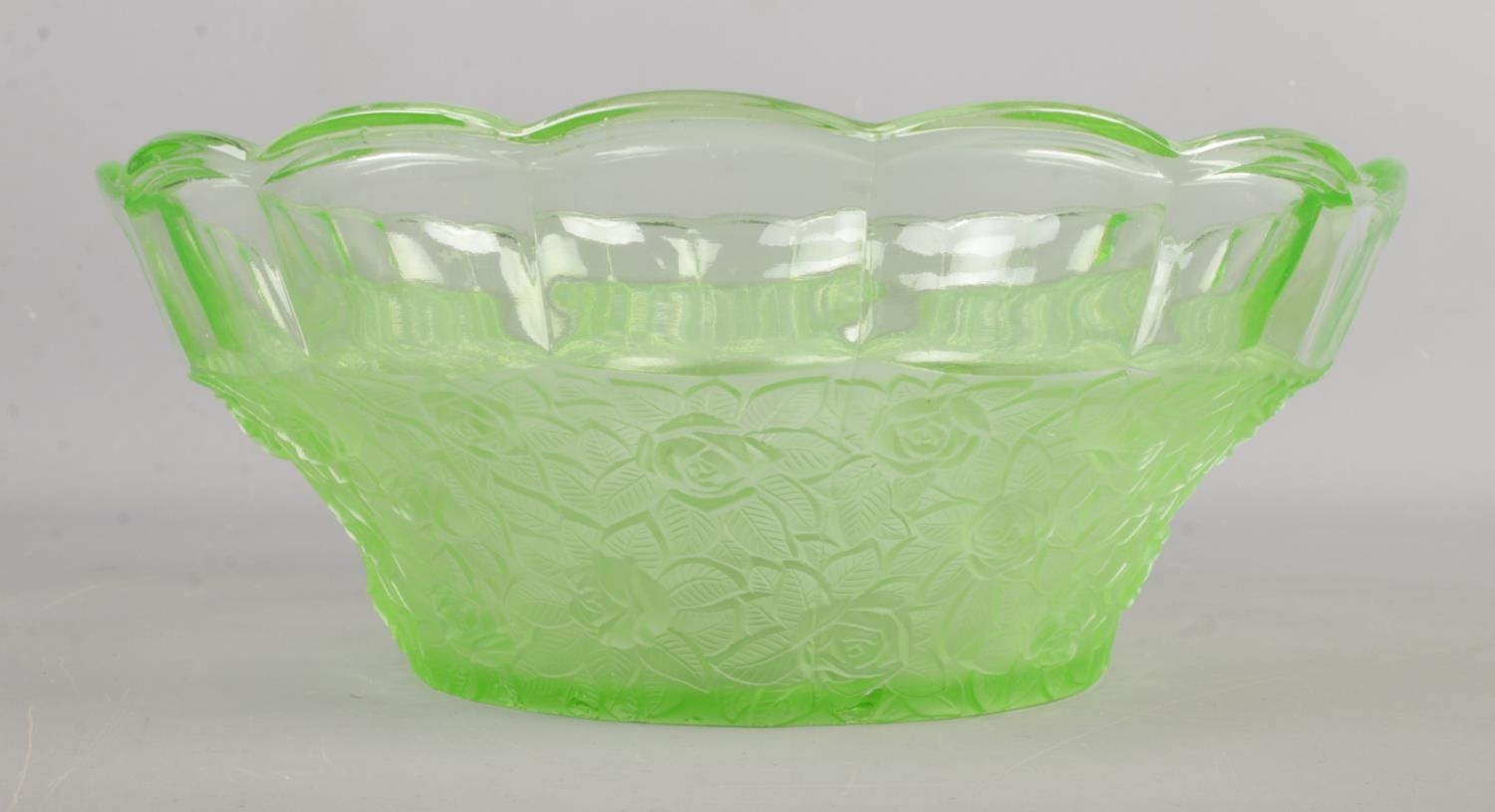 Light green glass bowl with etched floral and leaf design and scalloped rim.