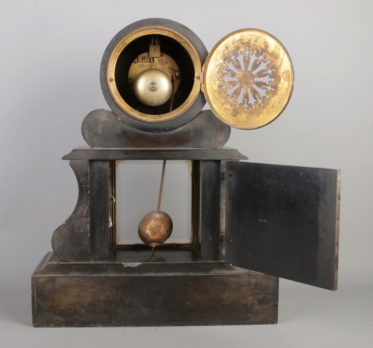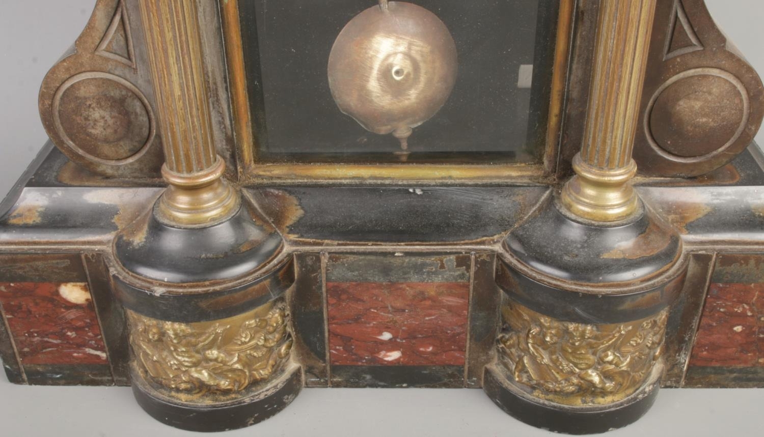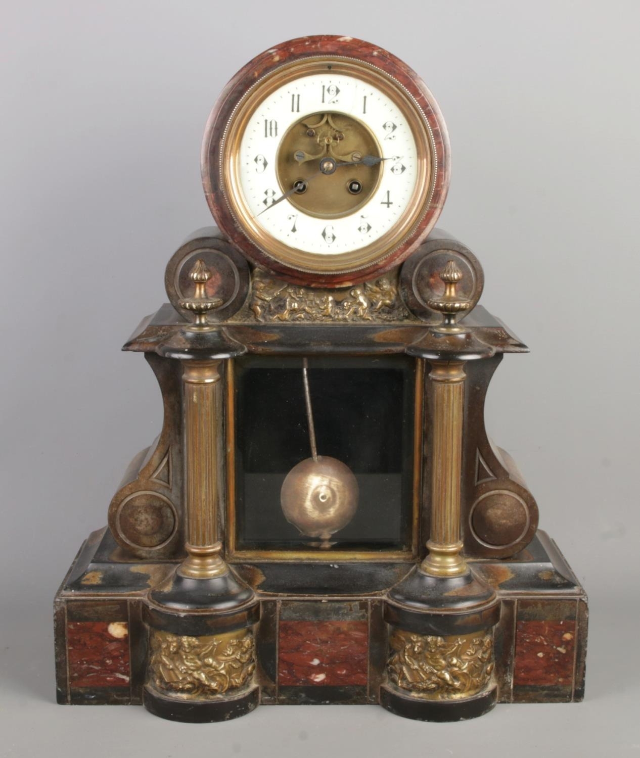 French marble and bronze mantel clock with pendulum and figural decoration.