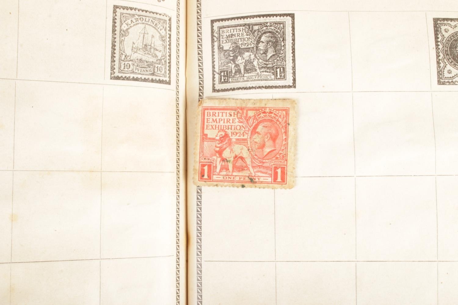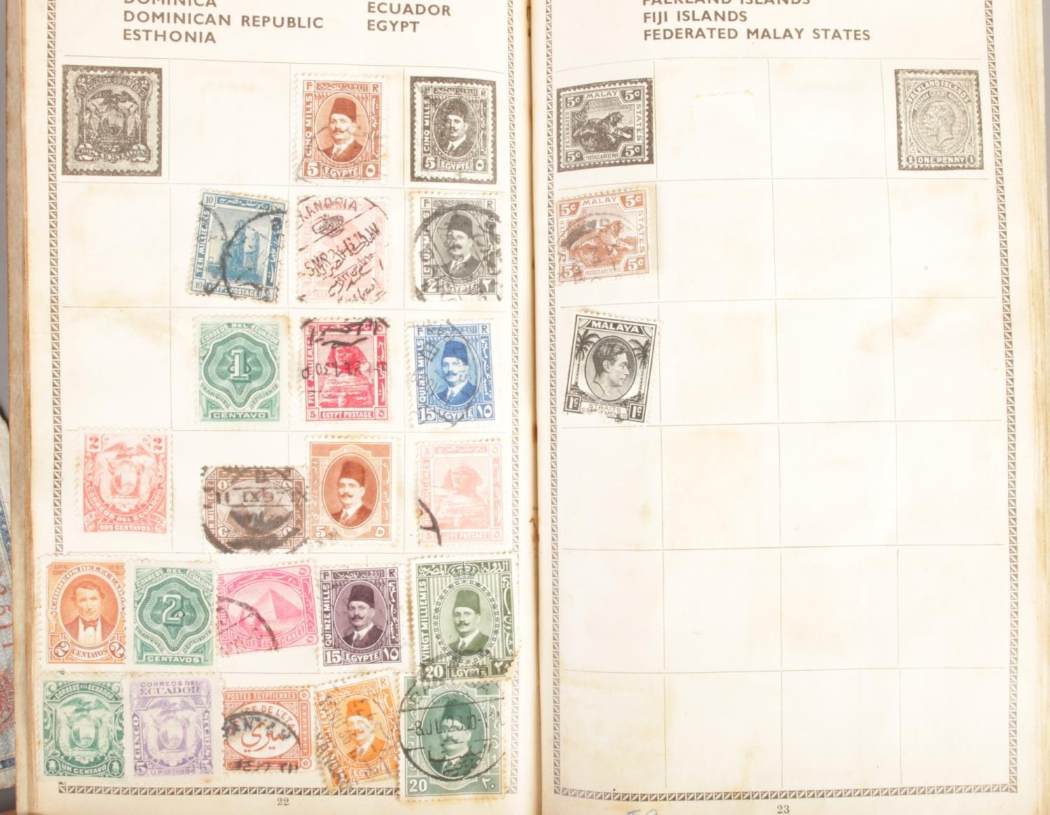 Stamp album containing various international stamps, covers, and a banknote.