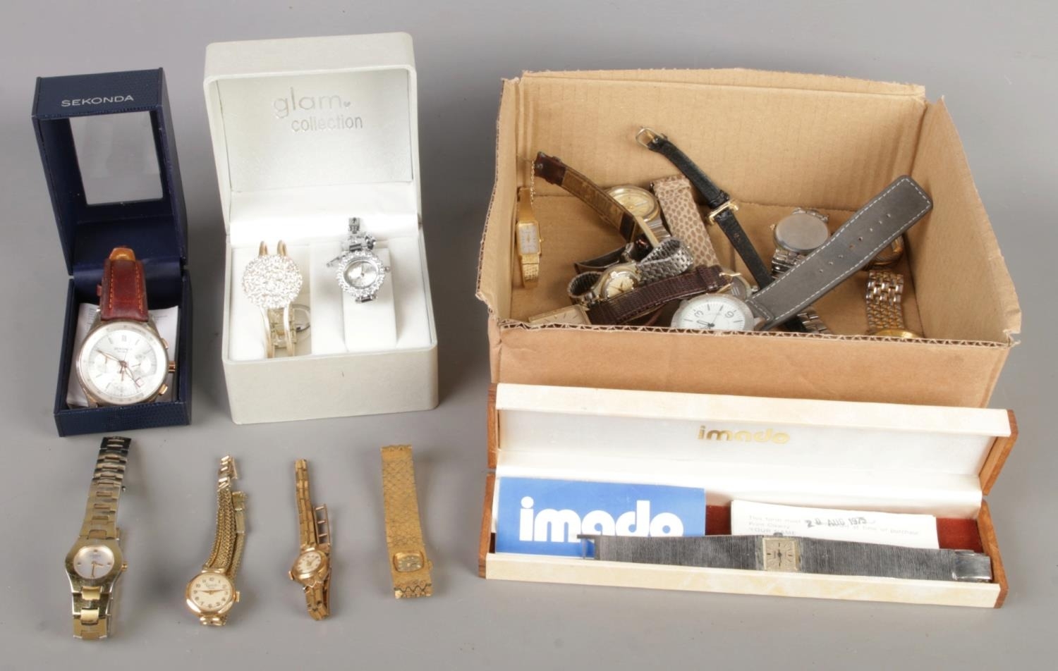 A collection of various wristwatches including Sekonda, Imado, Rolex, and others in assorted styles and metals.