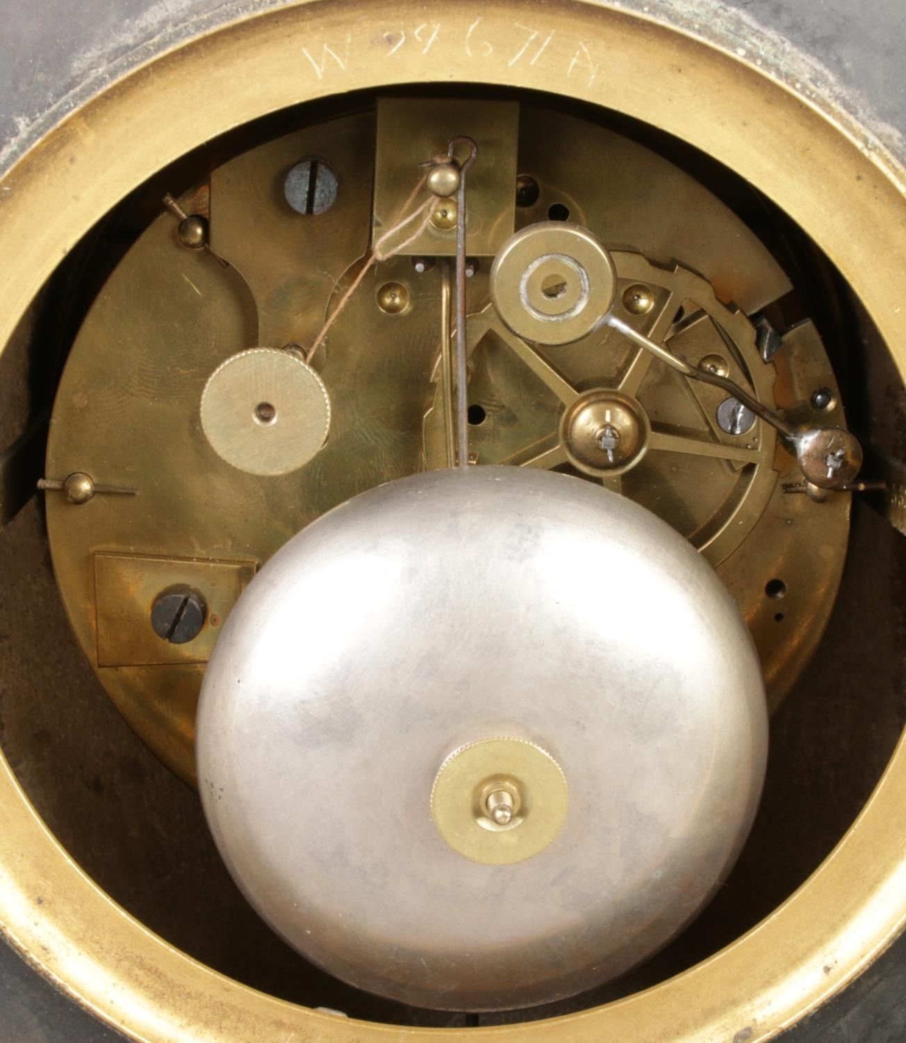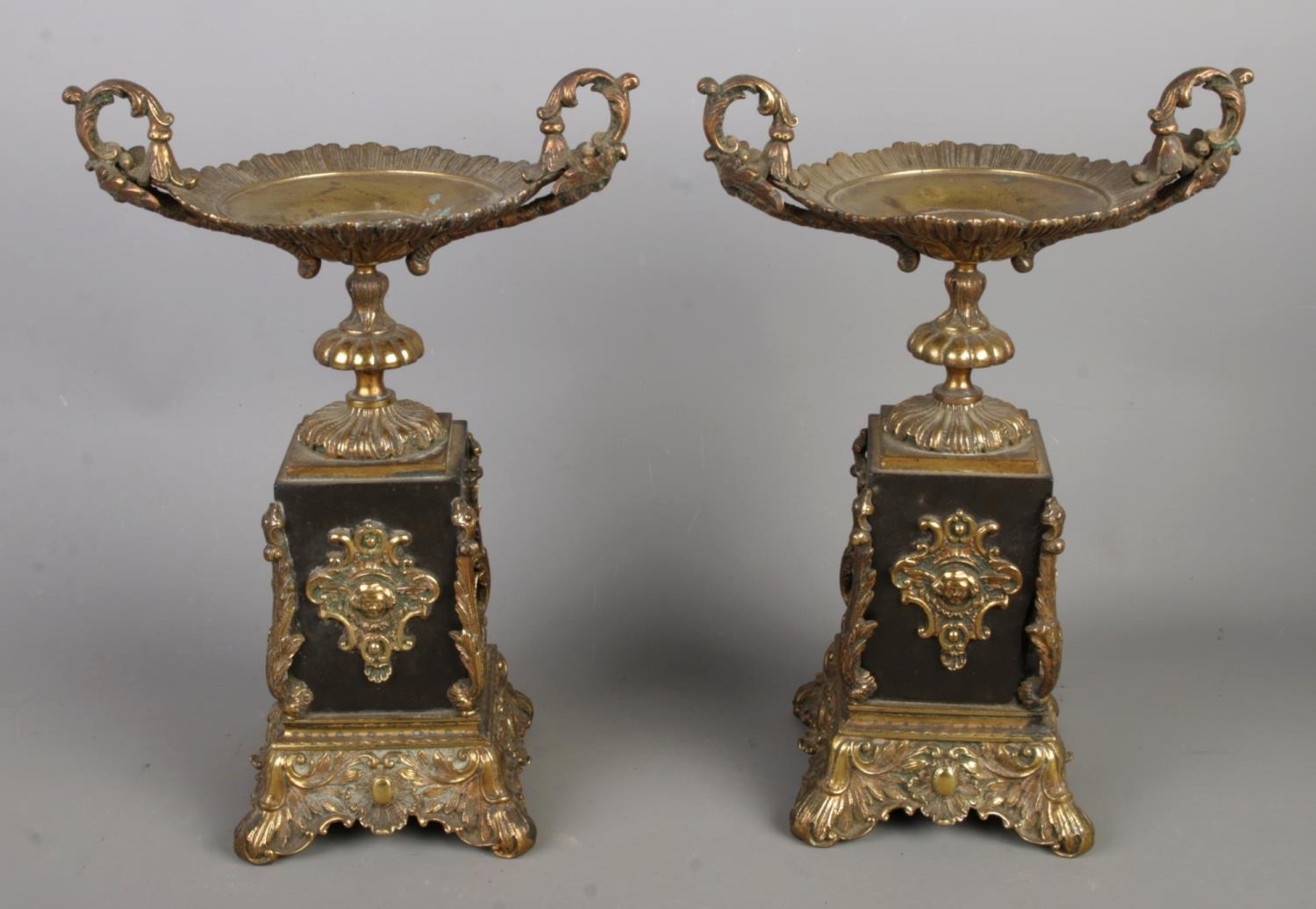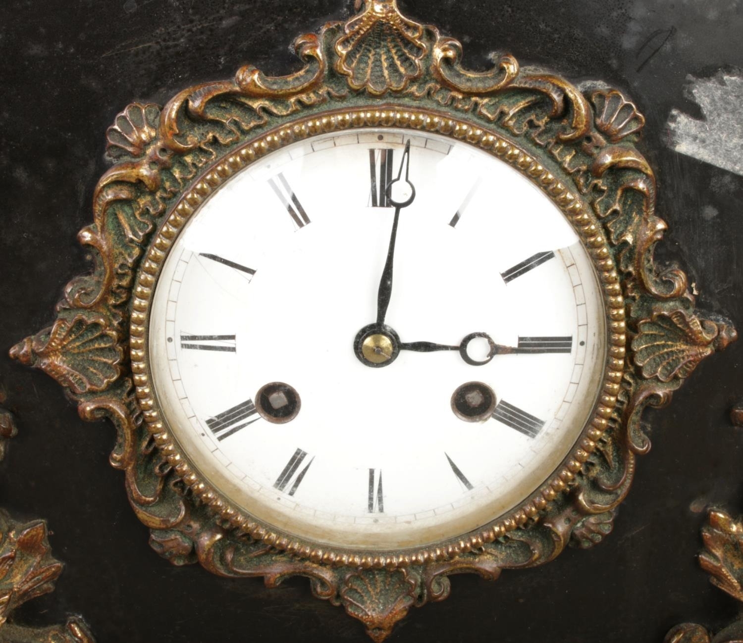 French style black and bronze mantel clock set with two matching garnitures.