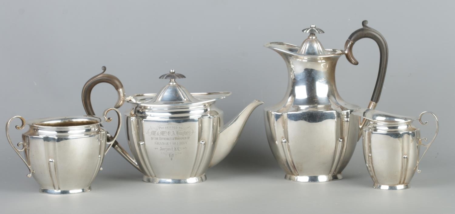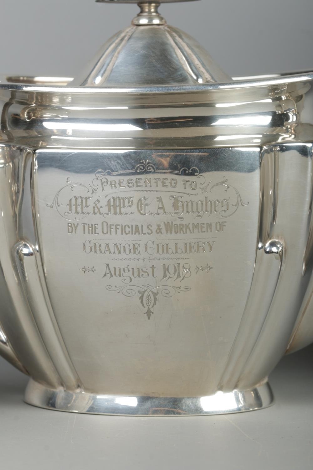 Four-piece silver tea and coffee service with tray, inscribed “Presented to Mr & Mrs G. A. Hughes by the Officials & Workmen of Grange Colliery August 1918”.