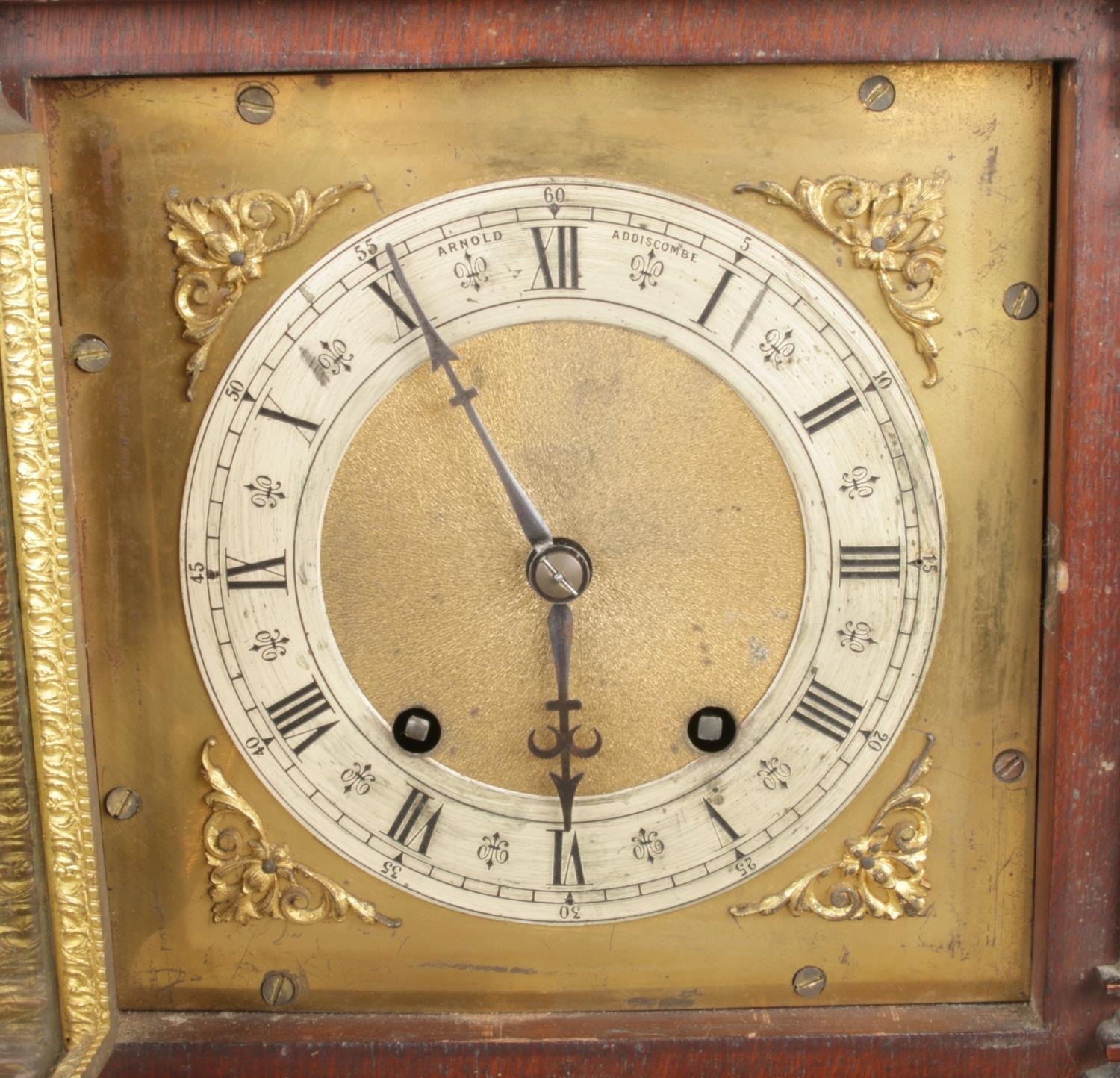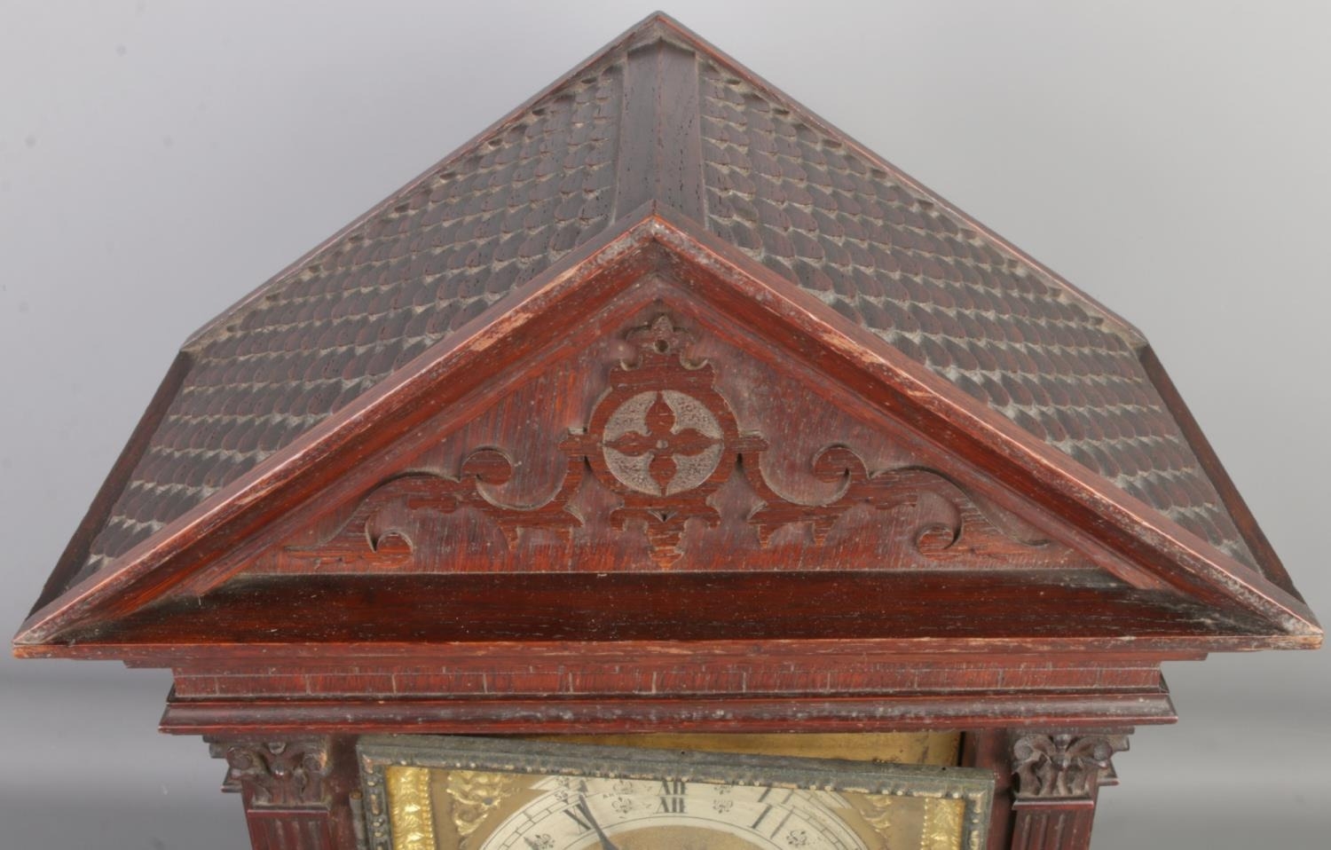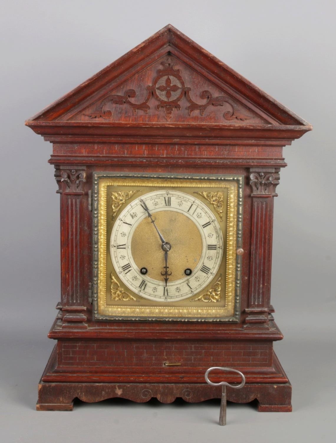 A German oak striking mantel clock with a brass dial, carved details, and a key.
