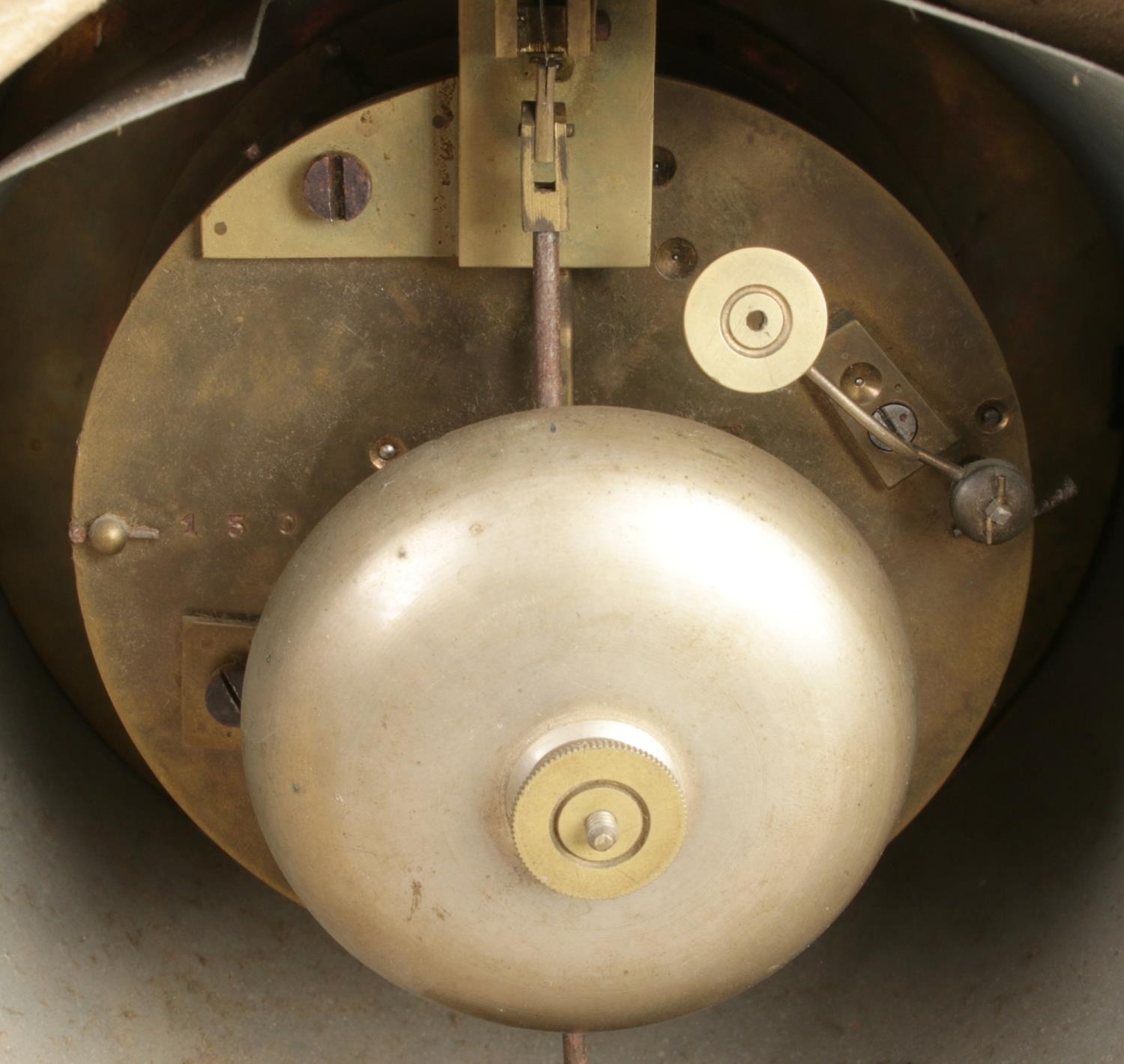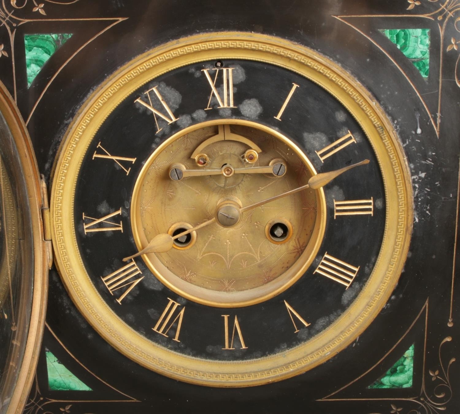 This 19th-century mantel clock showcases a neoclassical design, crafted from black marble and embellished with brass and malachite inlay. The clock face features Roman numerals and brass hands. A bell striking mechanism is visible through a rear access door. A brass winding key is included.