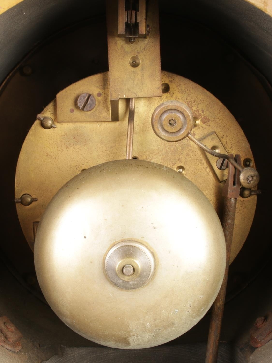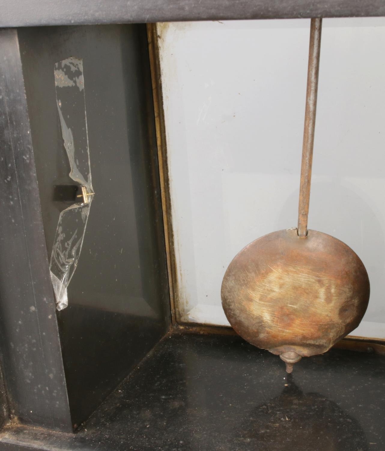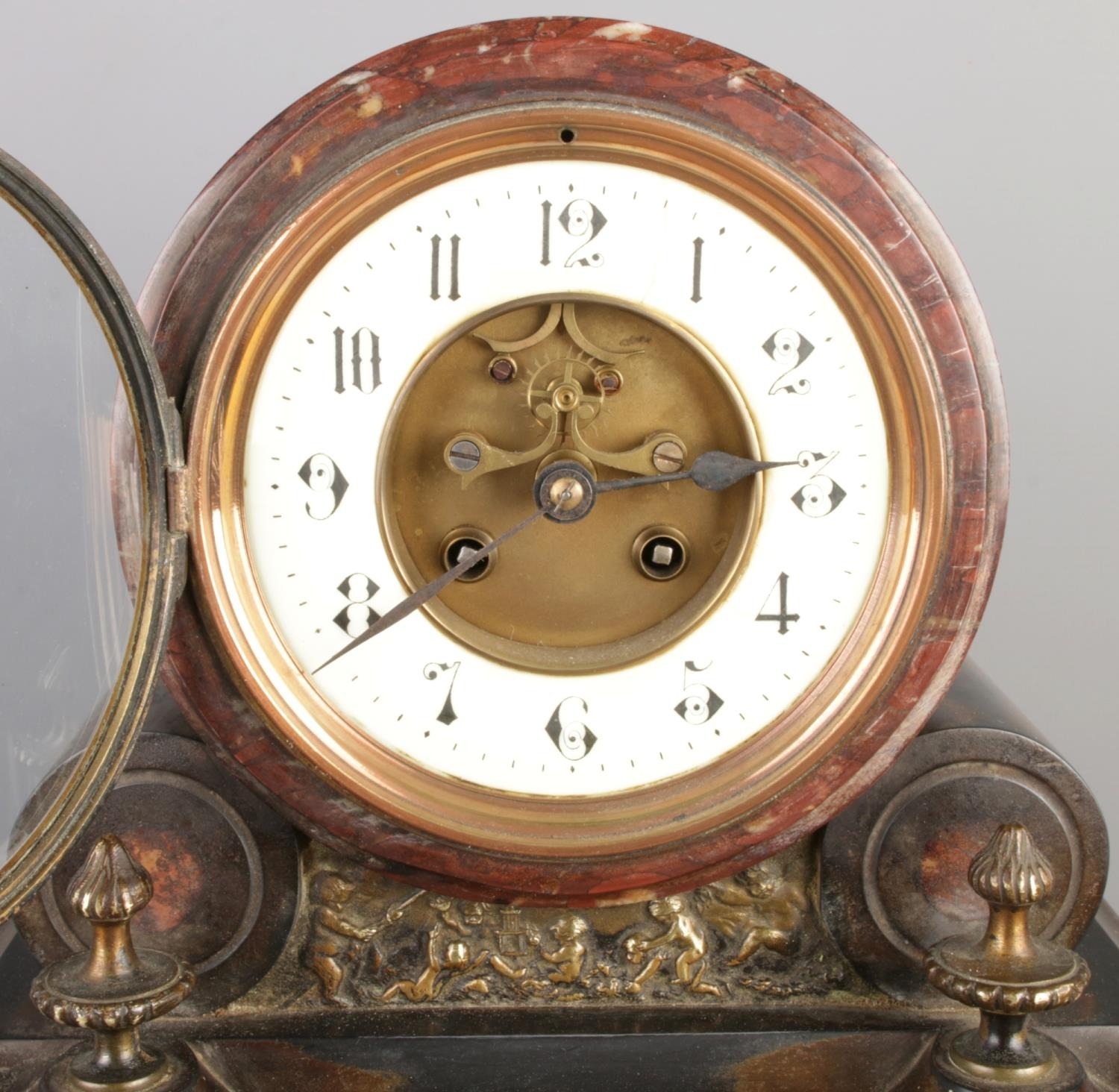 This mantel clock is crafted primarily from red and black marble, accented with brass elements. The clock features a round, white dial with black Roman numerals. The pendulum is visible within a glass-fronted case. Decorative brass details include pilasters, bas-relief figures depicting putti, and finials. The clock has a hinged back door, revealing the mechanism and bell.
