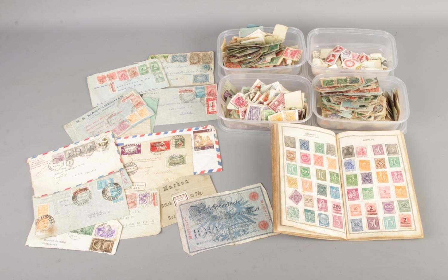 This lot comprises a collection of postage stamps and related ephemera. Included are loose stamps contained in four clear plastic containers, used envelopes with affixed stamps, a partially visible used German banknote, and a partially filled stamp album containing both affixed and loose stamps. The stamps originate from various countries and periods, with a predominance of mid-20th century and earlier examples. The album, envelopes, and stamps exhibit age and wear commensurate with their age. Visible text includes country names and denominations on the stamps, as well as handwritten text on the envelopes.