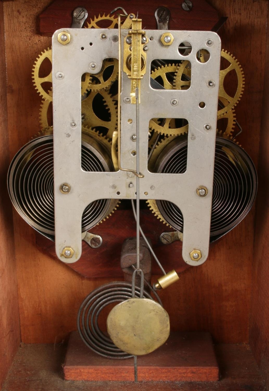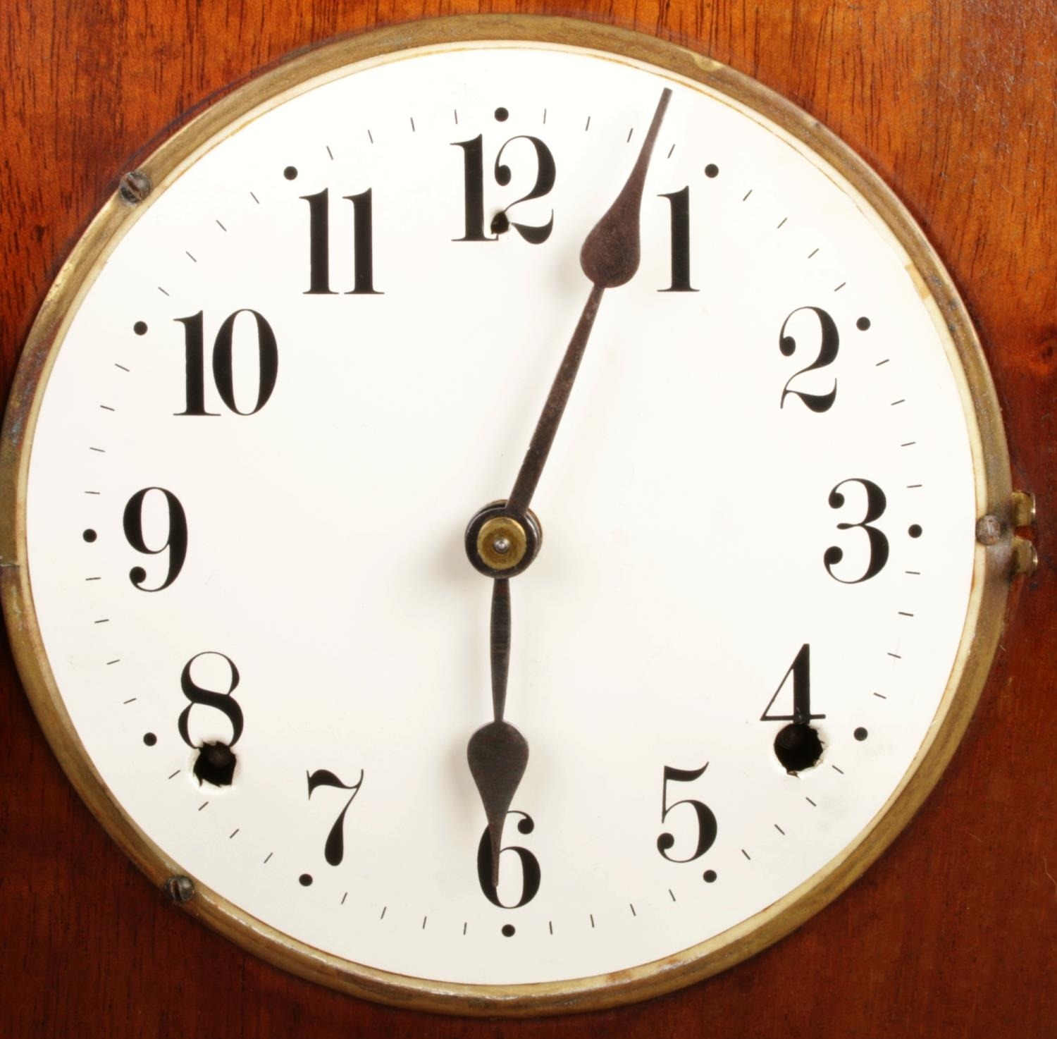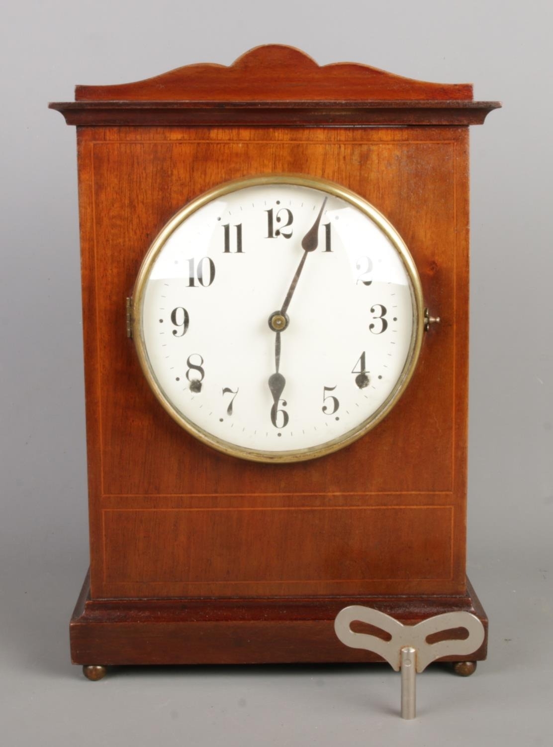 This mantel clock features a simple, possibly Arts & Crafts influenced design. The case is constructed of dark-stained wood and houses a round, white enamel clock face with black Arabic numerals and simple hands. The mechanical movement is visible through a rear access door. A winding key is included.
