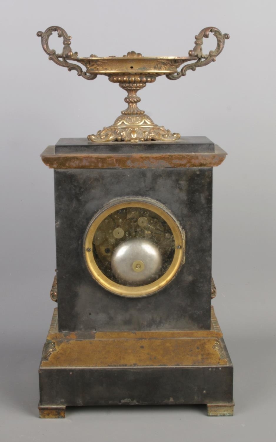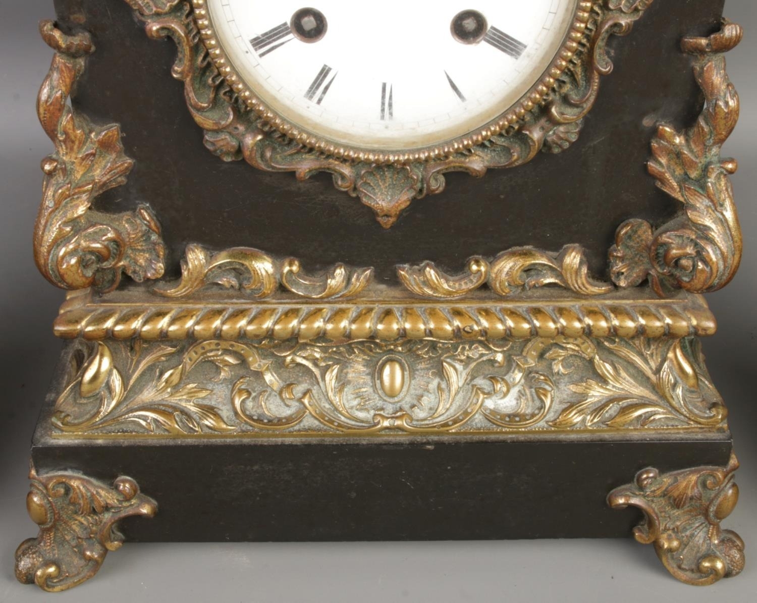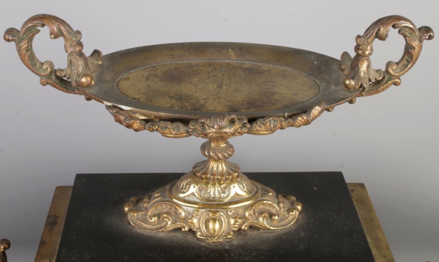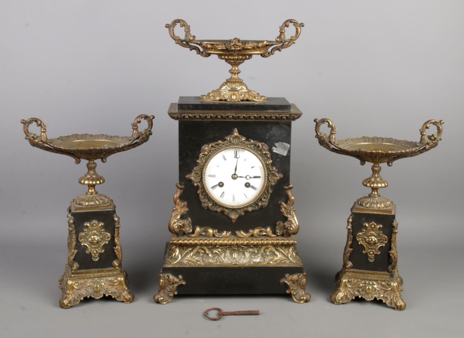 A mantel clock and a pair of matching ornate stands, likely dating to the 19th or early 20th century. The set features dark-colored marble or stone bases with applied gilt-bronze or brass mounts. The mounts exhibit rococo-influenced detailing, including scrolls, foliage, and shell motifs. The clock face has Roman numerals and is surrounded by a decorative gilt-bronze bezel. The clock’s movement is visible through an access panel on the back and bears the marking “W99671A”. The matching stands feature shallow, oval-shaped bowls with scrolled handles, raised on similarly decorated square bases. A small, possibly antique, key is included.