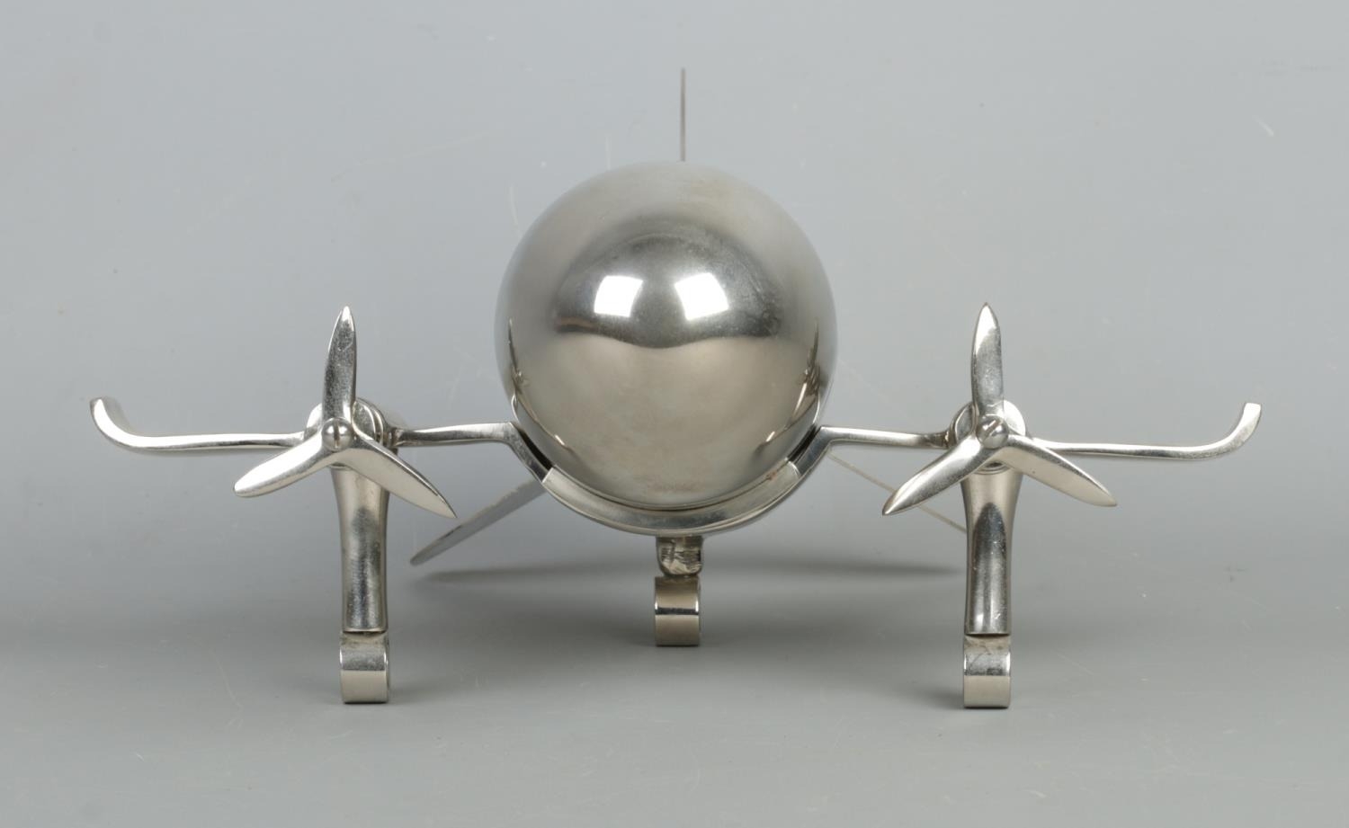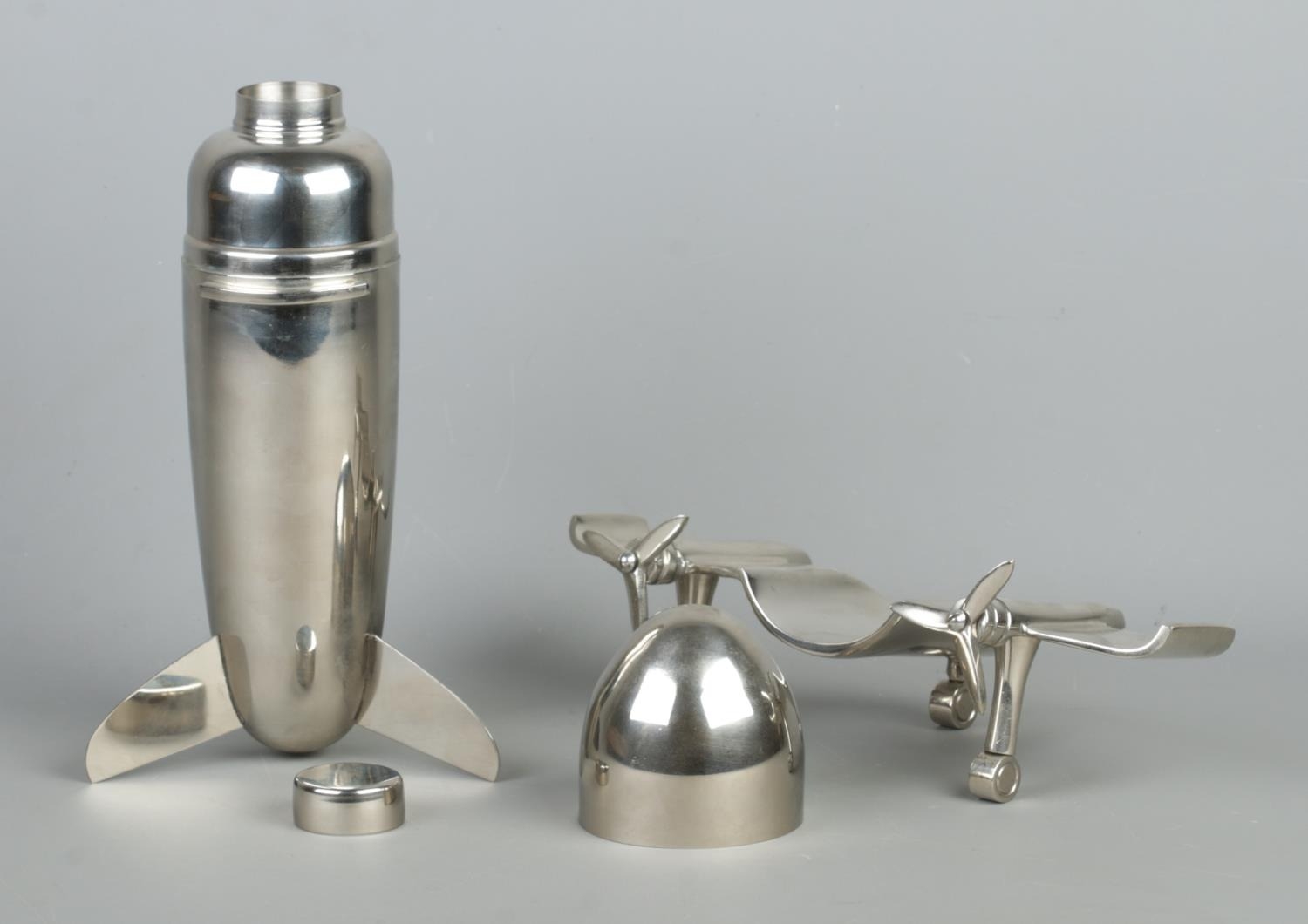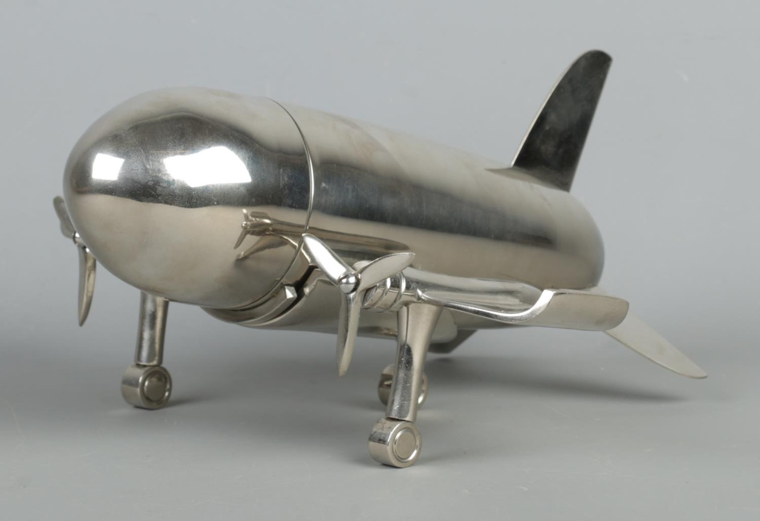 A mid-20th century cocktail shaker in the form of a stylized airplane. The shaker is composed of what appears to be polished stainless steel or a similar metal. It consists of a cylindrical body and a removable dome-shaped top. The airplane design incorporates wings, a tail, propellers, and small wheels on the landing gear.