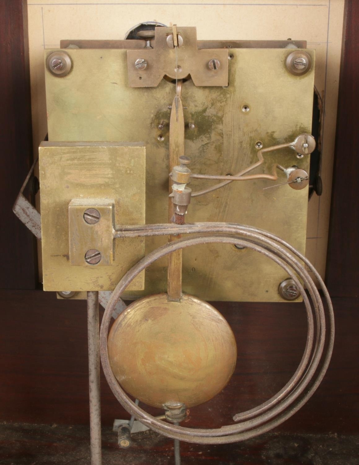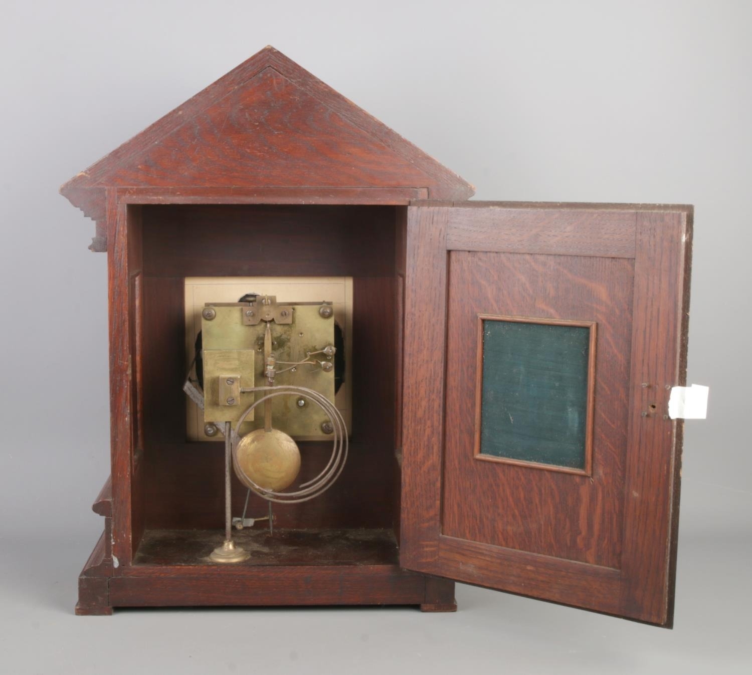 A late 19th or early 20th-century mantel clock featuring a dark reddish-brown wooden case with carved detailing. The case has a pediment top with a simulated shingled roof design and carved floral motifs. Fluted columns flank the brass-framed clock face, which has Roman numerals and is marked “ARNOLD ADDISCOMBE.” The clock mechanism is visible through an access door on the back of the case and includes a brass pendulum and bell. A separate winding key is included.