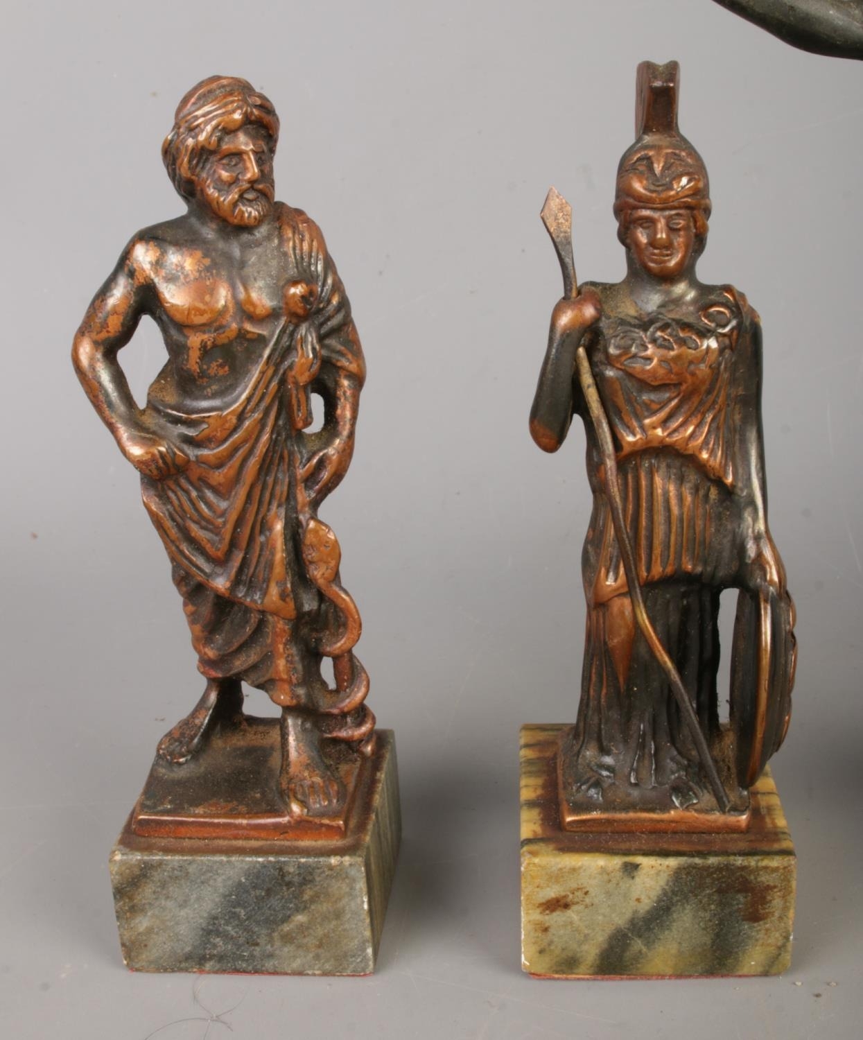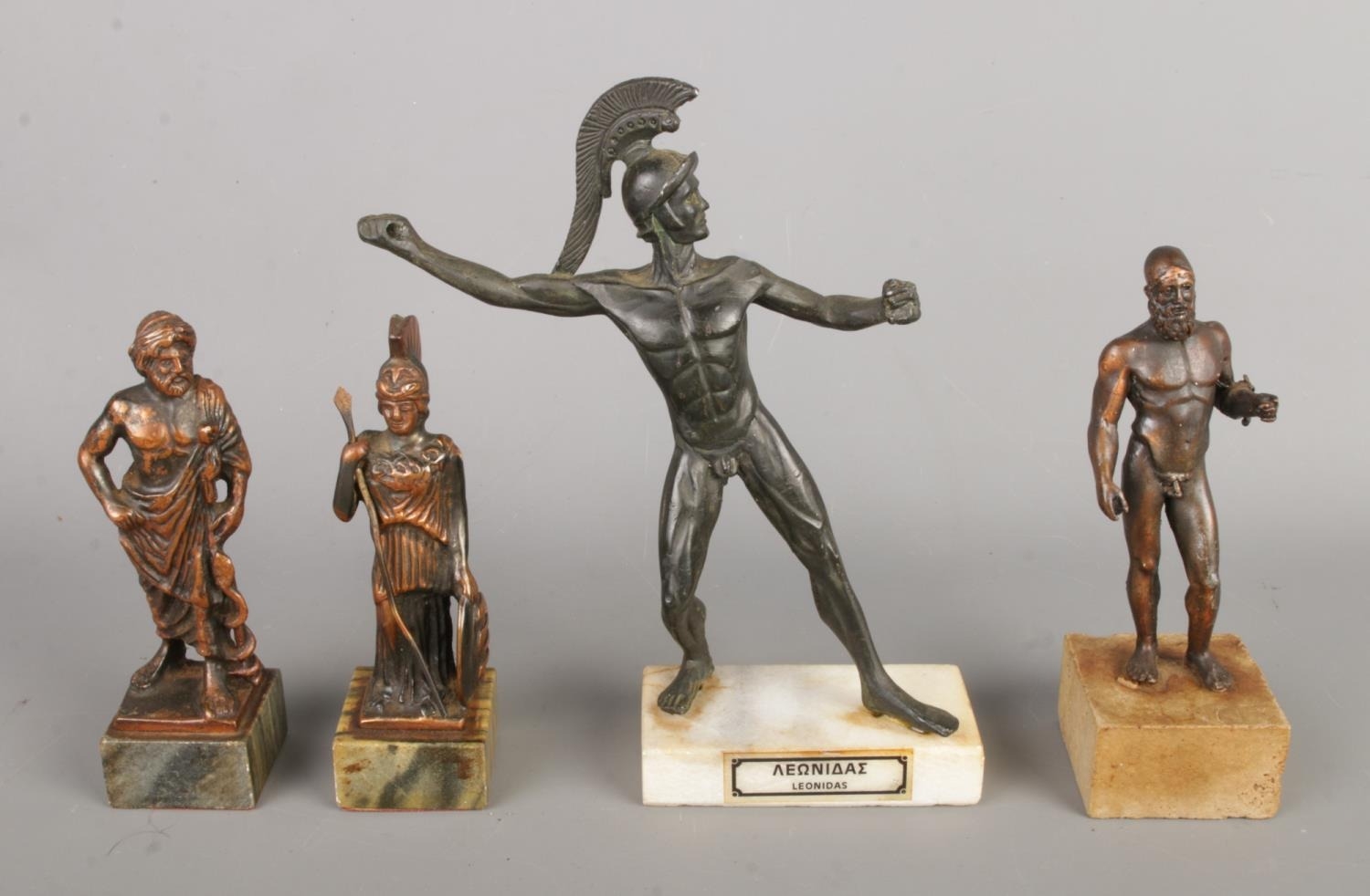 Four bronze or bronze alloy figures, mounted on marble bases, depicting figures from classical Greek mythology or history. Three male figures, one female. One male figure is inscribed “ΛΕΩΝΙΔΑΣ” (Leonidas) on its base. The figures exhibit a dark patina consistent with age and/or intentional antiquing. Some surface wear and discoloration are visible. Further analysis is required to determine the exact composition of the metal.
