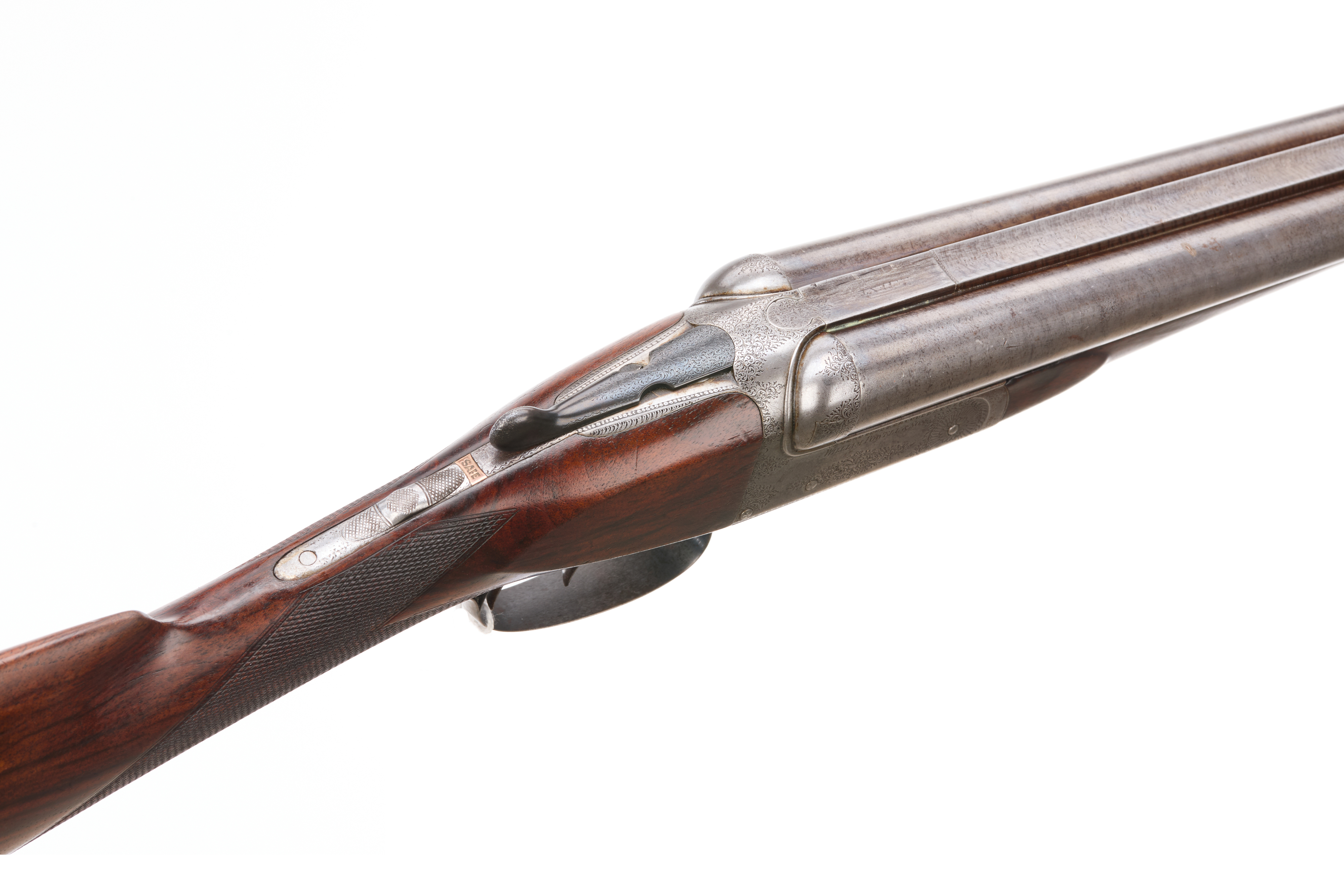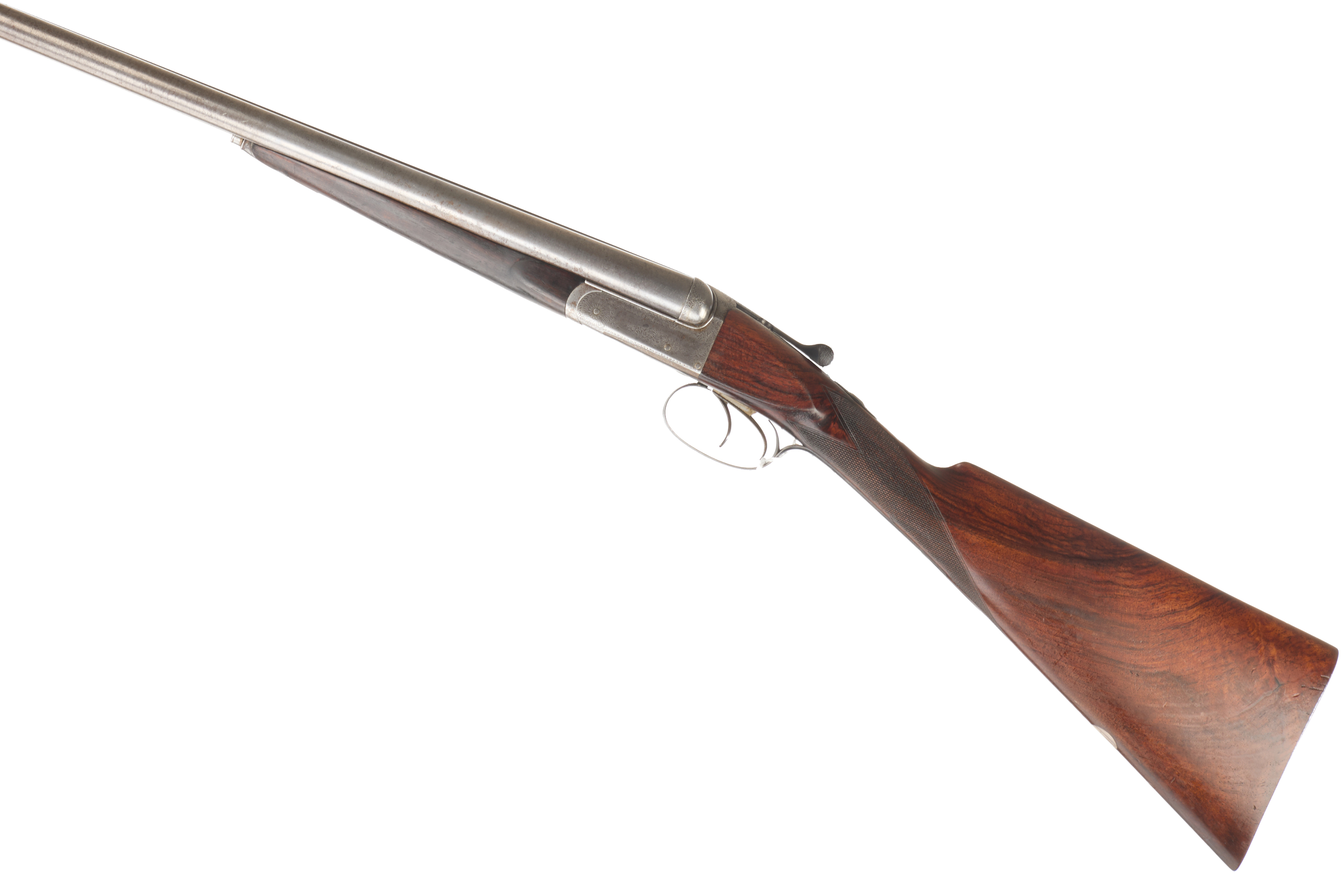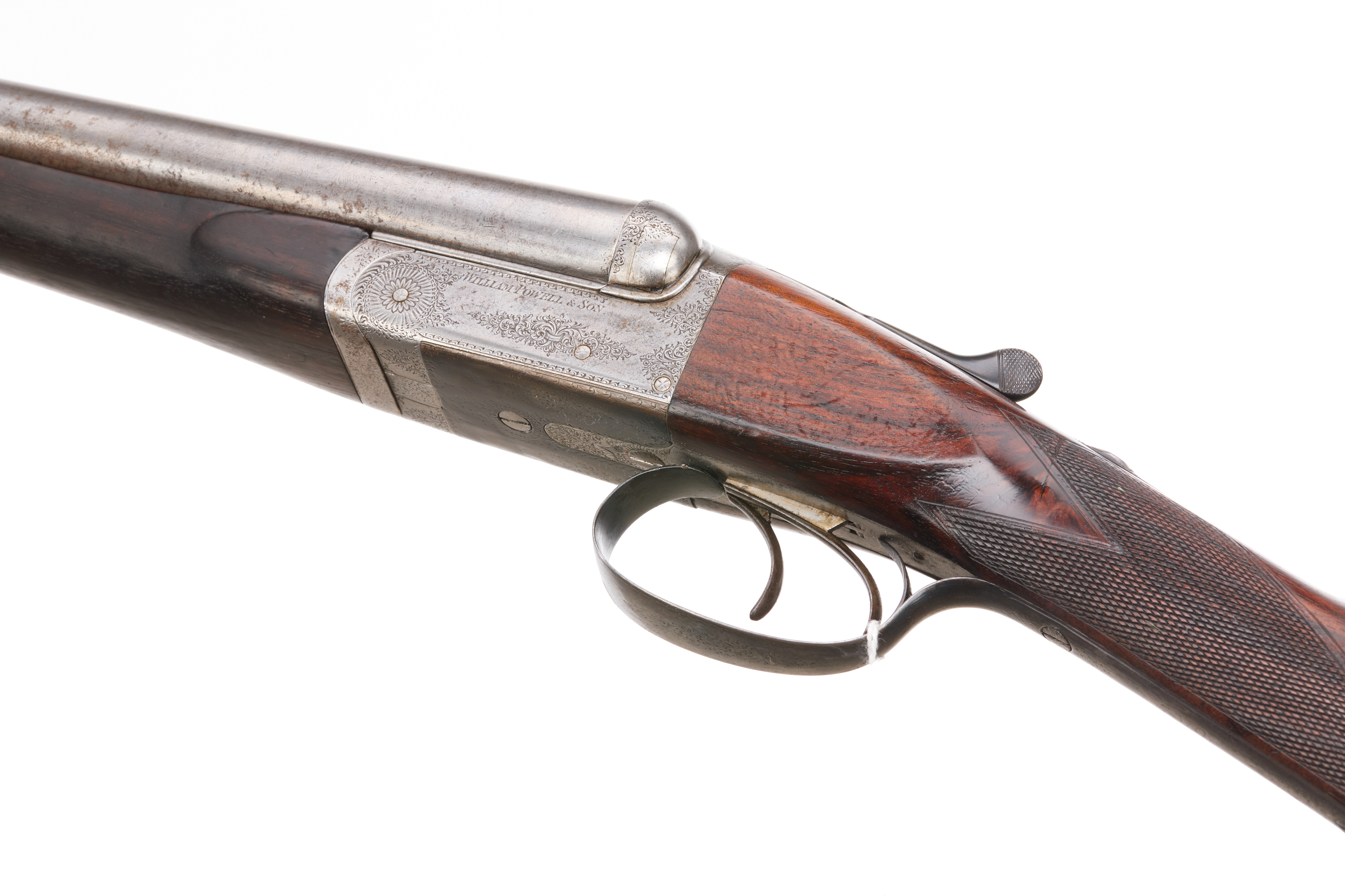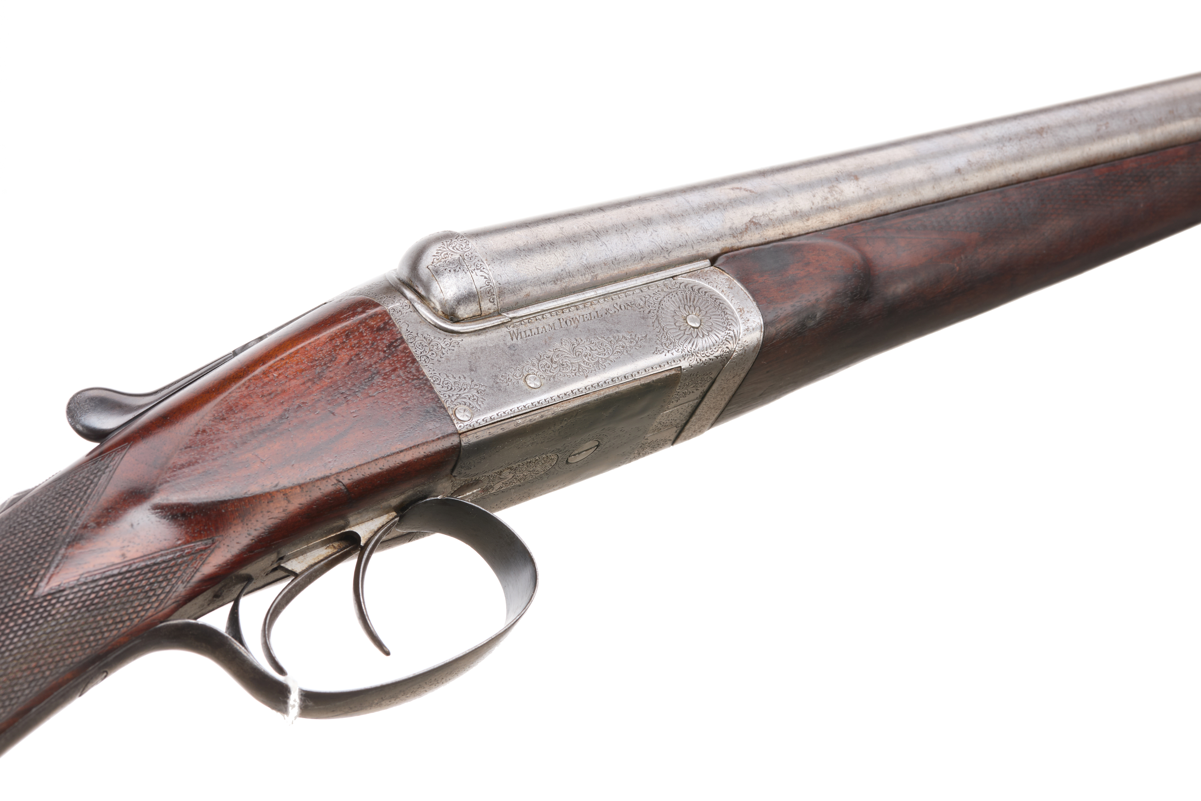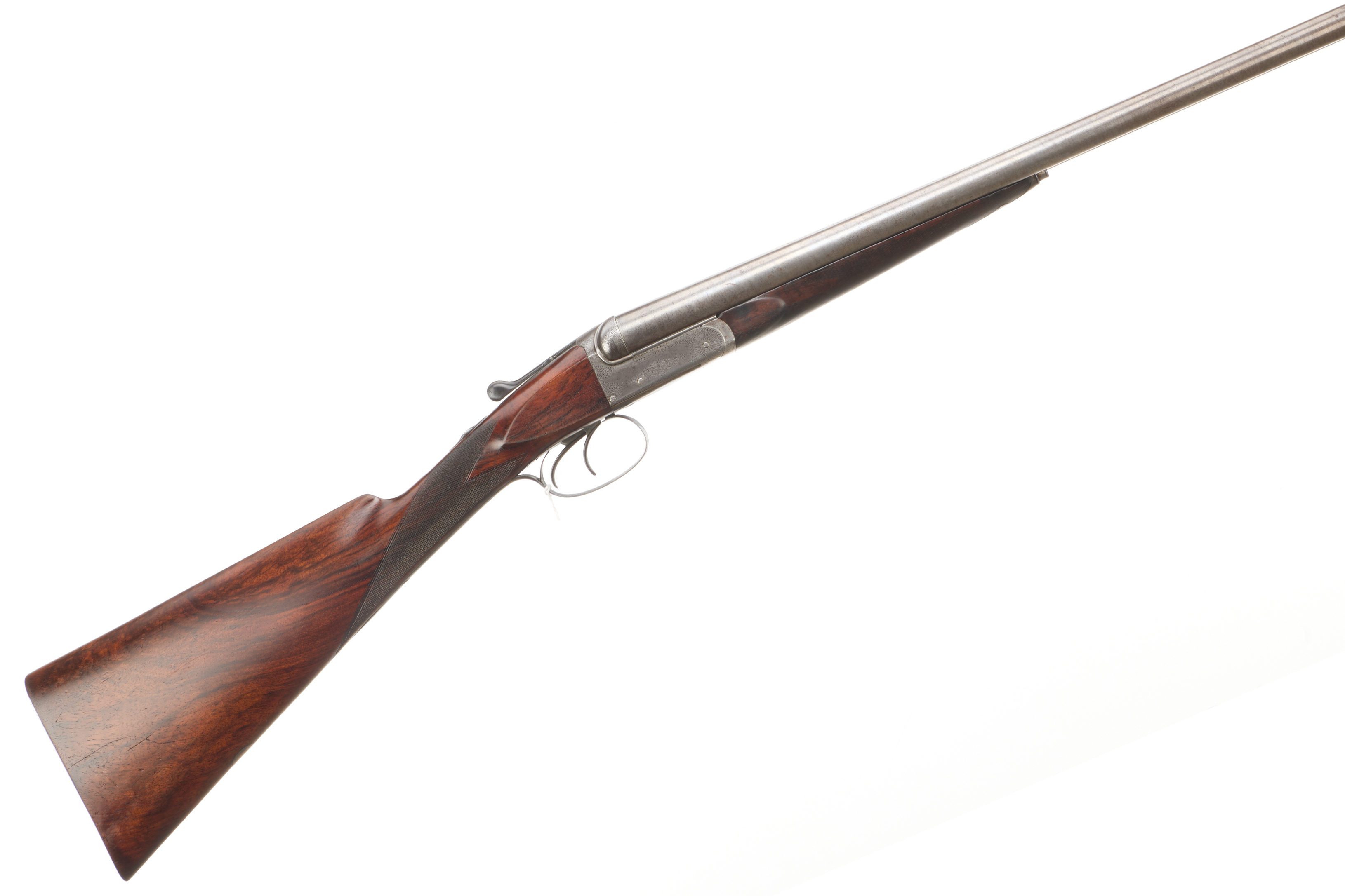 A hammerless side-by-side double-barreled shotgun, dating from the late 19th to early 20th century. The firearm features a dark-grained wooden stock and forend, both with checkered panels. Metal components include two parallel barrels, an engraved receiver, and a double-trigger mechanism with a trigger guard. The receiver is clearly inscribed “WILLIAM TRYON & SON” above “260 BROADWAY N.Y.”