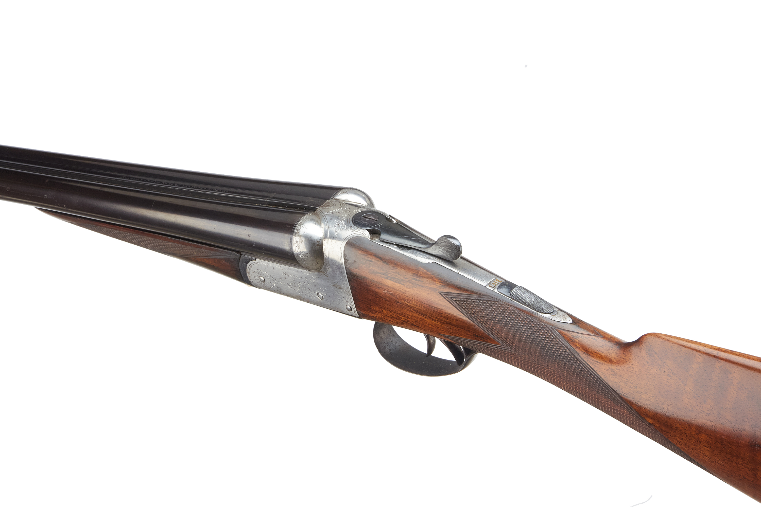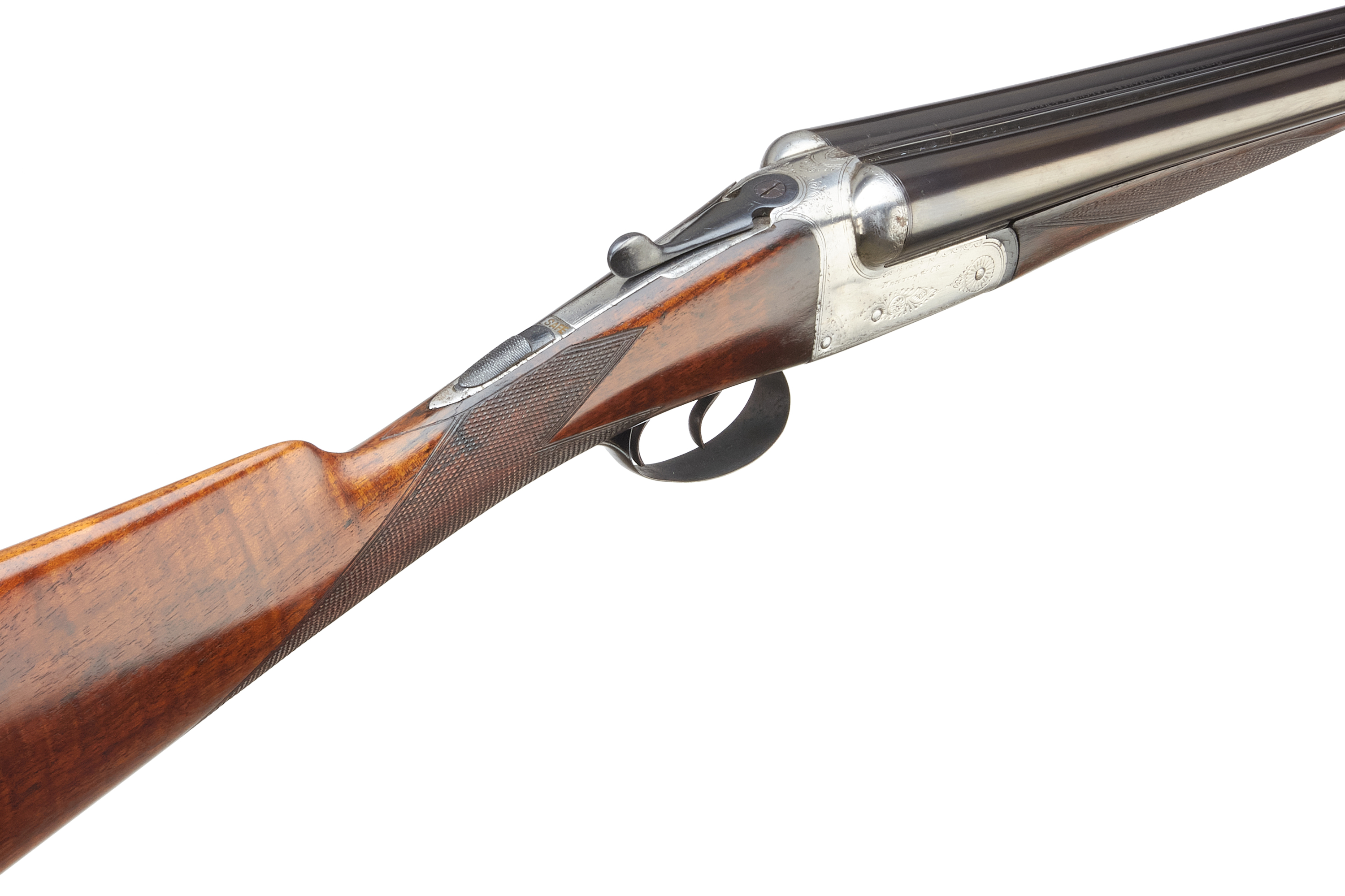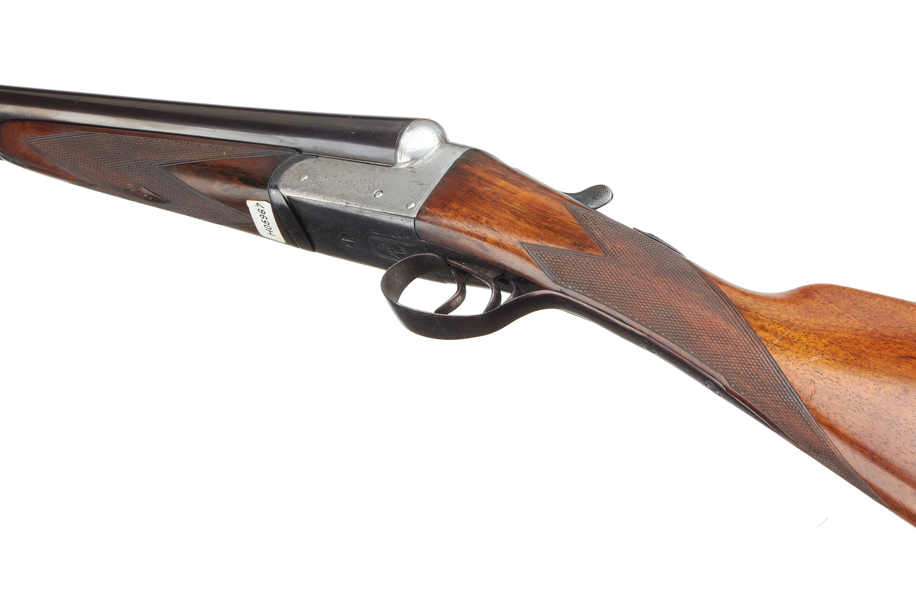 A side-by-side double-barreled break-action shotgun. Comprising dark blued steel barrels, a brightly finished metal receiver exhibiting subtle scroll engraving, and a rich brown wooden stock and forend. Both the stock and forend feature finely checkered grip areas. A white tag with the marking “H89867” is present on the underside of the forend. The object presents as a classic sporting firearm.
