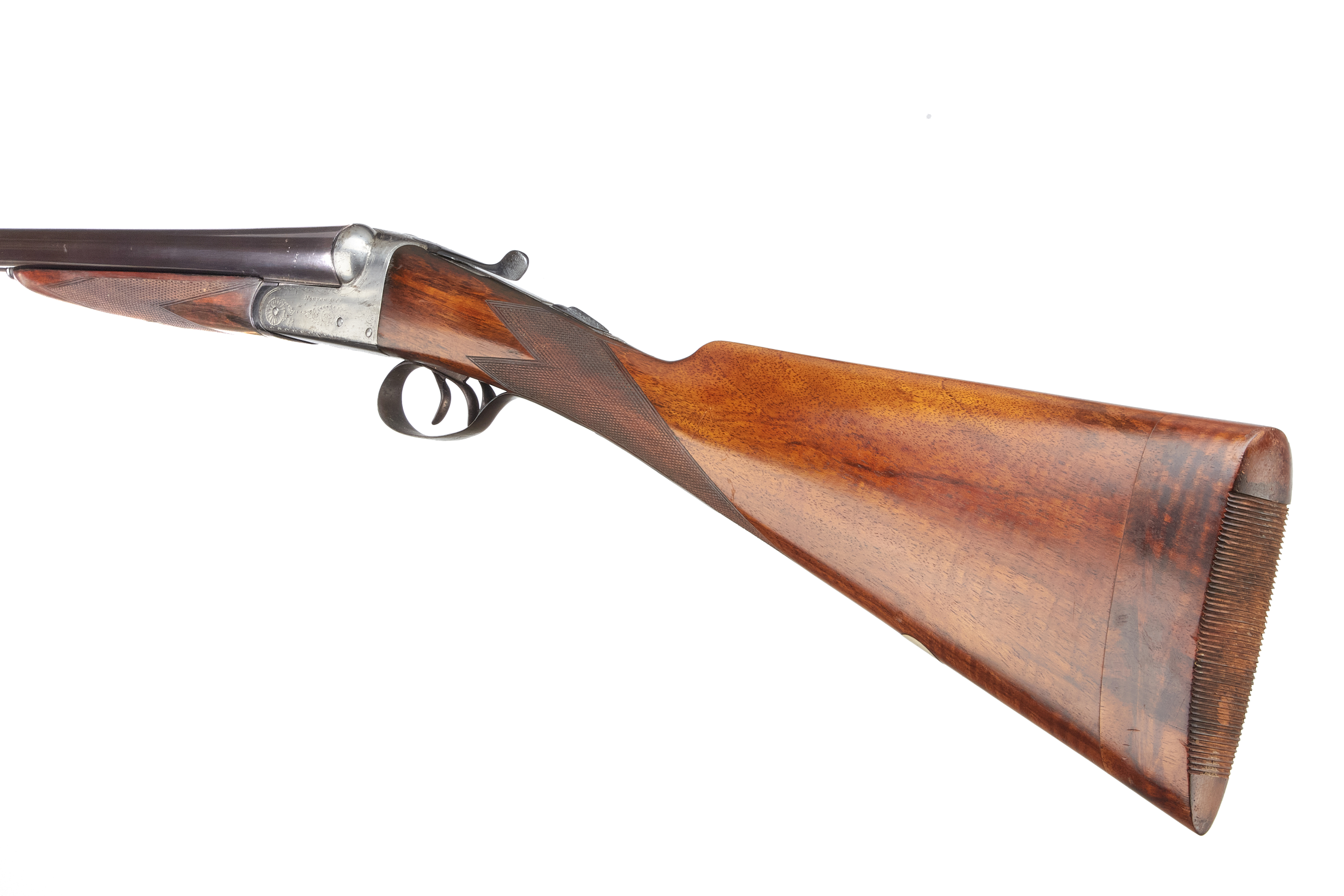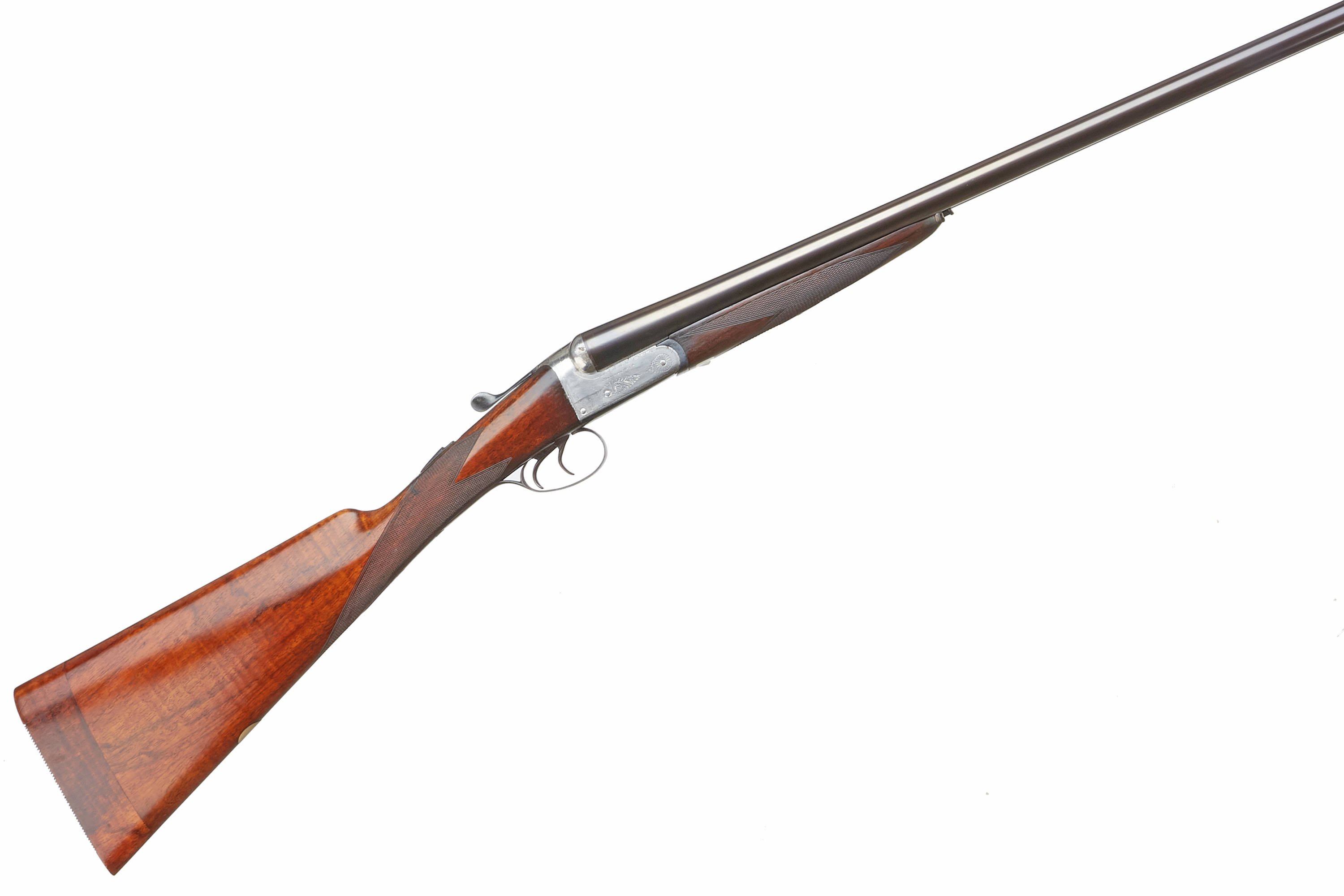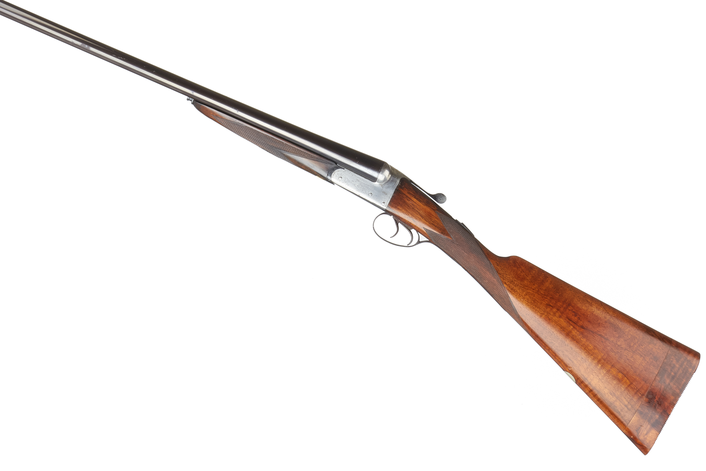 A side-by-side double-barreled break-action shotgun. Comprising dark blued steel barrels, a brightly finished metal receiver exhibiting subtle scroll engraving, and a rich brown wooden stock and forend. Both the stock and forend feature finely checkered grip areas. A white tag with the marking “H89867” is present on the underside of the forend. The object presents as a classic sporting firearm.